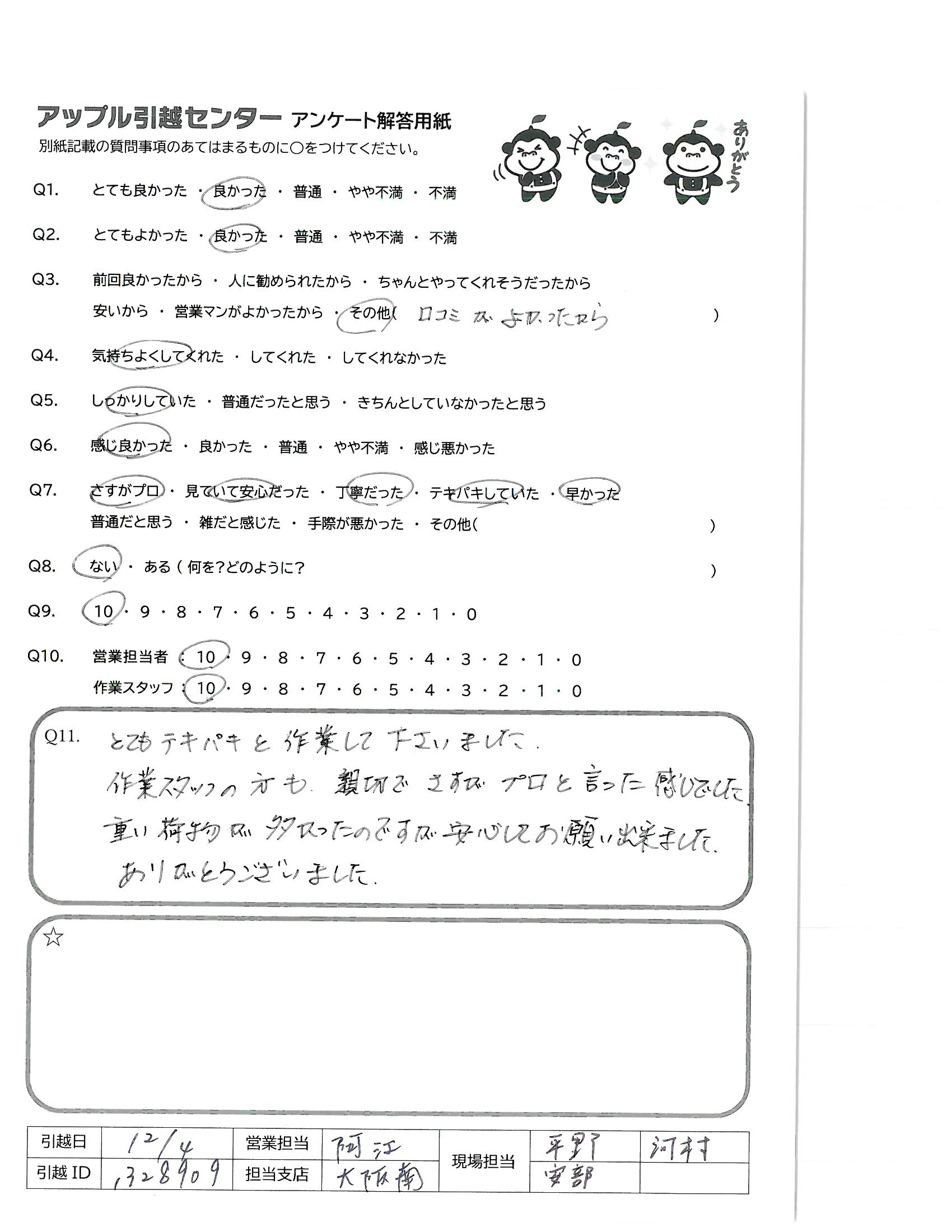 引越し日:2021年12月04日 エリア:大阪府大阪市平野区