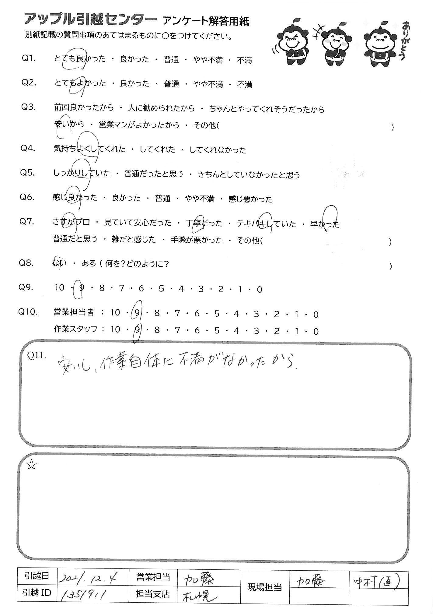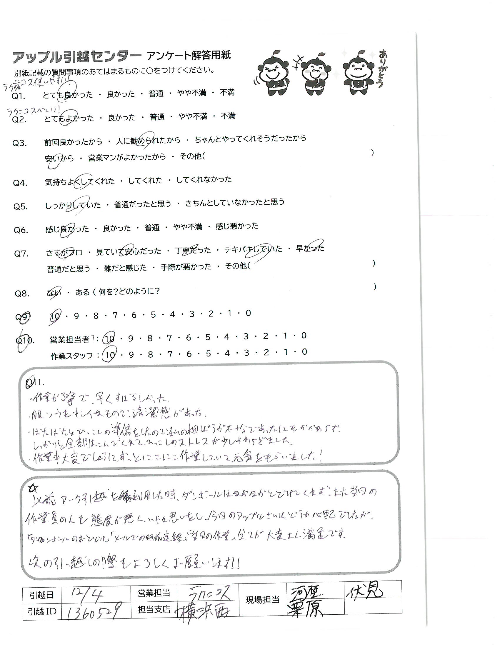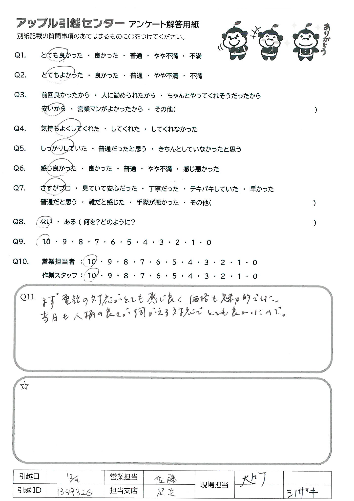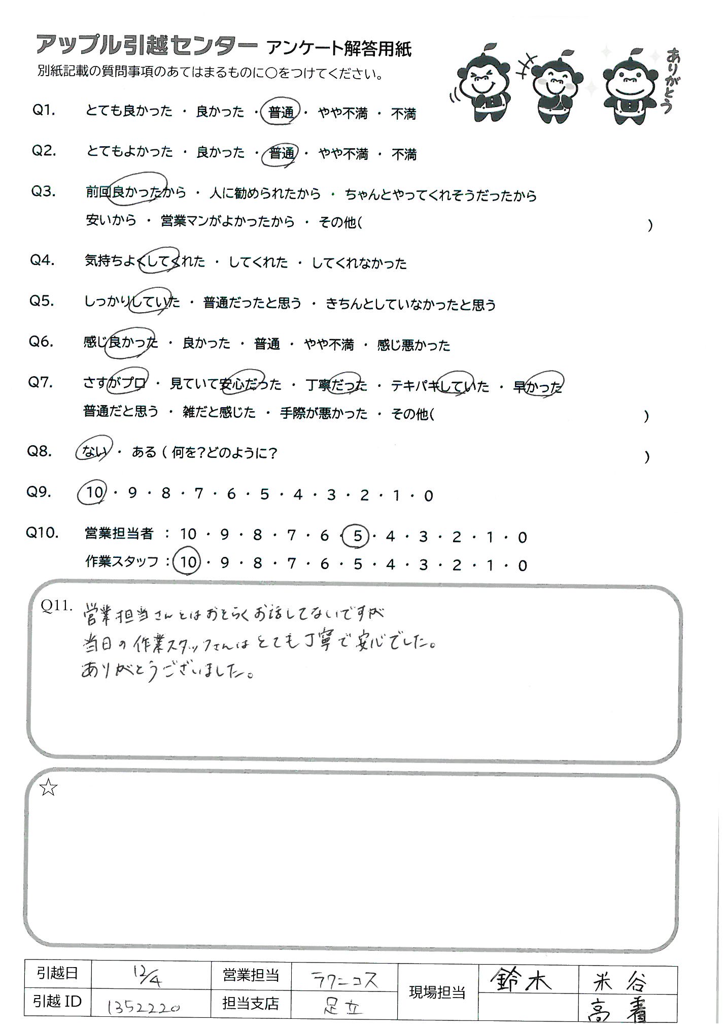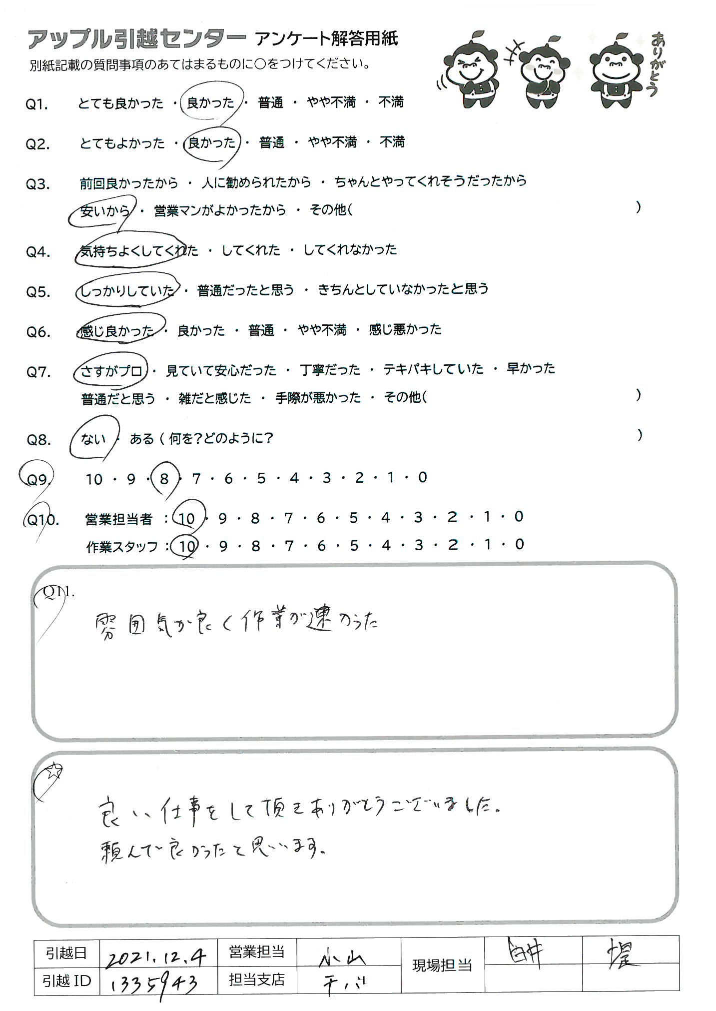 A.・作業が丁寧で、早くすばらしかった ・服ソウもキレイなもので、清潔感があった。 ・ばたばたとひっこしの準備をしたので私の梱ぽうが不十分であったにもかかわらず、 しっかりと全部はこんでくれて、ひっこしのストレスが少しやわらぎました。 ・作業中大変でしょうに、ずっとにこにこ作業していて、元気をもらいました!