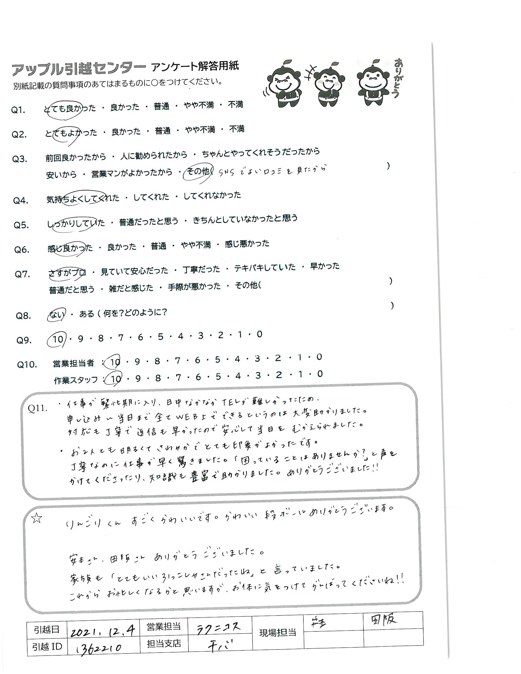 A.りんごりくんすごくかわいいです。かわいい段ボールありがとうございます。 安本さん、田阪さんありがとうございました。 家族も「とてもいい引っこしやさんだったね」と言っていました。 これからお忙しくなるかと思いますが、お体に気をつけてがんばってくださいね!!