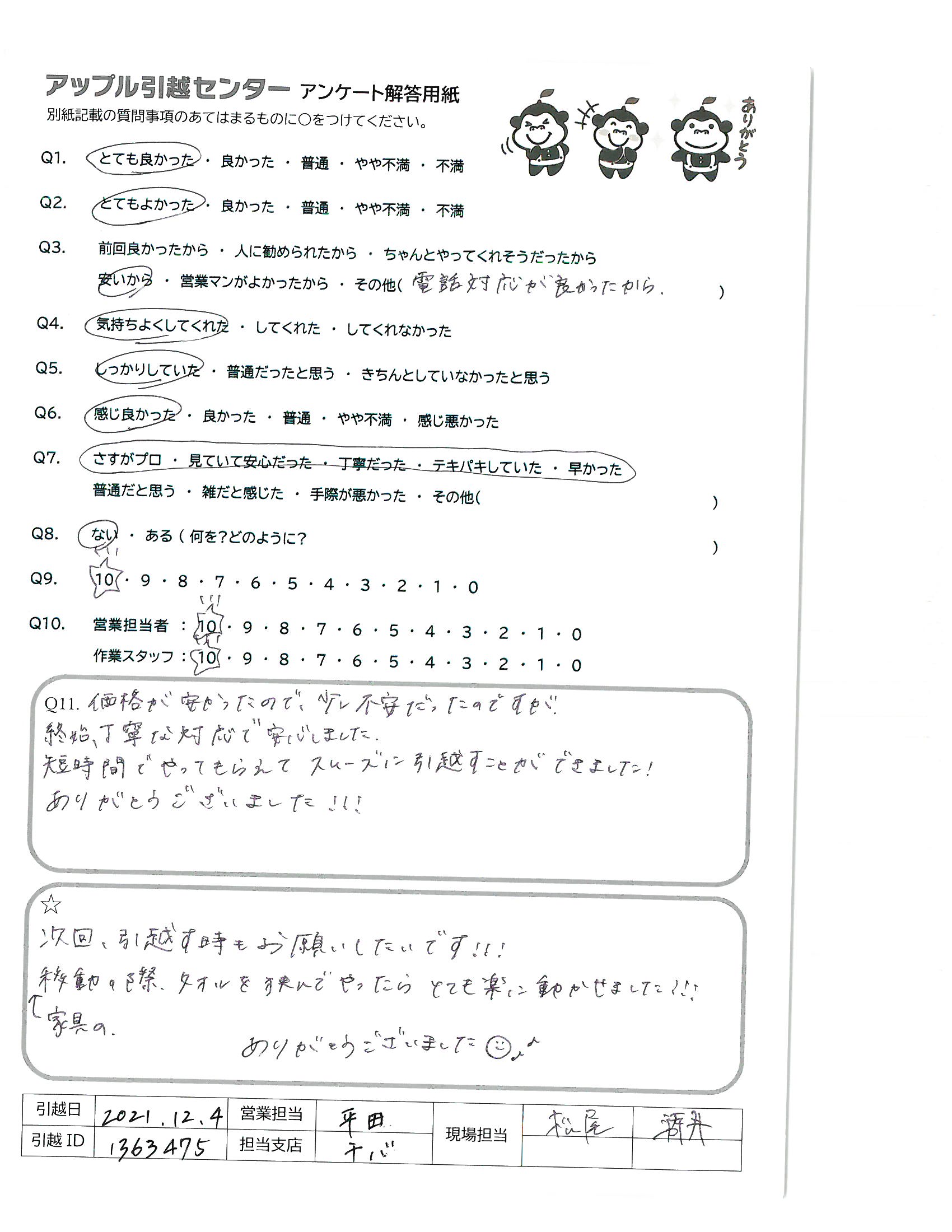 引越し日:2021年12月04日 エリア:千葉県船橋市