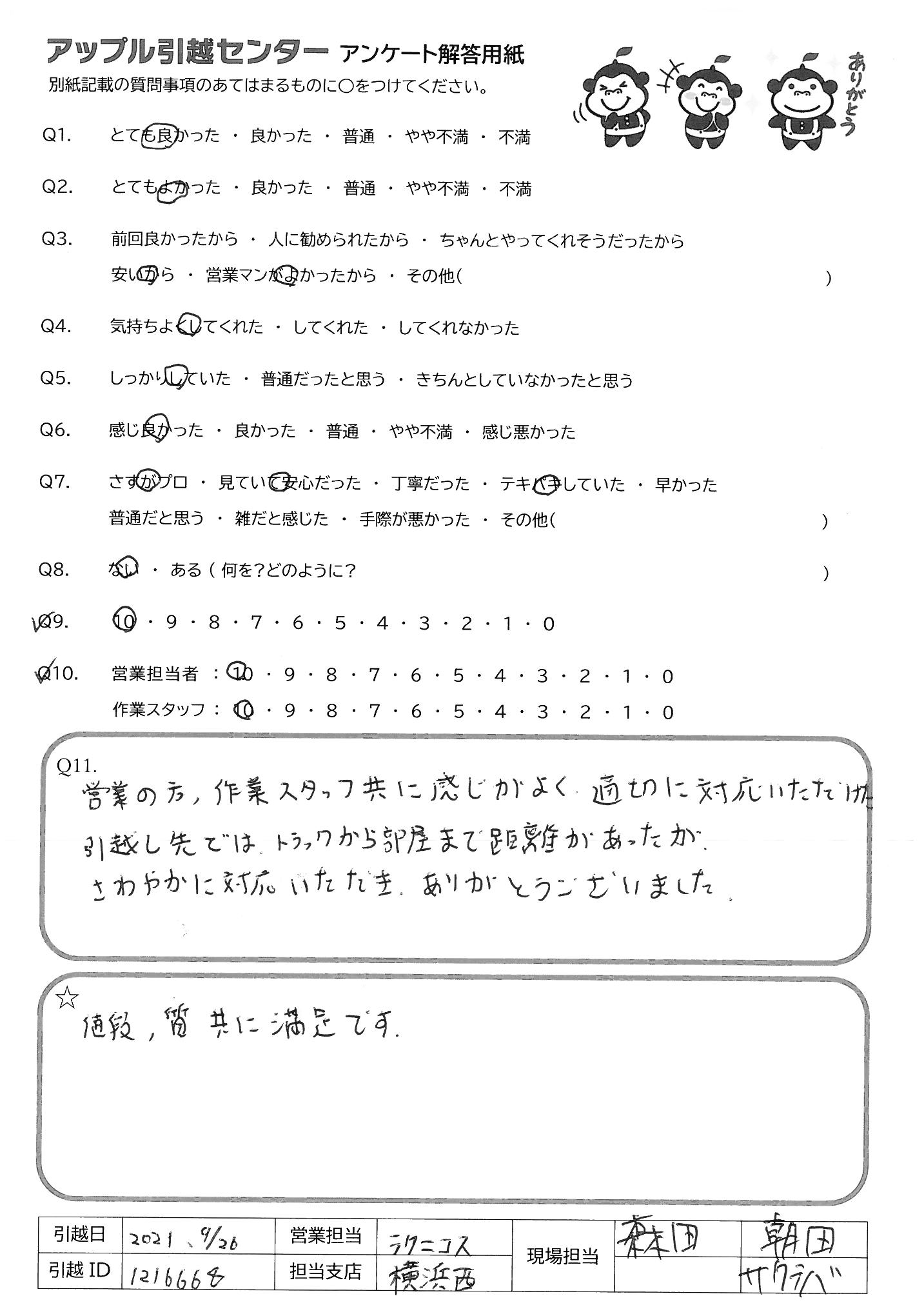 A.営業の方、作業スタッフ共に感じがよく、適切に対応いただけた。 引越し先では、トラックから部屋まで距離があったが、さわやかに対応いただき、ありがとうございました。