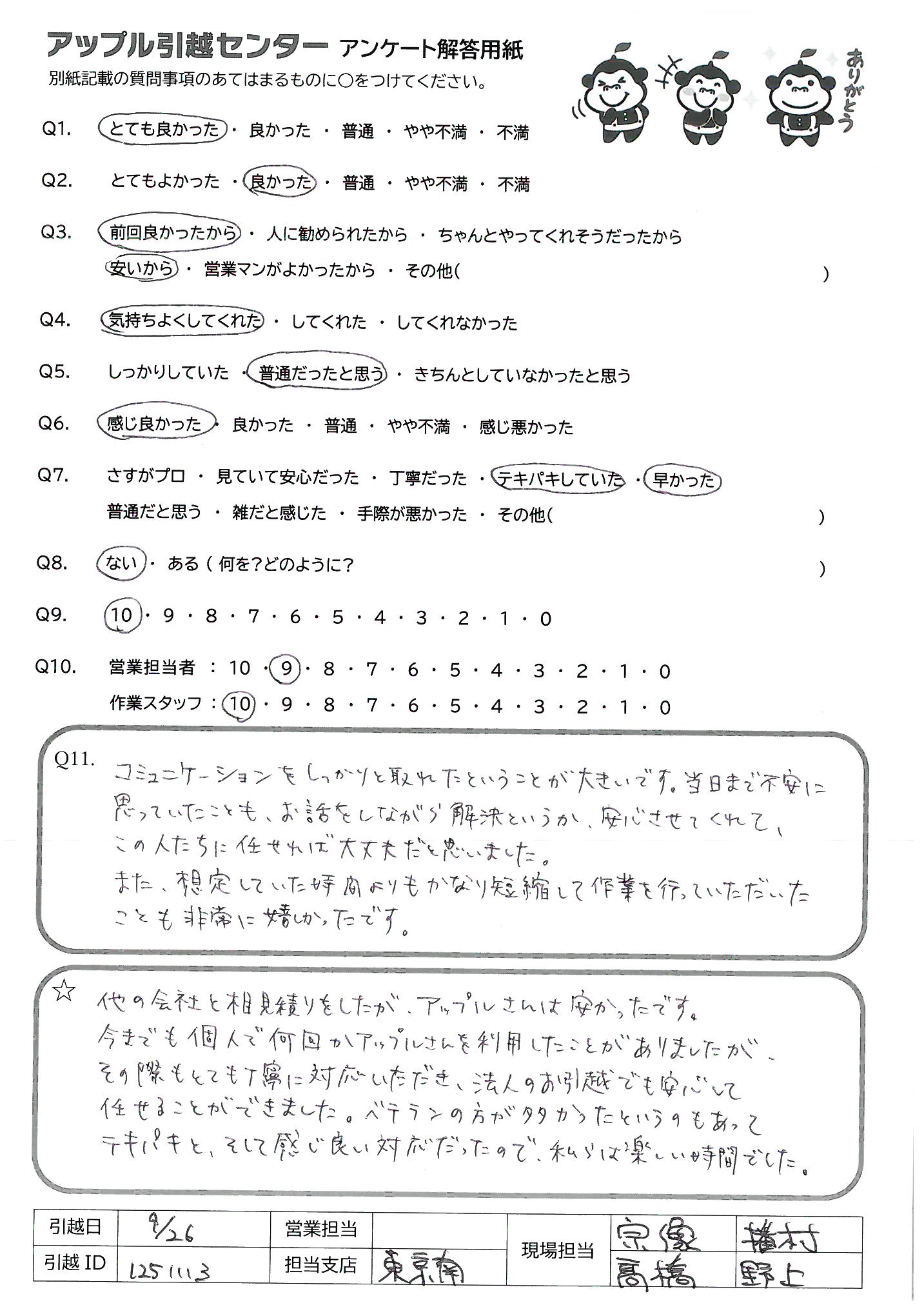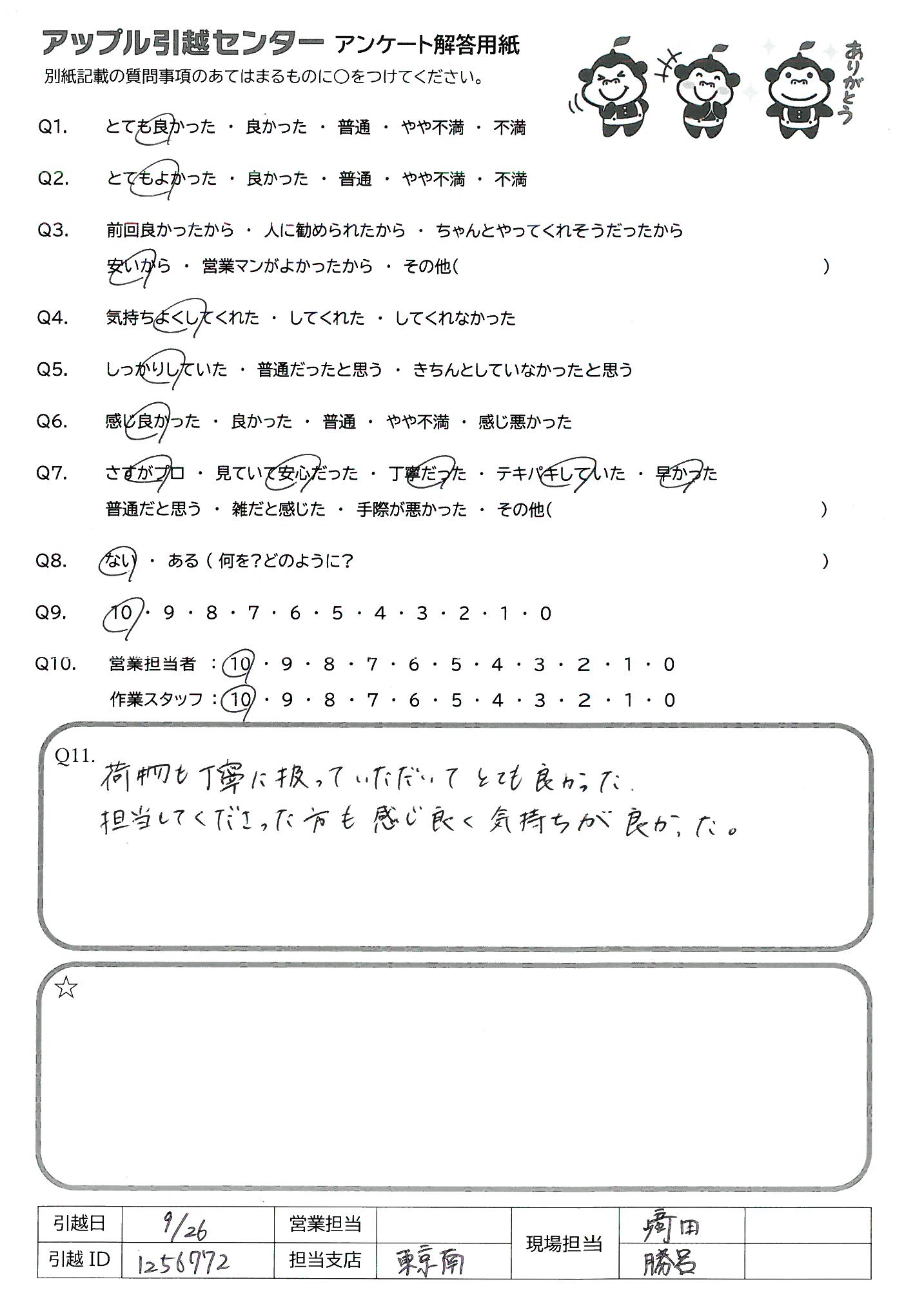 A.とても感じがよく、テキパキと作業していただき気持ちよく引越しができました。ありがとうございました。