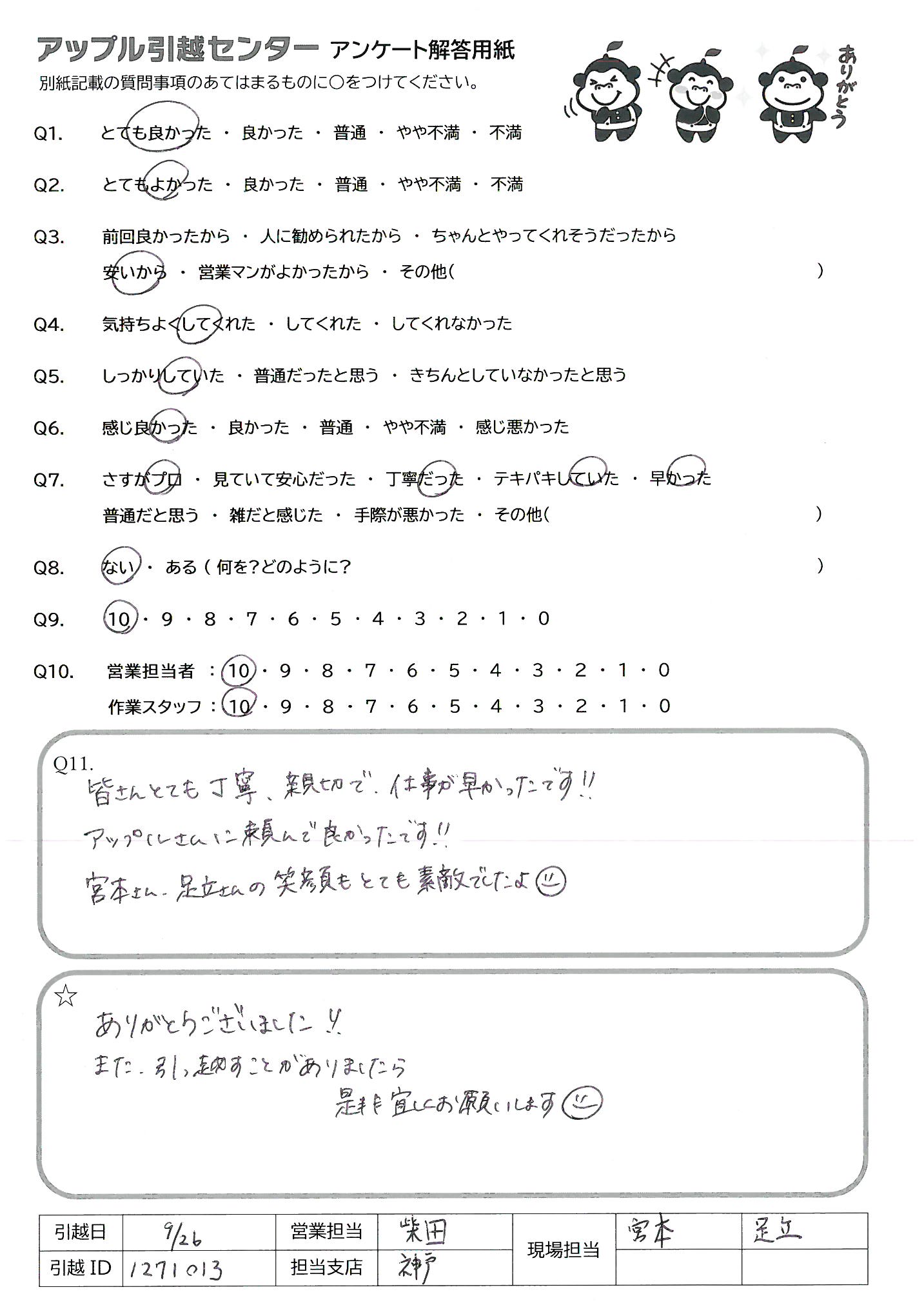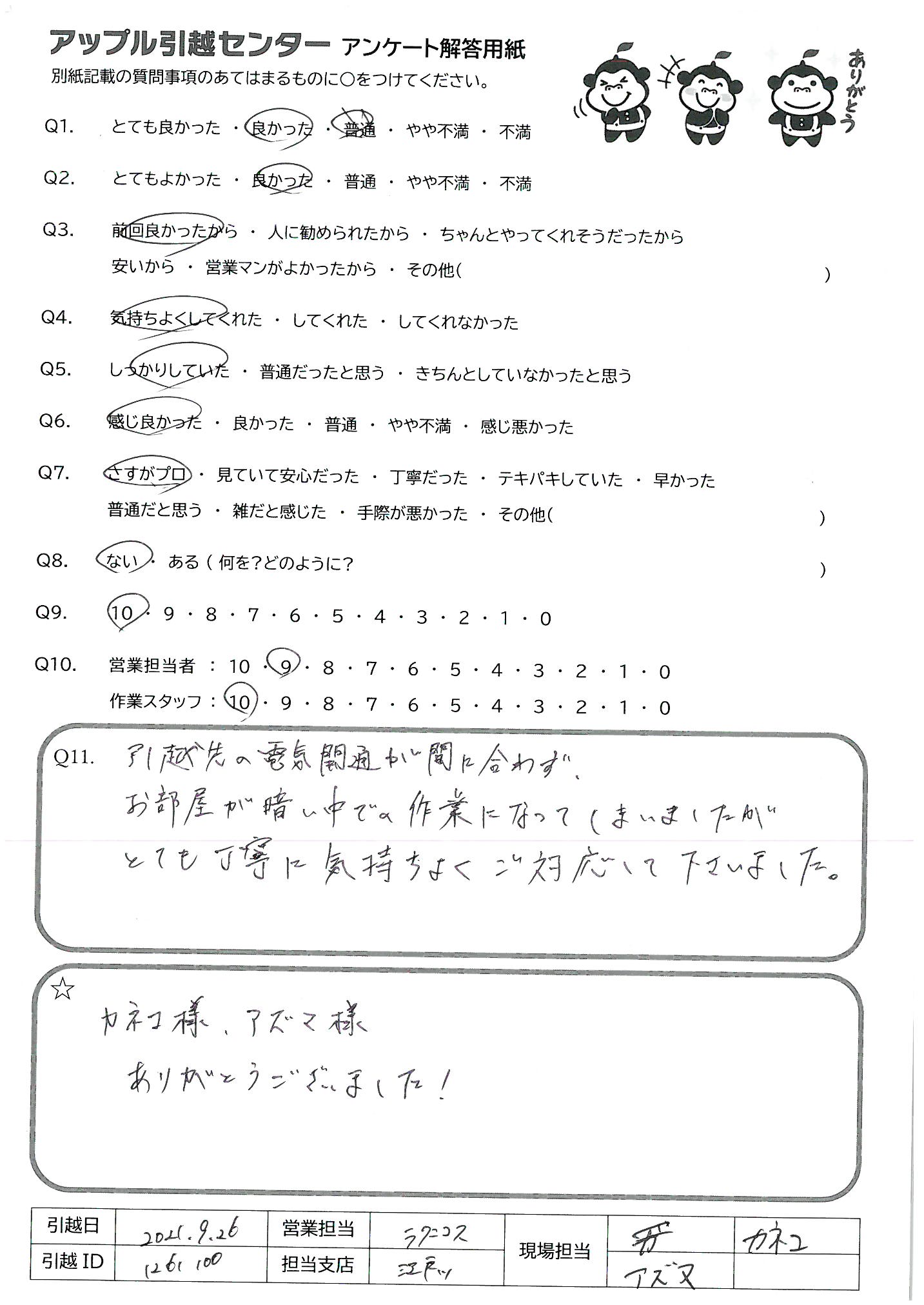 A.皆さんとても丁寧、親切で、仕事が早かったです!! アップルさんに頼んで良かったです!! 宮本さん、足立さんの笑顔もとても素敵でしたよ