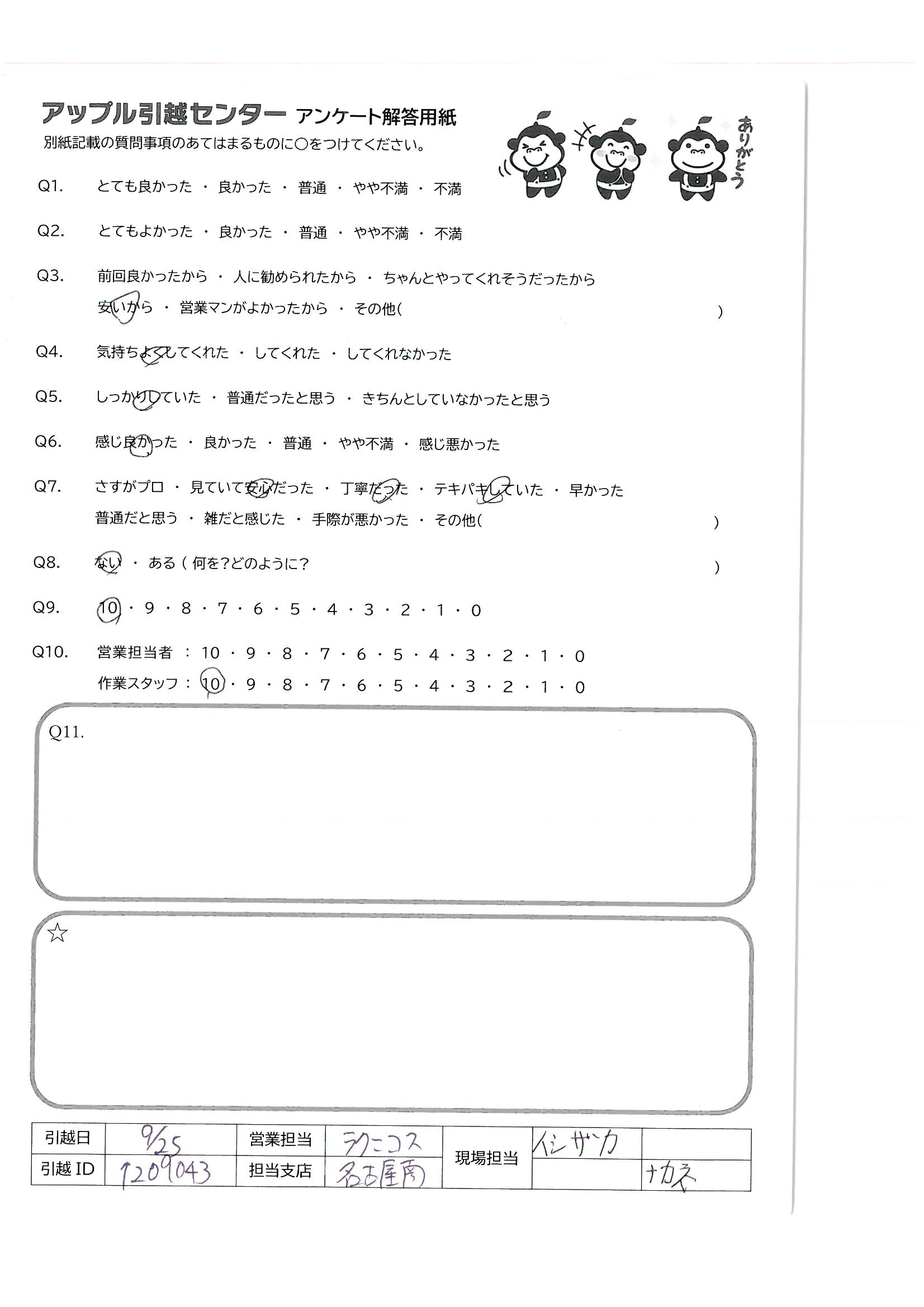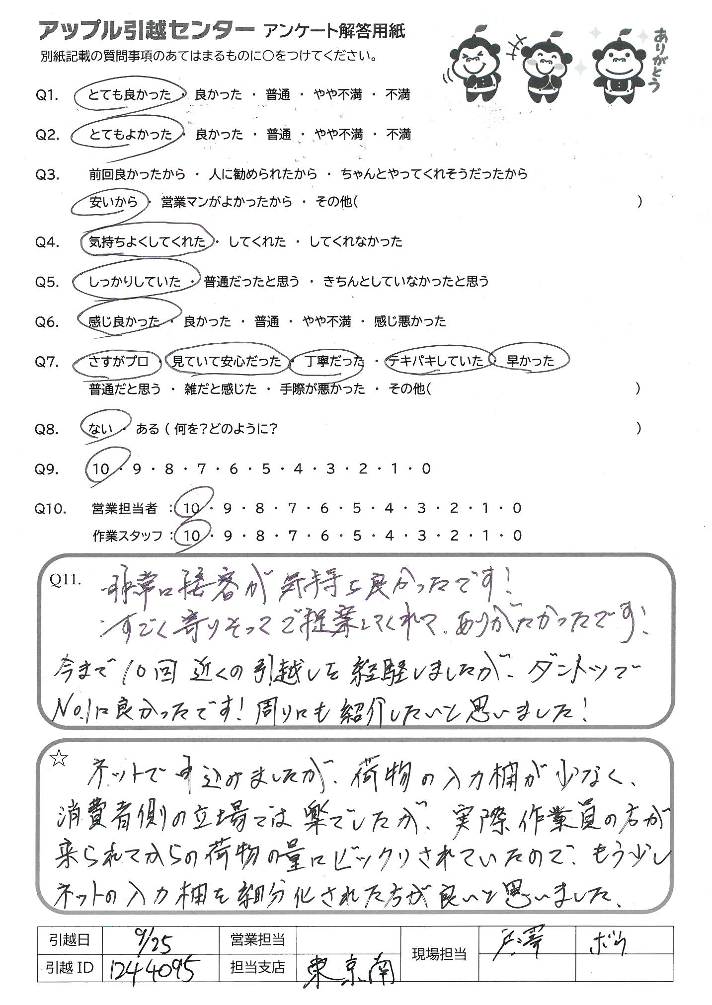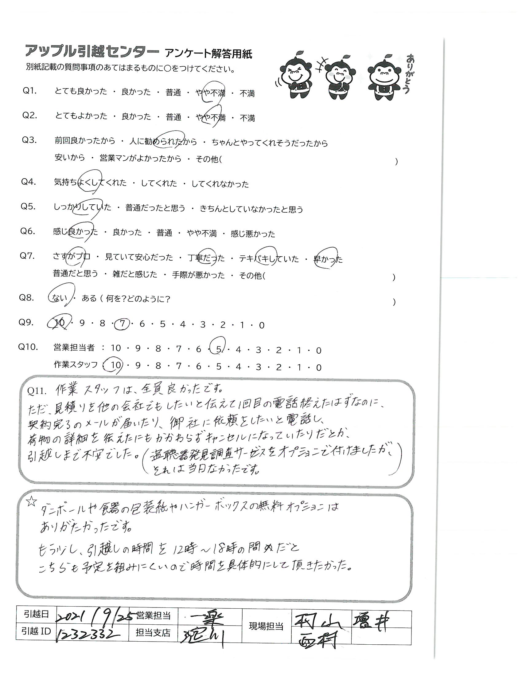 A.非常に接客が気持ち良かったです! すごく寄りそってご提案してくれて、ありがたかったです! 今まで10回近くの引越しを経験しましたが、ダントツでNo.1に良かったです!周りにも紹介したいと思いました!