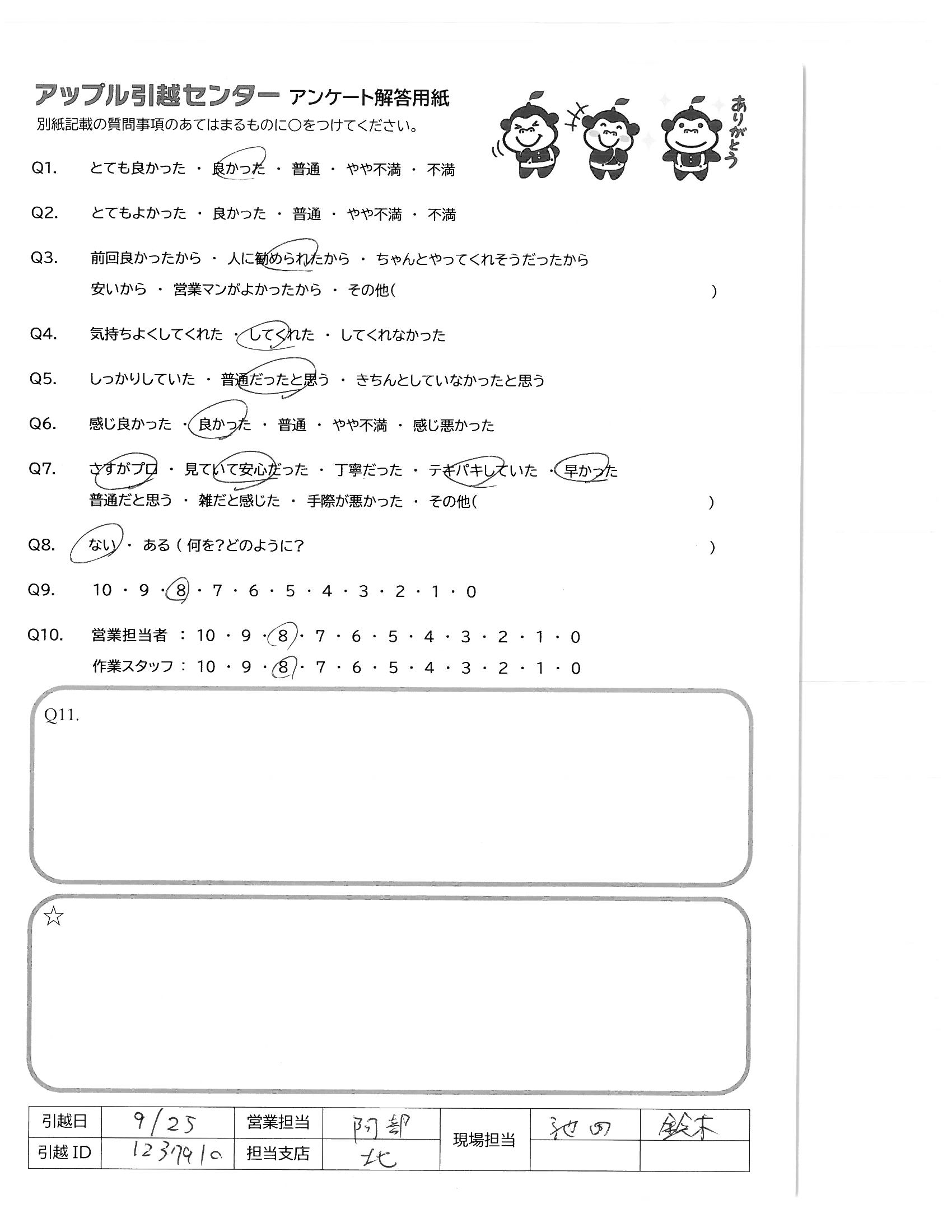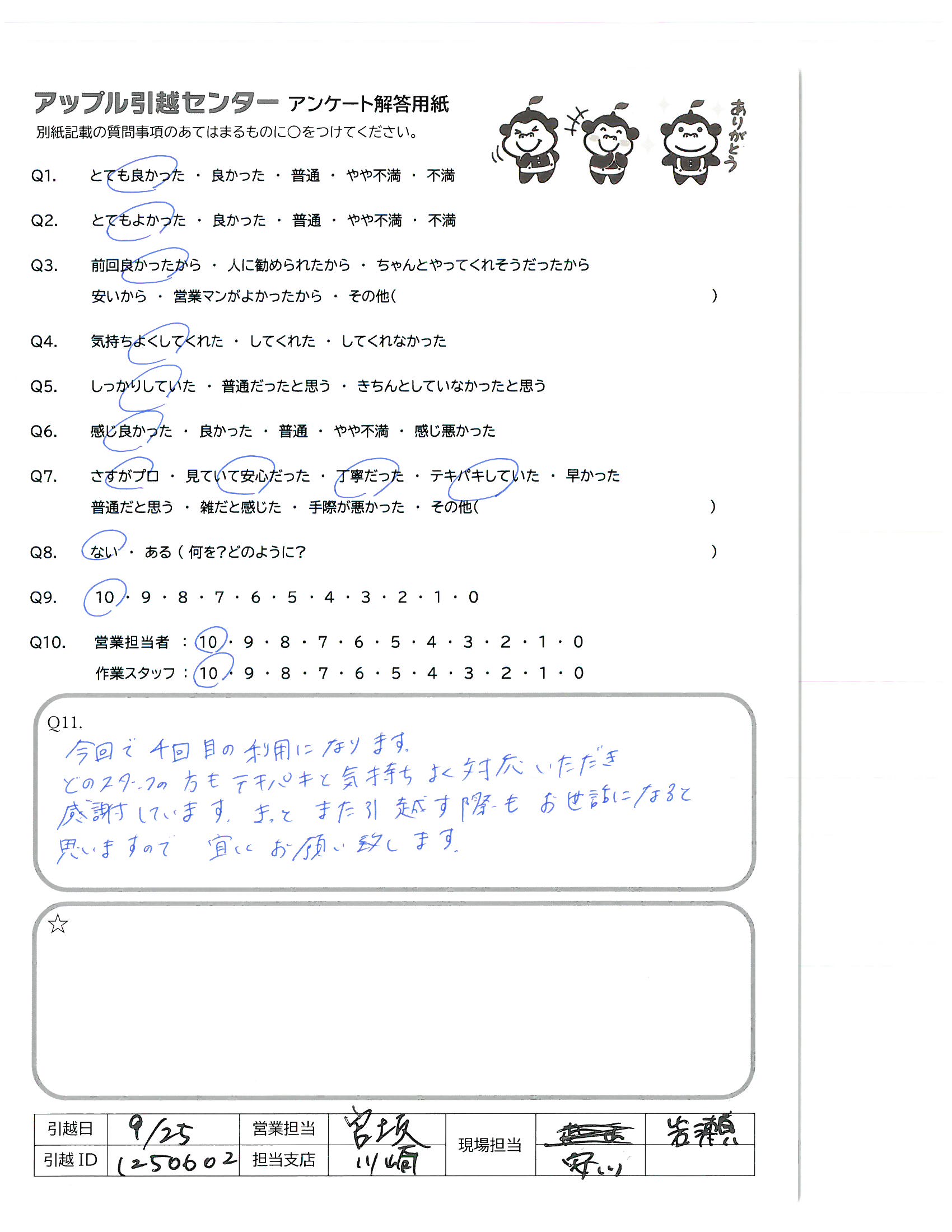 A.今回で4回目の利用になります。 どのスタッフの方もテキパキと気持ちよく対応いただき 感謝しています。きっとまた引越す際もお世話になると思いますので宜しくお願い致します。