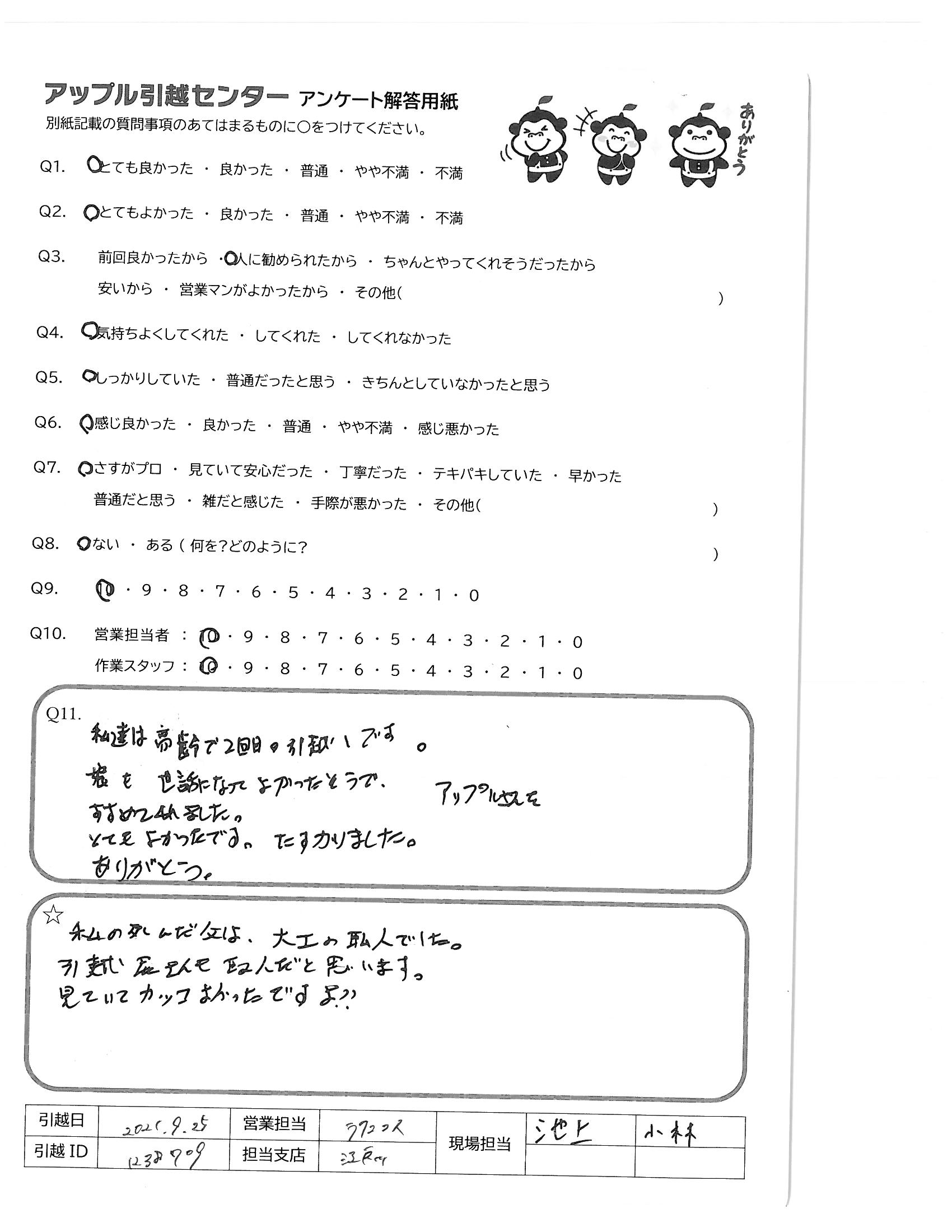 A.私達は高齢で2回目の引越しです。 娘も世話になってよかったそうで、アップルさんをすすめてくれました。 とてもよかったです。たすかりました。 ありがとう。