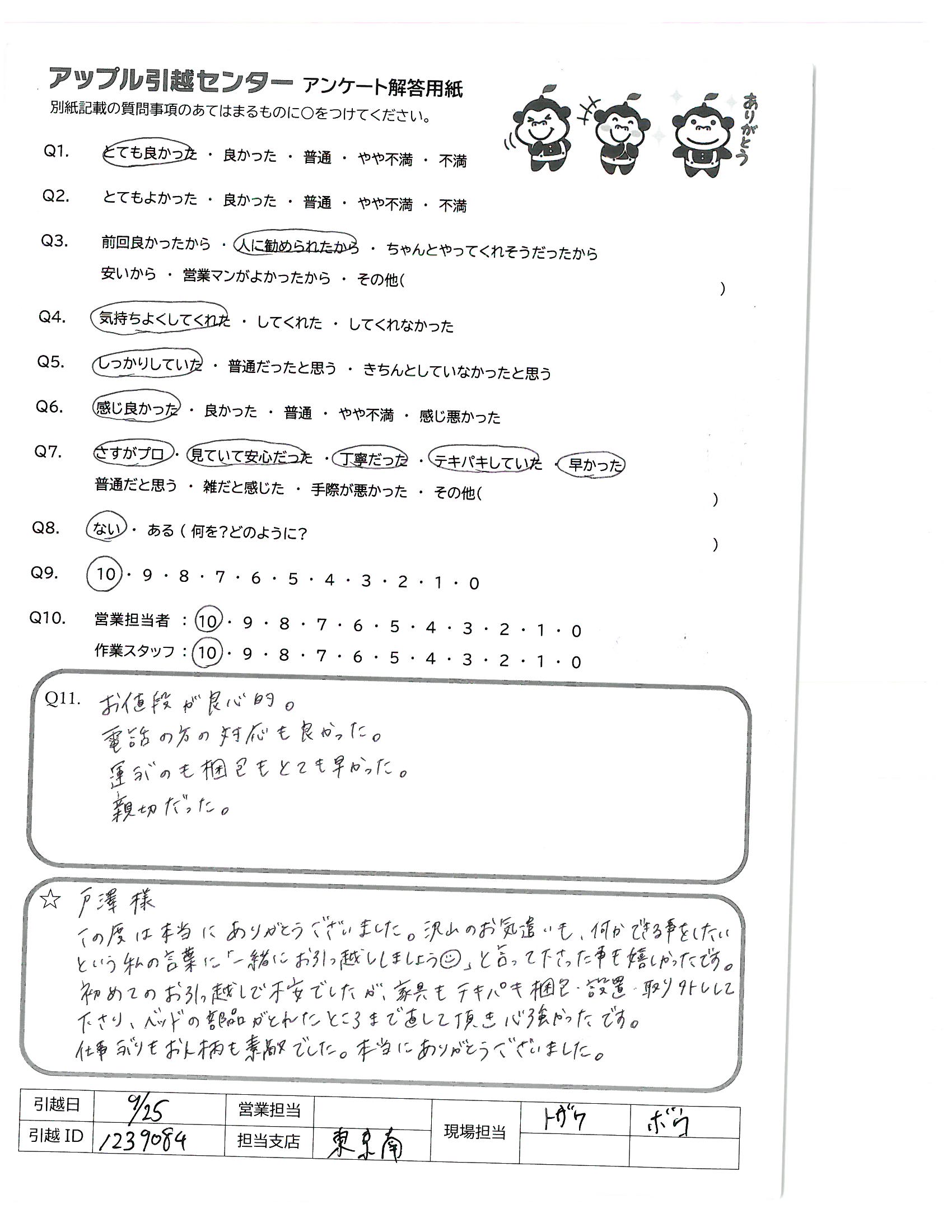 A.戸澤様 この度は本当にありがとうございました。沢山のお気遣いも、何かできる事をしたいという私の言葉に「一緒にお引っ越ししましょう」と言って下さった事も嬉しかったです。 初めてのお引っ越しで不安でしたが、家具もテキパキ梱包・設置・取り外しして下さり、ベッドの部品がとれたところまで直して頂き心強かったです。 仕事ぶりもお人柄も素敵でした。本当にありがとうございました。
