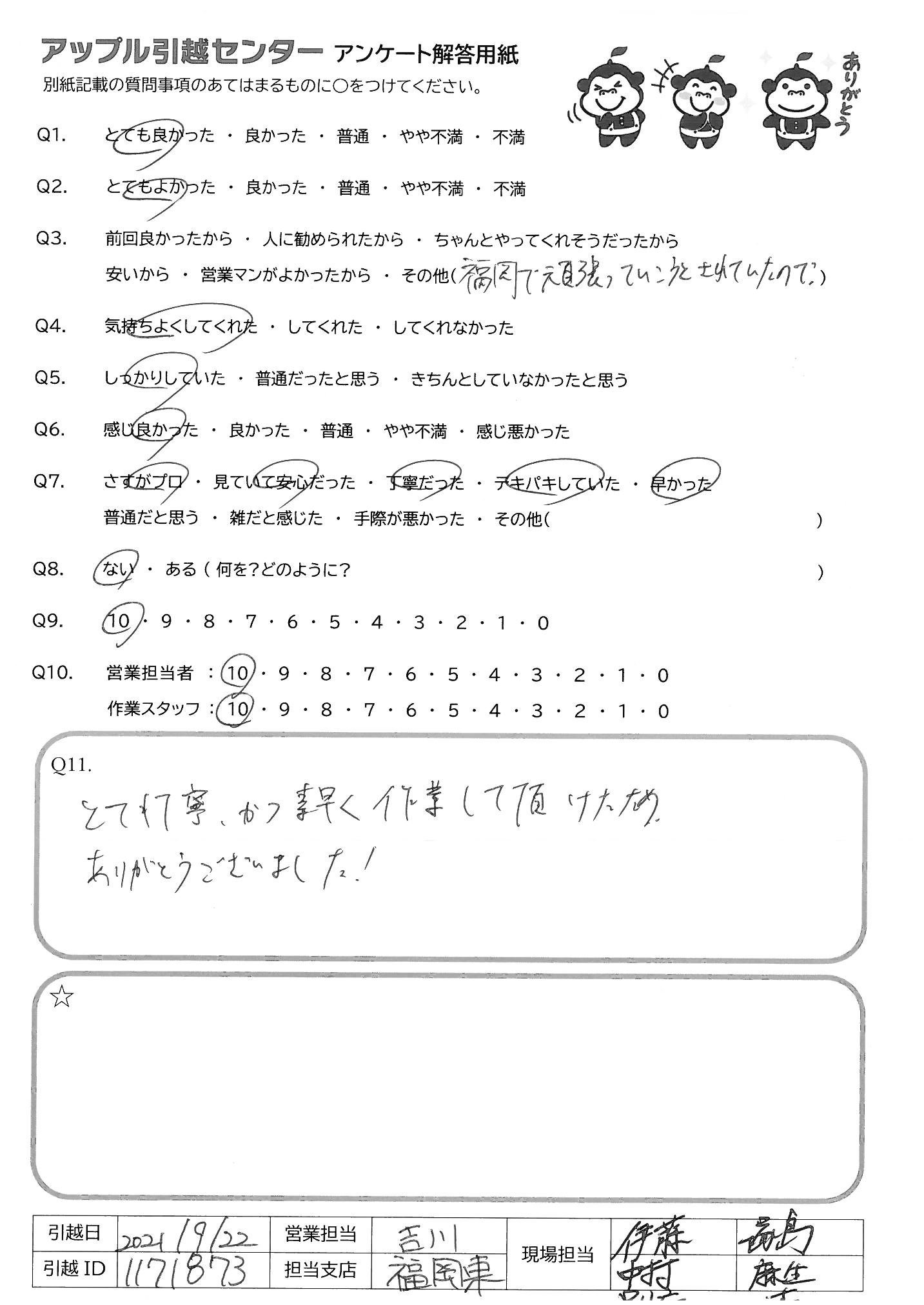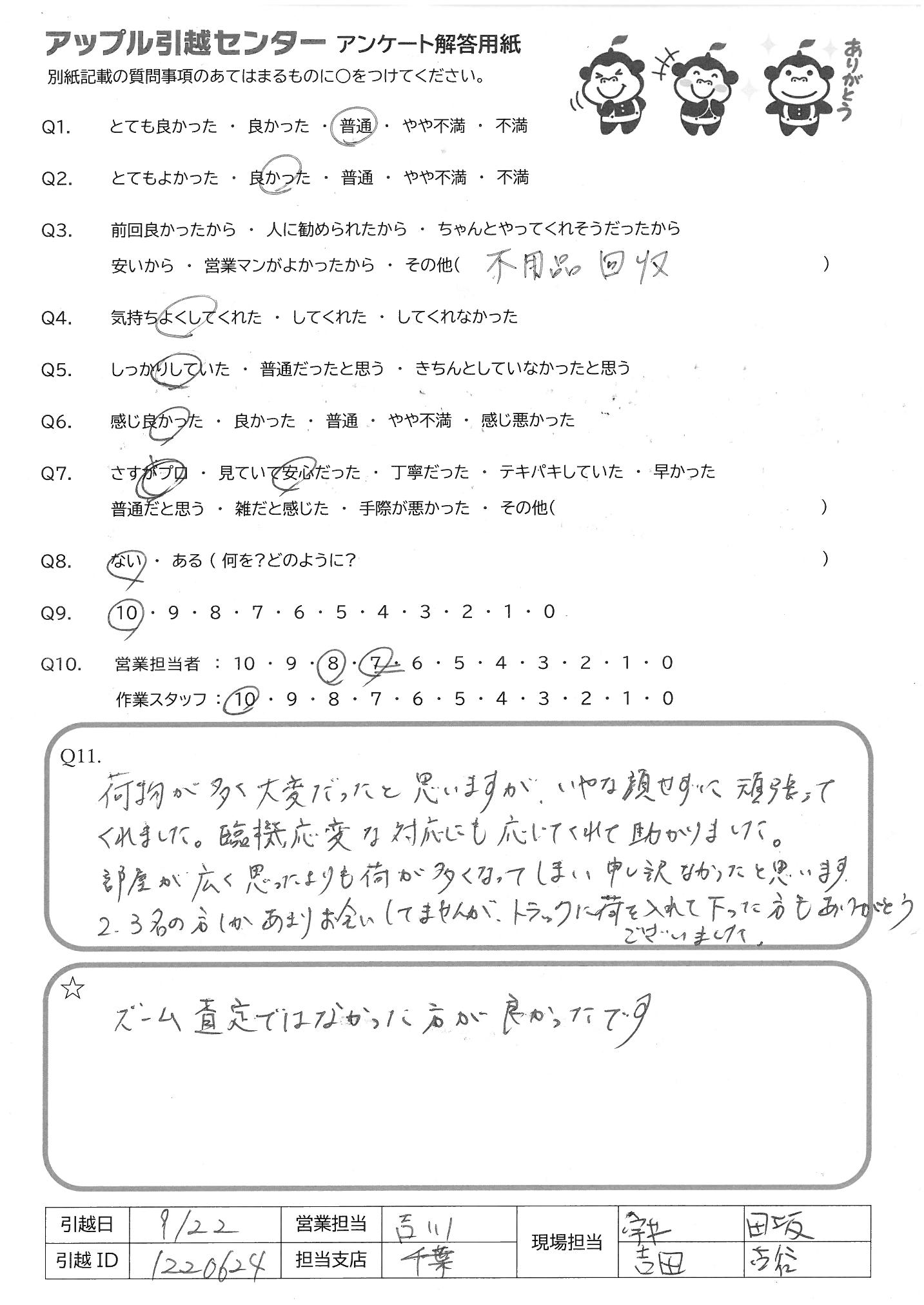 A.時間がタイトな中での依頼だったのですが、できれば間に合わせてほしかった。 *退去及びタクシードライバーをかなり待たせてしまう形となってしまった。 福岡の方で気になったことは、イケアのソファの組み立てに関して、営業の方から解体/組立ての実績があると伺っていたのですが、組み立ての方法がわからず、結果、後がYouTUbeを見ながら指示するという意味不明な感じになってしまったので、ぜひ改善してほしい。
