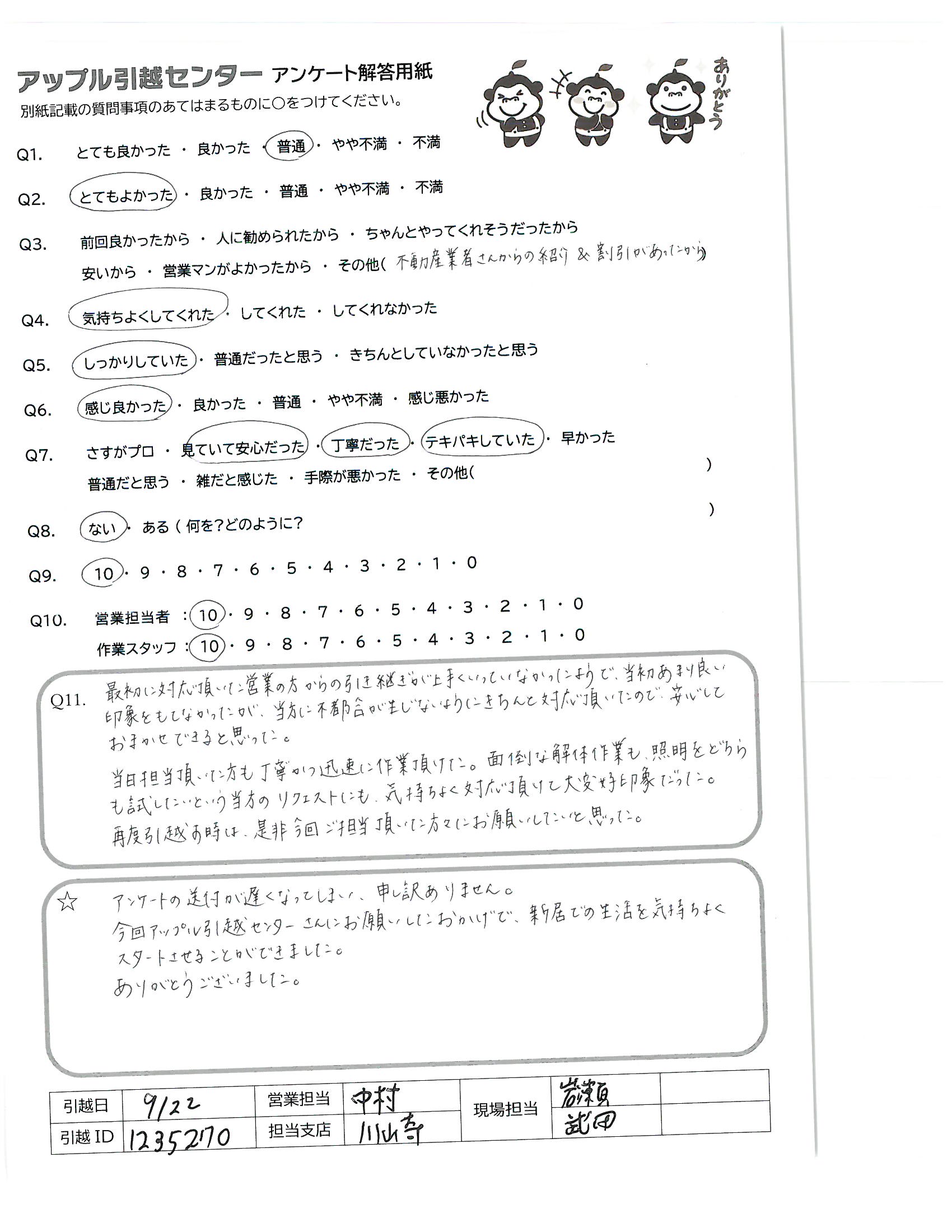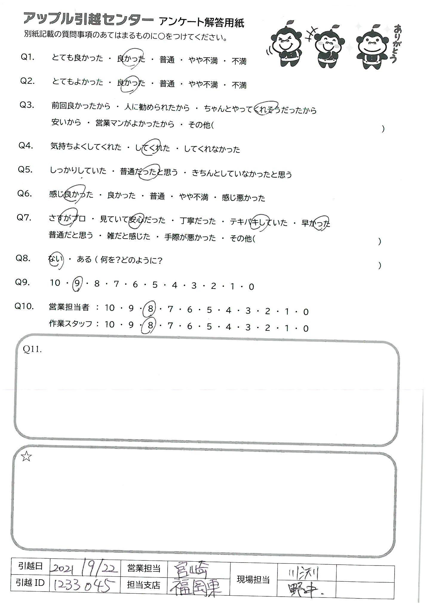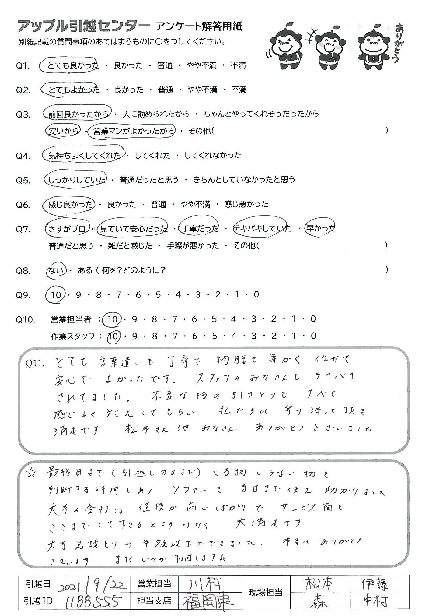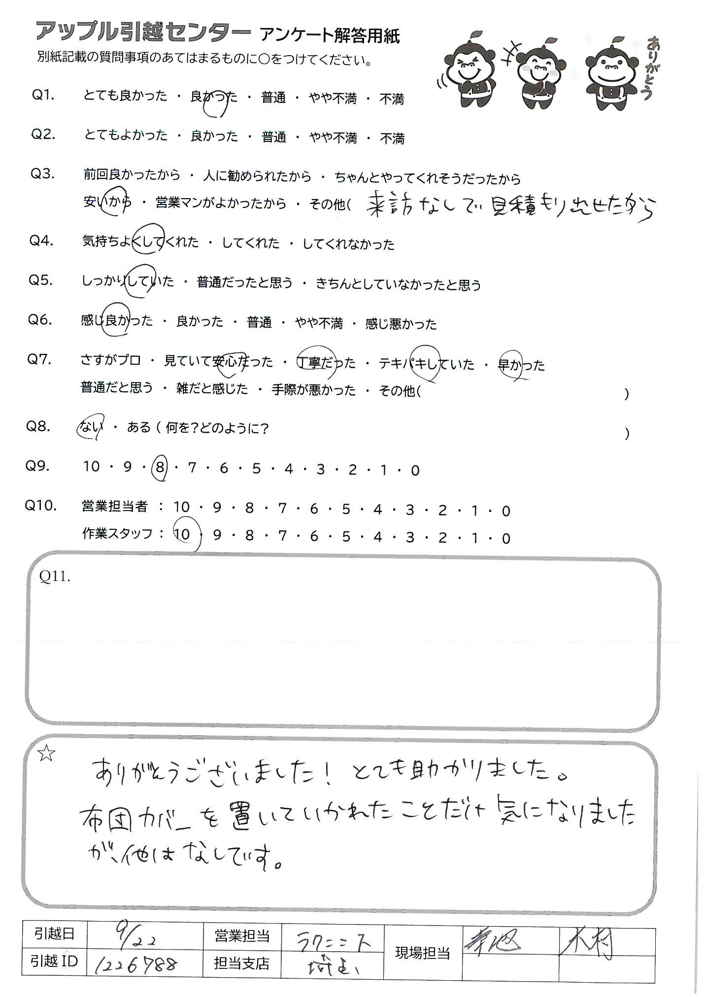 A.アンケートの送付が遅くなってしまい、申し訳ありません。 今回アップル引越センターさんにお願いしたおかげで、新居での生活を気持ちよくスタートさせることができました。 ありがとうございました。