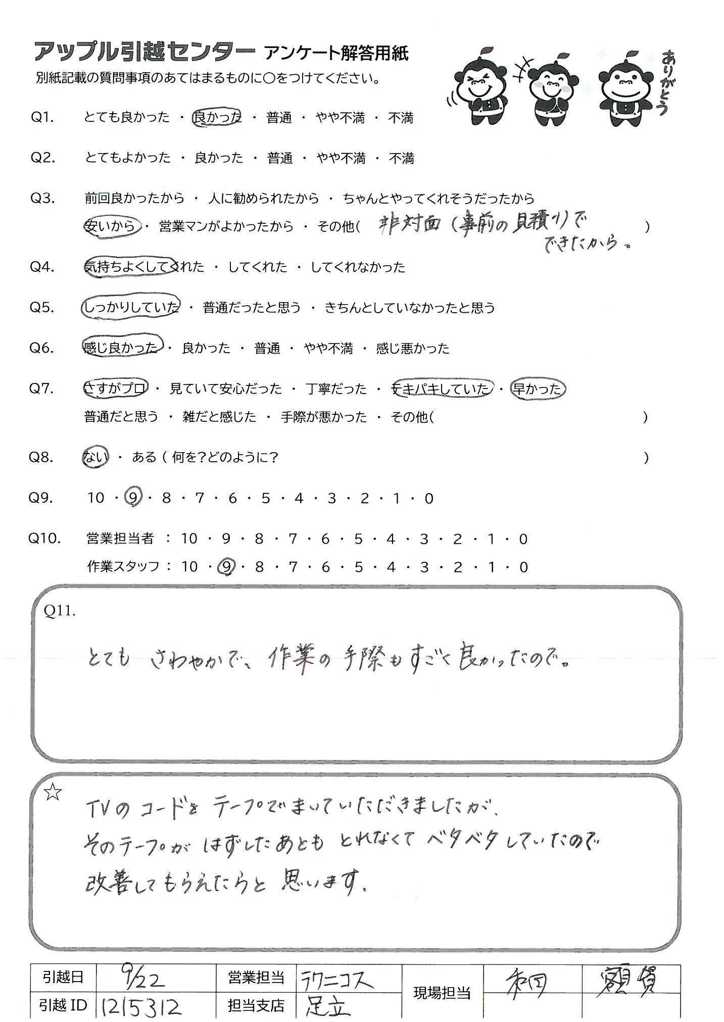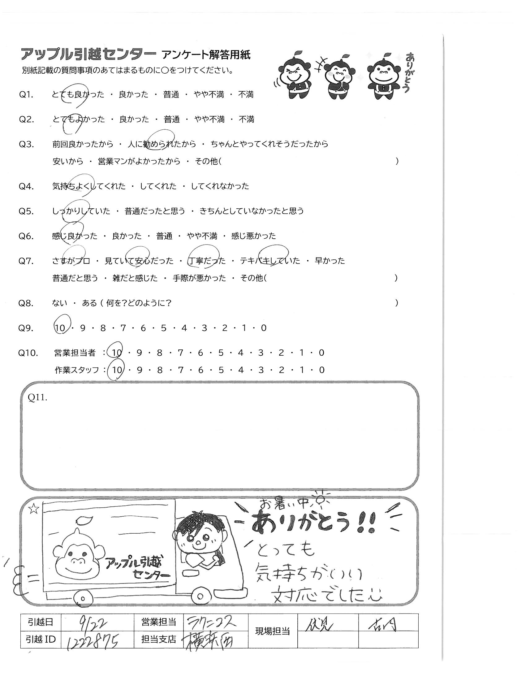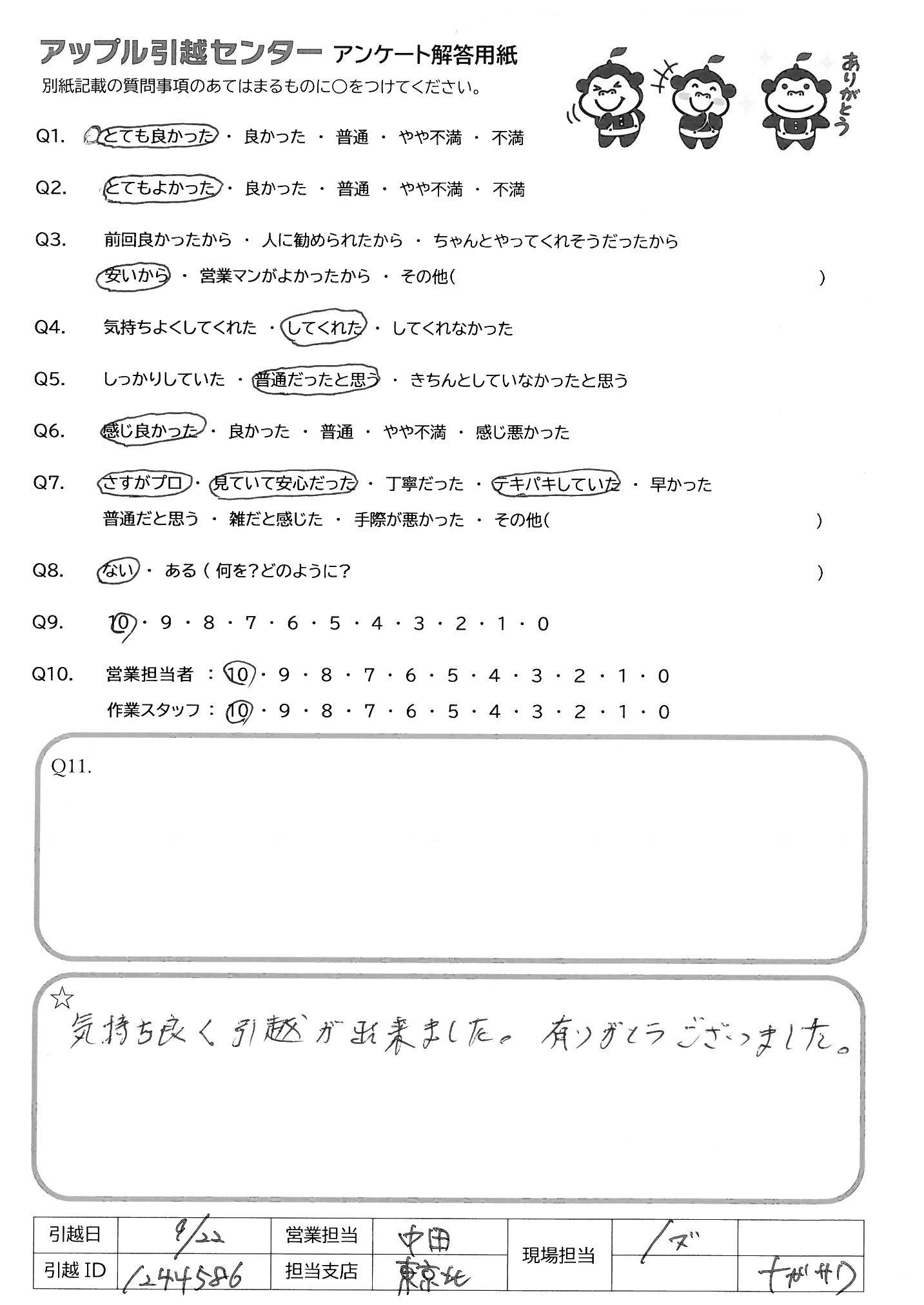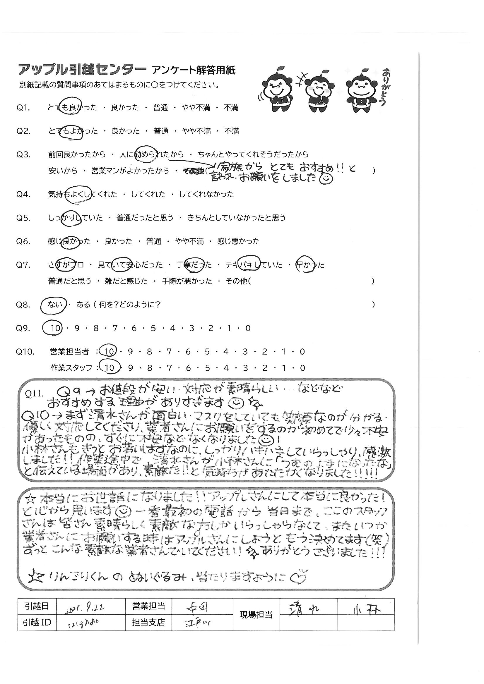 A.アンケートの送付が遅くなってしまい、申し訳ありません。 今回アップル引越センターさんにお願いしたおかげで、新居での生活を気持ちよくスタートさせることができました。 ありがとうございました。