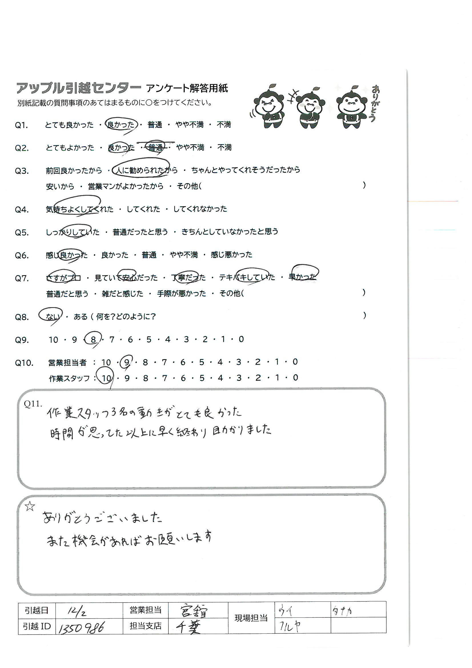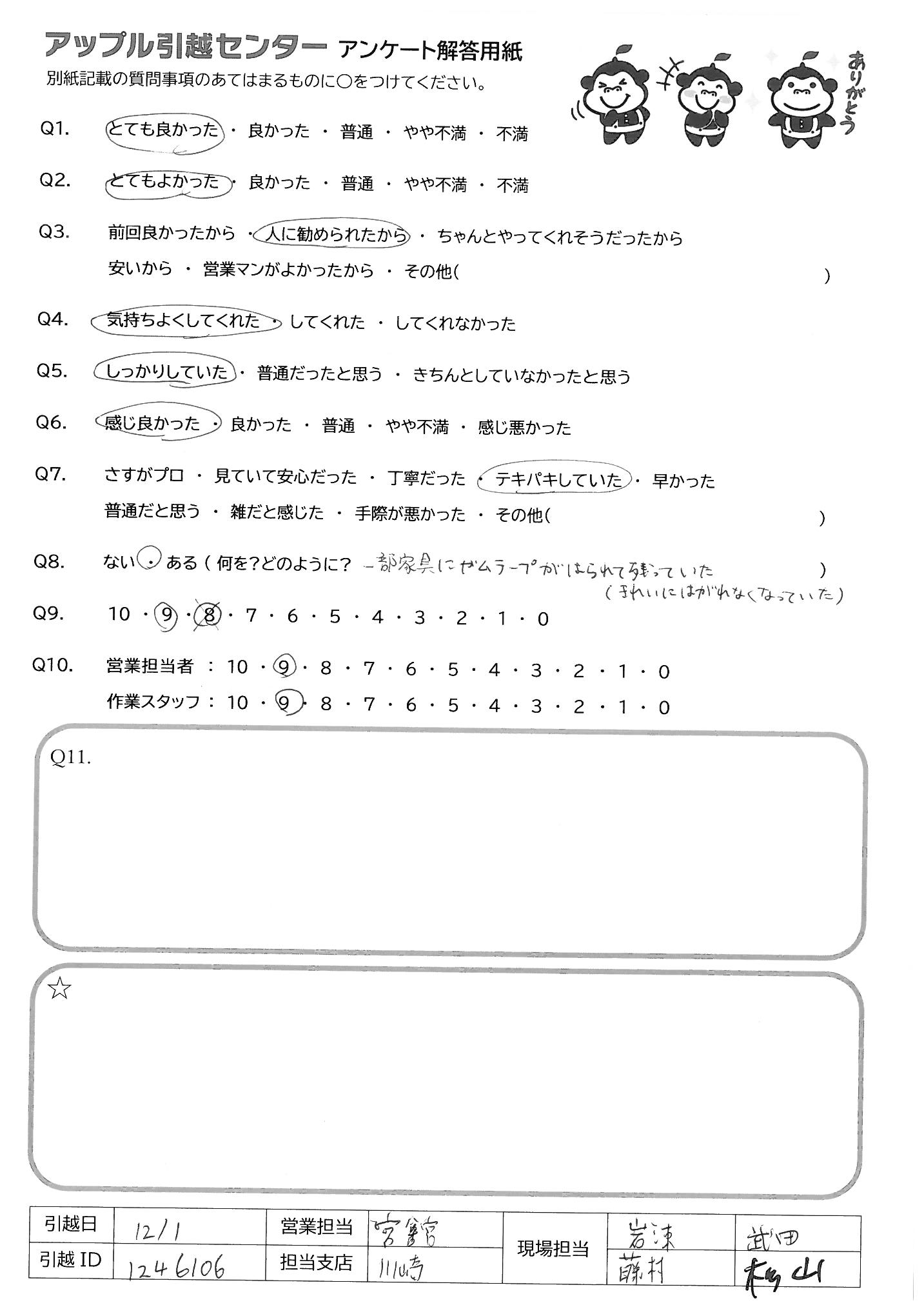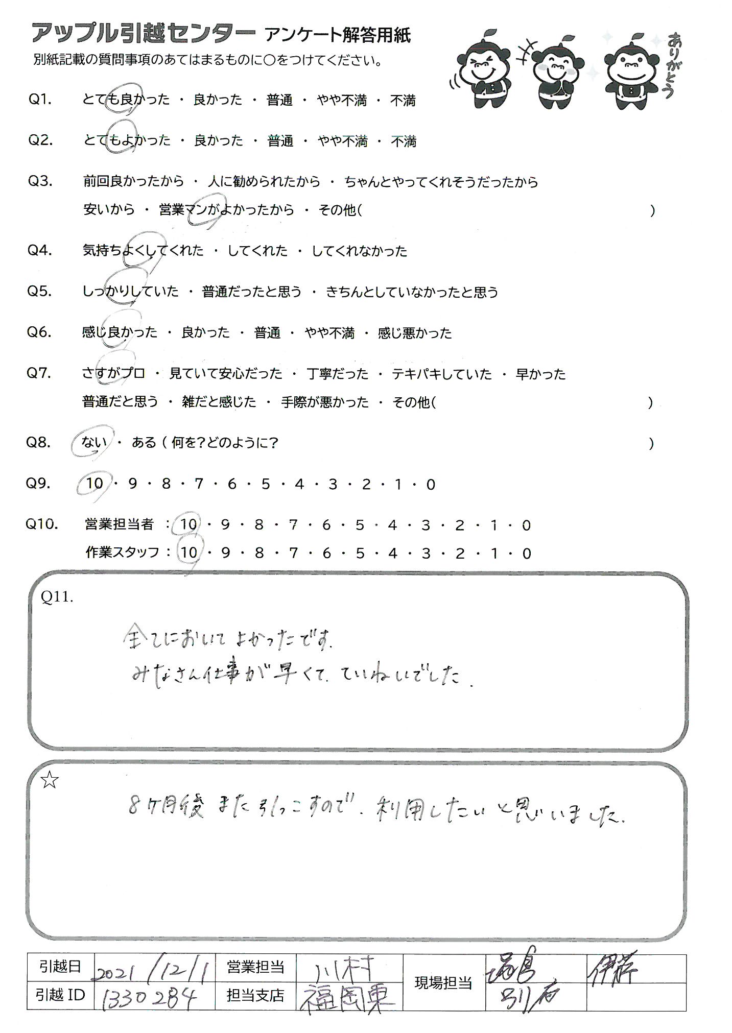 A.総合的にとても良かったです!次引越す時も是非アップル引越しセンターを利用させていただきたいと思います!