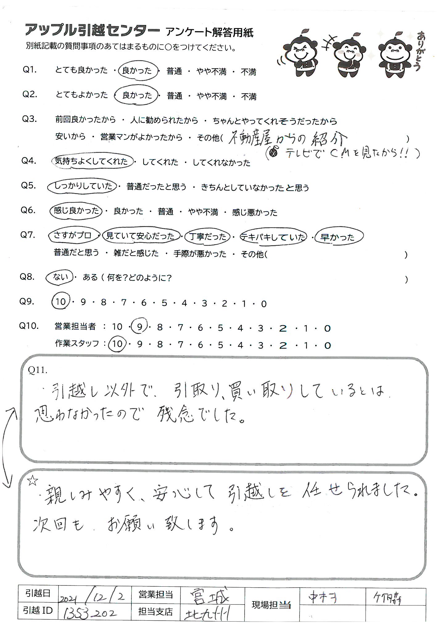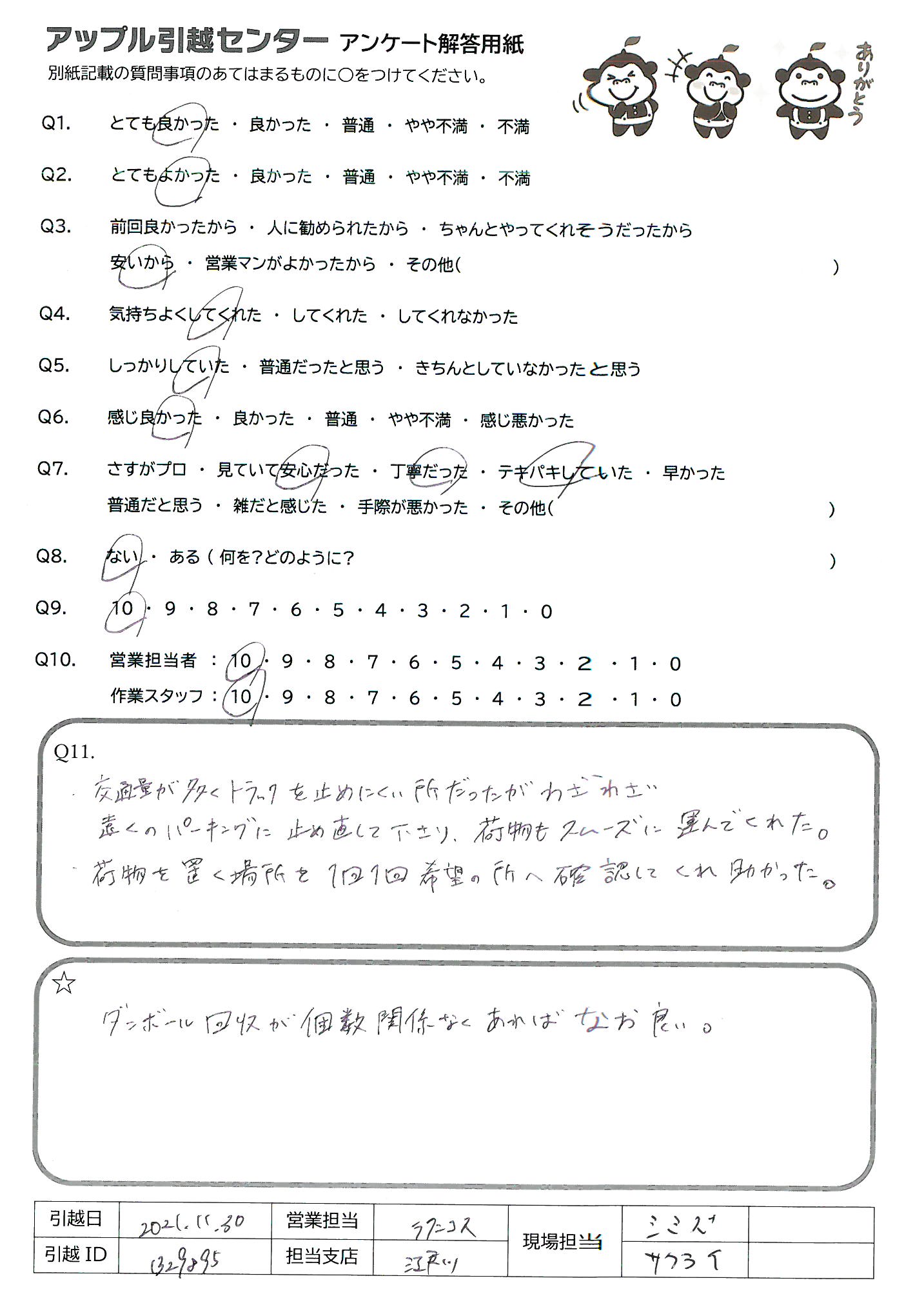 A.親しみやすく、安心して引越しを任せられました。 次回もお願い致します。