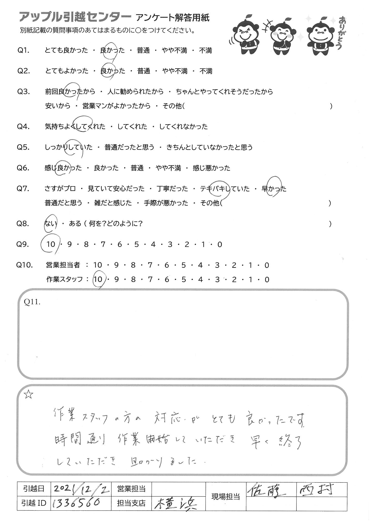 A.作業スタッフの方の対応がとても良かったです 時間通り作業開始していただき早く終了 して頂き助かりました