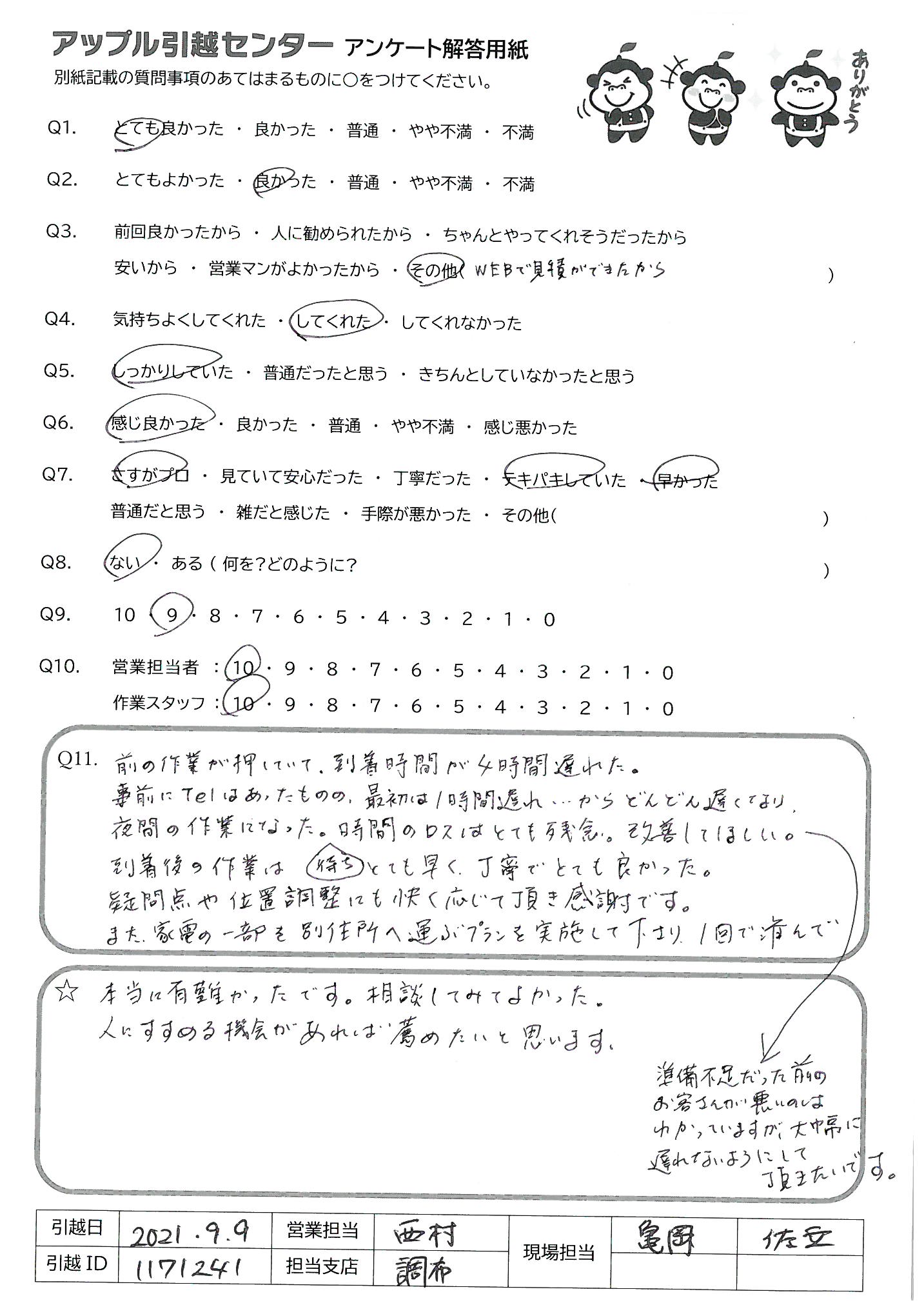 A.前の作業が押していて、到着時間が4時間遅れた。 事前にTelはあったものの、最初は1時間遅れ…からどんどん遅くなり、夜間の作業になった。待ち時間のロスはとても残念。改善してほしい。 到着後の作業はとても早く、丁寧でとても良かった。 疑問点や位置調整にも快く応じて頂き感謝です。 また、家電の一部を別住所へ運ぶプランを実施して下さり1回で済んで