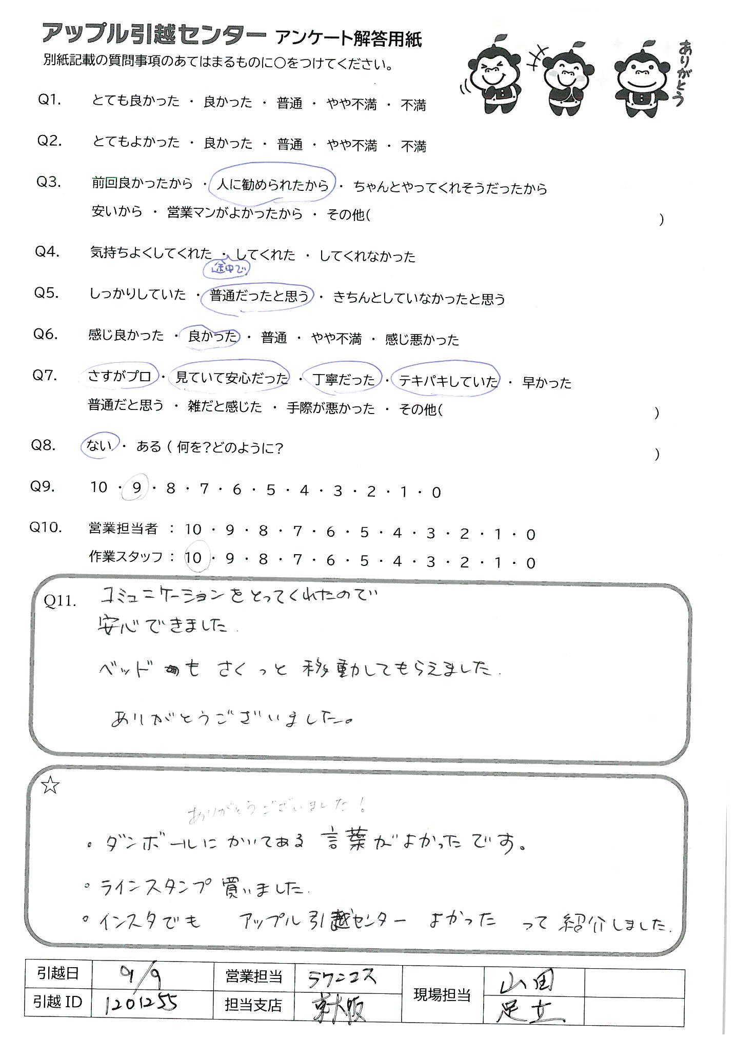 A.・ダンボールにかいてある言葉がよかったです。 ・ラインスタンプ買いました。 ・インスタでもアップル引越センターよかったって紹介しました。