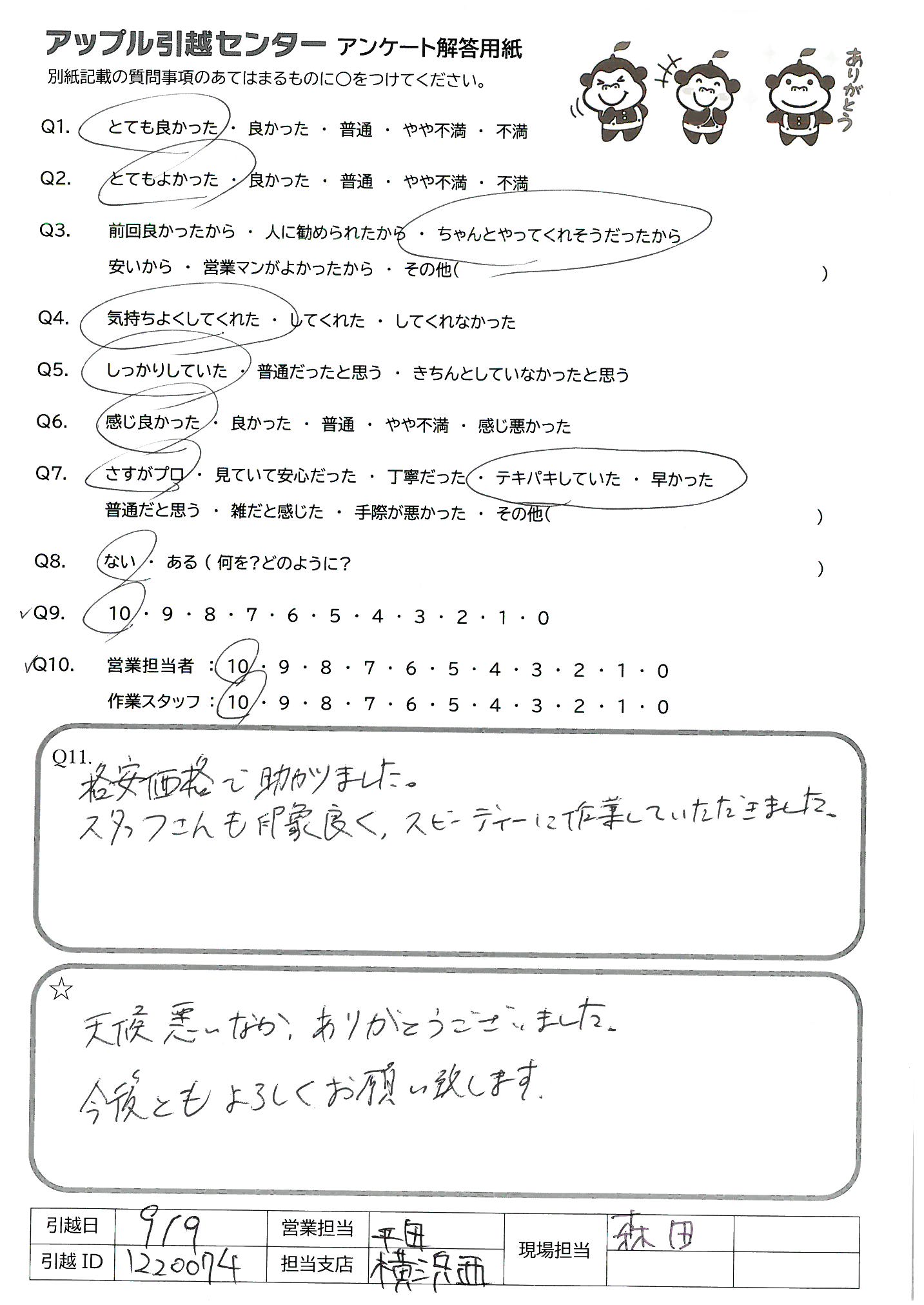 A.現場担当して下さった小針さん、鈴木さん、本当にありがとうございました。 重い荷物を急な階段、上の階まで運ぶのはとても大変なことですが、終始丁寧でまわりに気を配りながら作業して頂き感動でした。 この値段でこのサービスはなかなかないと思います。