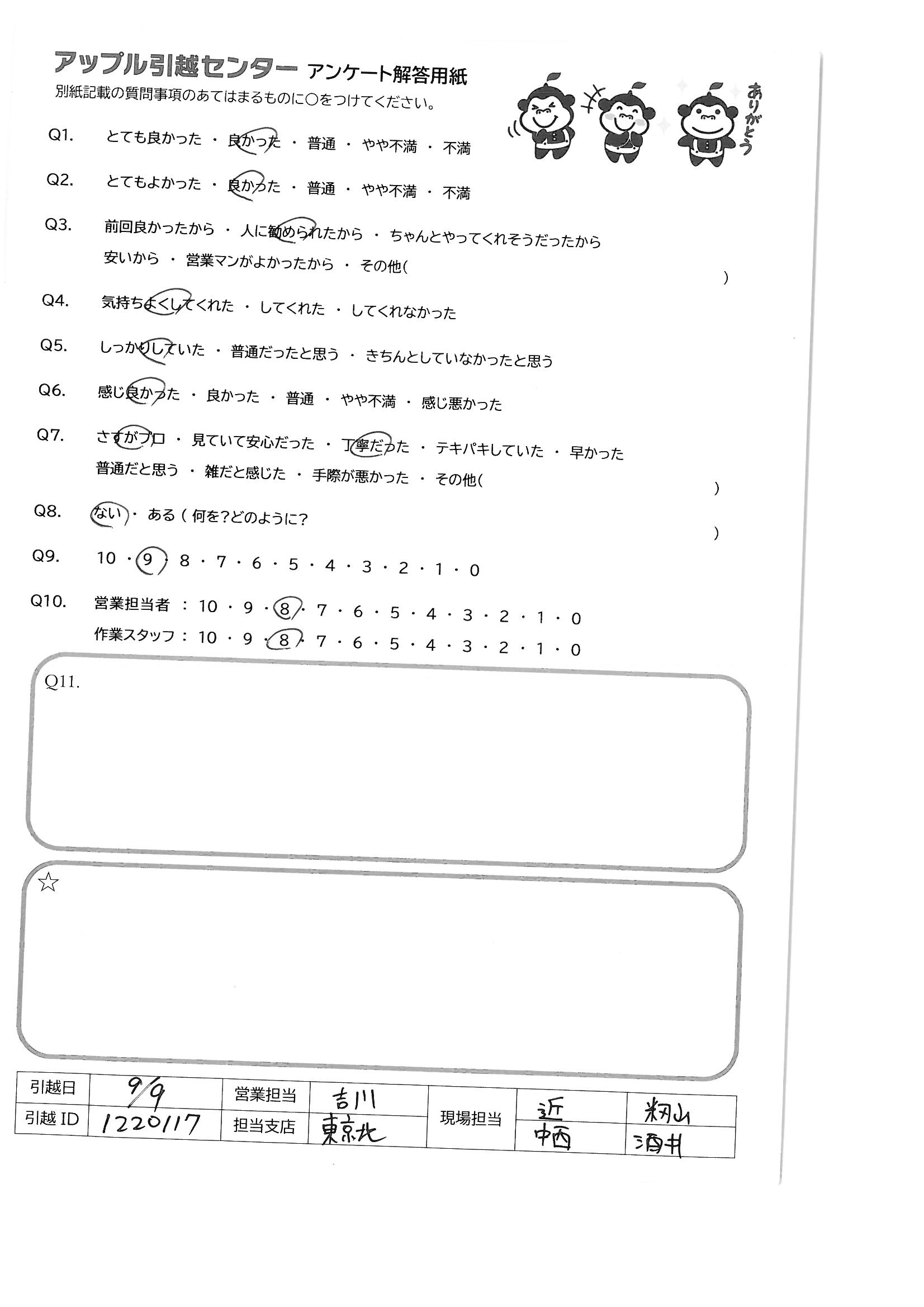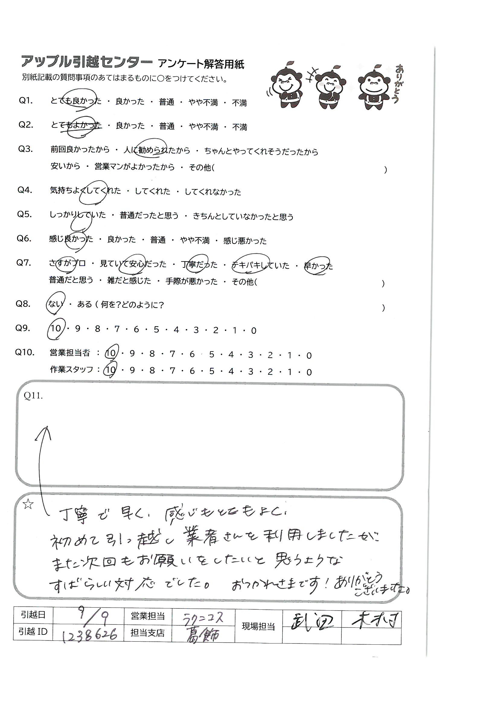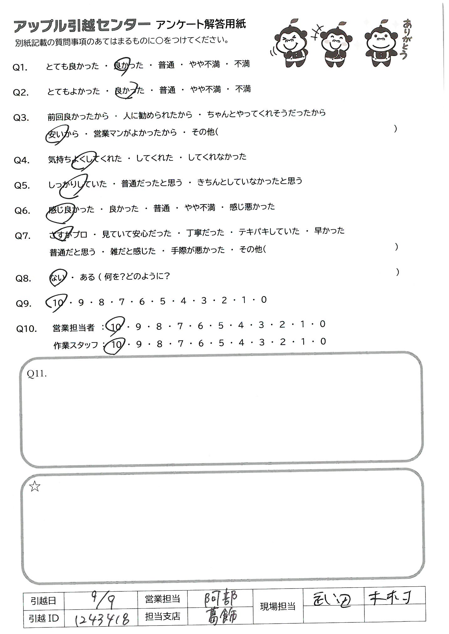 A.丁寧で素早い作業、感動のホスピタリティ、ありがとうございました。 次回引越しする時もアップルにお願いします。