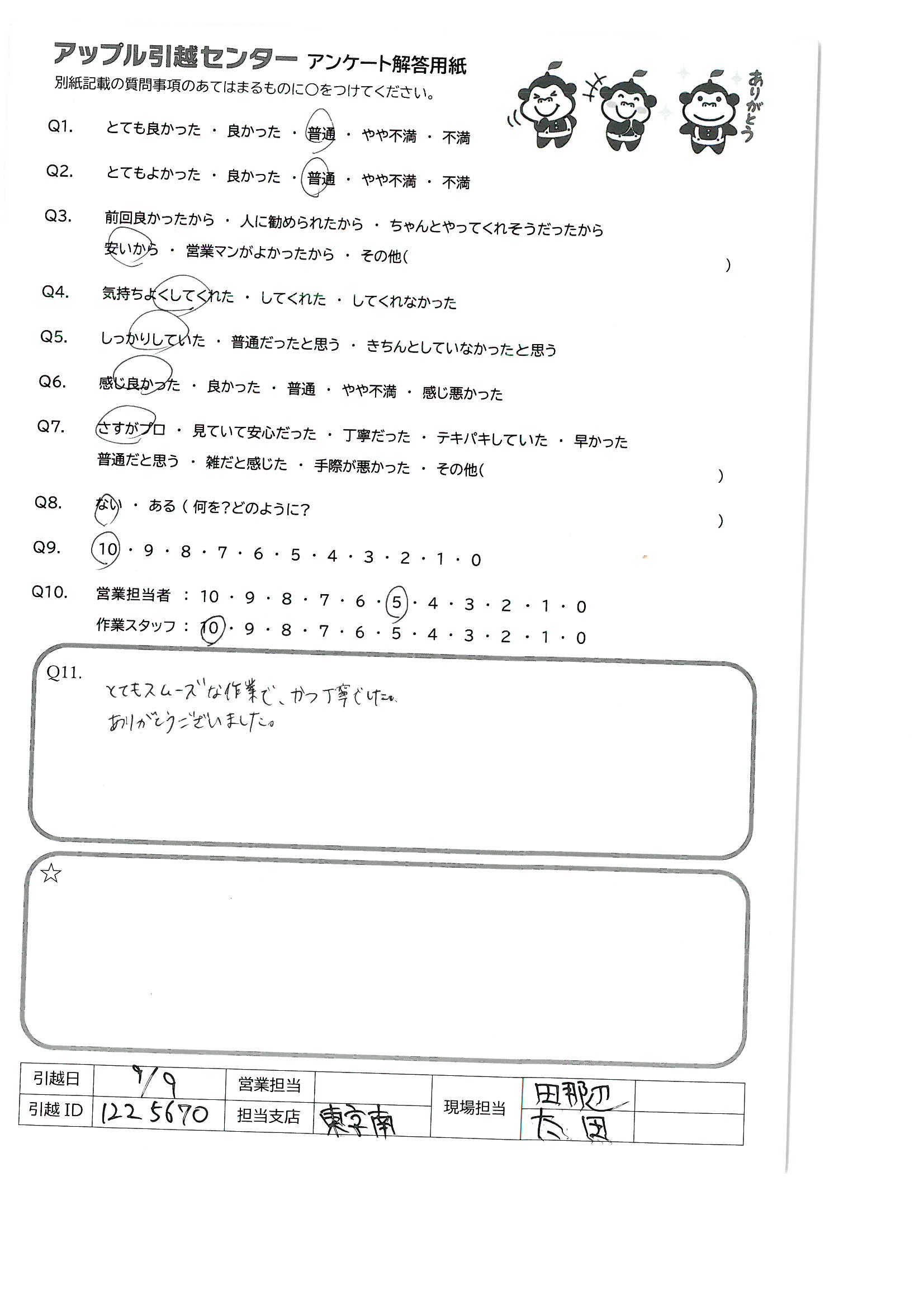 A.丁寧で早く、感じもとてもよく、 初めて引っ越し業者さんを利用しましたが、また次回もお願いをしたいと思うようなすばらしい対応でした。おつかれさまです!ありがとうございました。