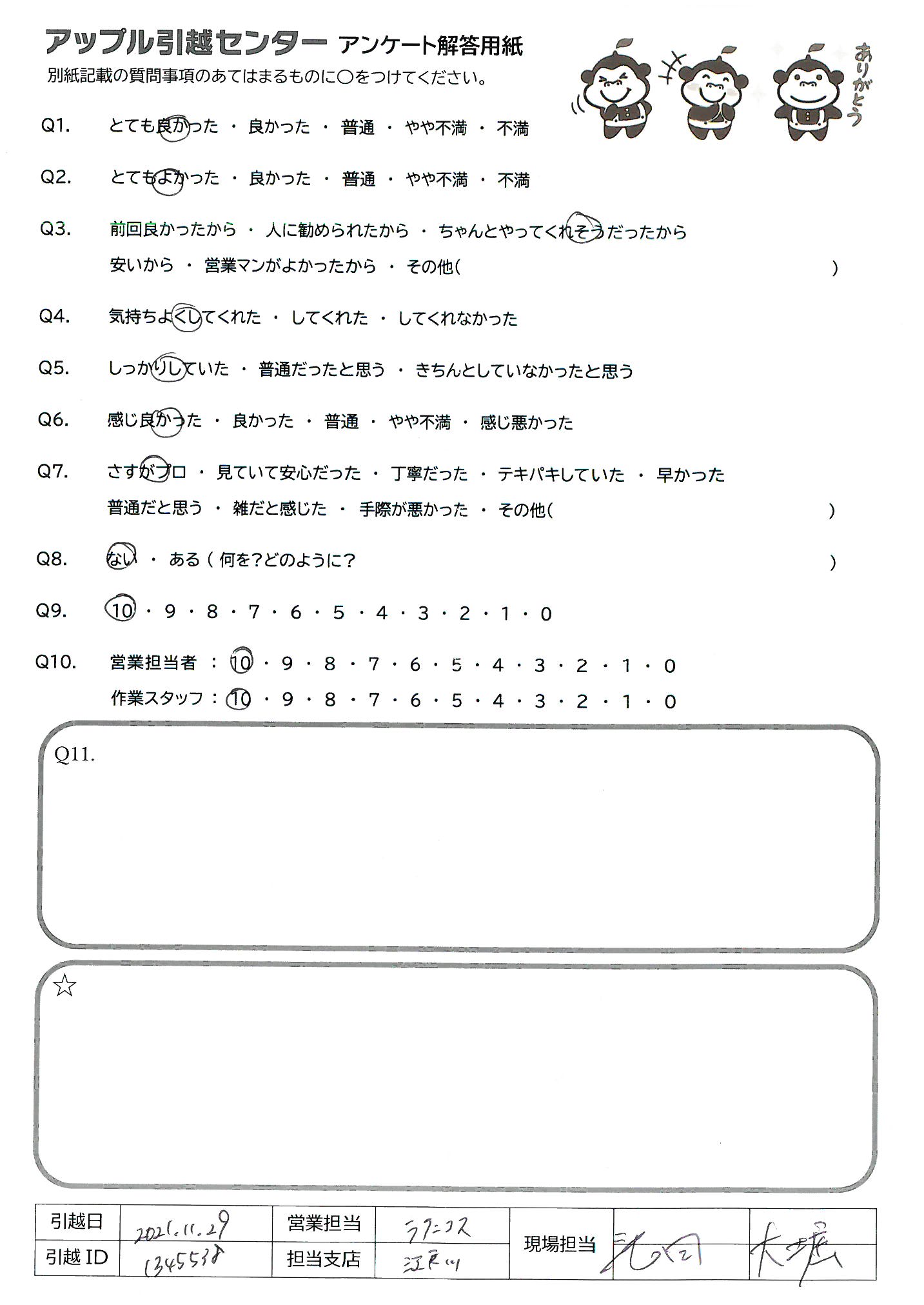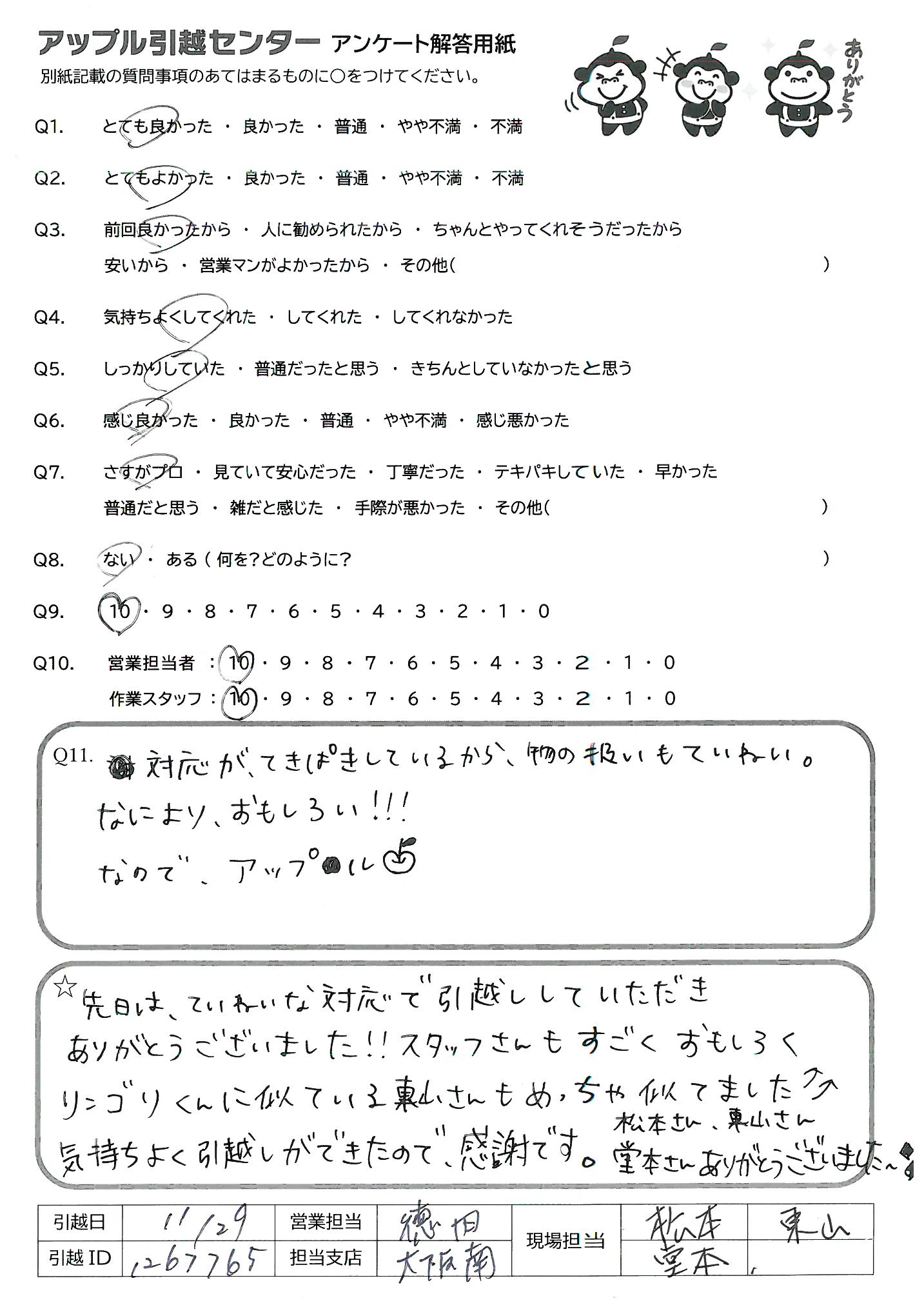 A.先日は、ていねいな対応で引越ししていただきありがとうございました!!スタッフさんもすごくおもしろくリンゴリくんに似ている東山さんもめっちゃ似てました 気持ちよく引越しができたので、感謝です。松本さん東山さん堂本さんありがとうございました