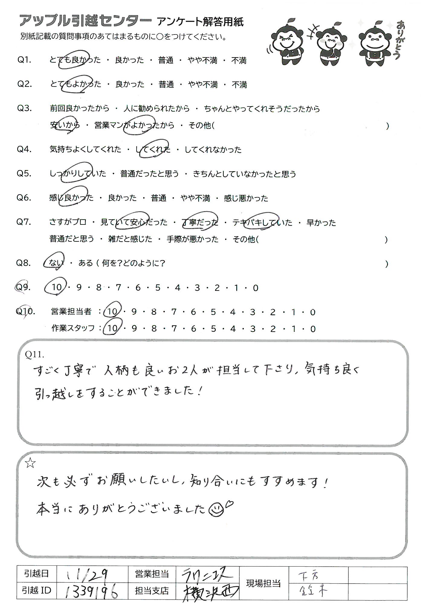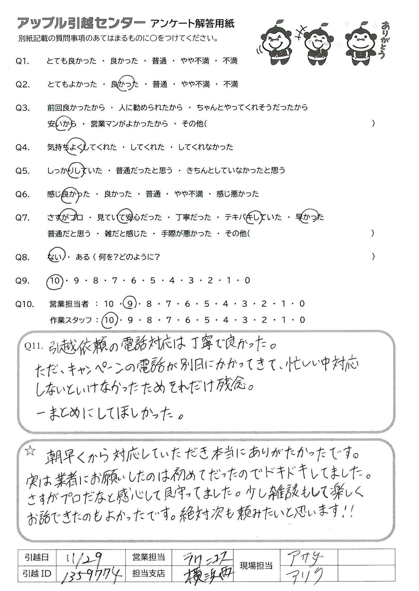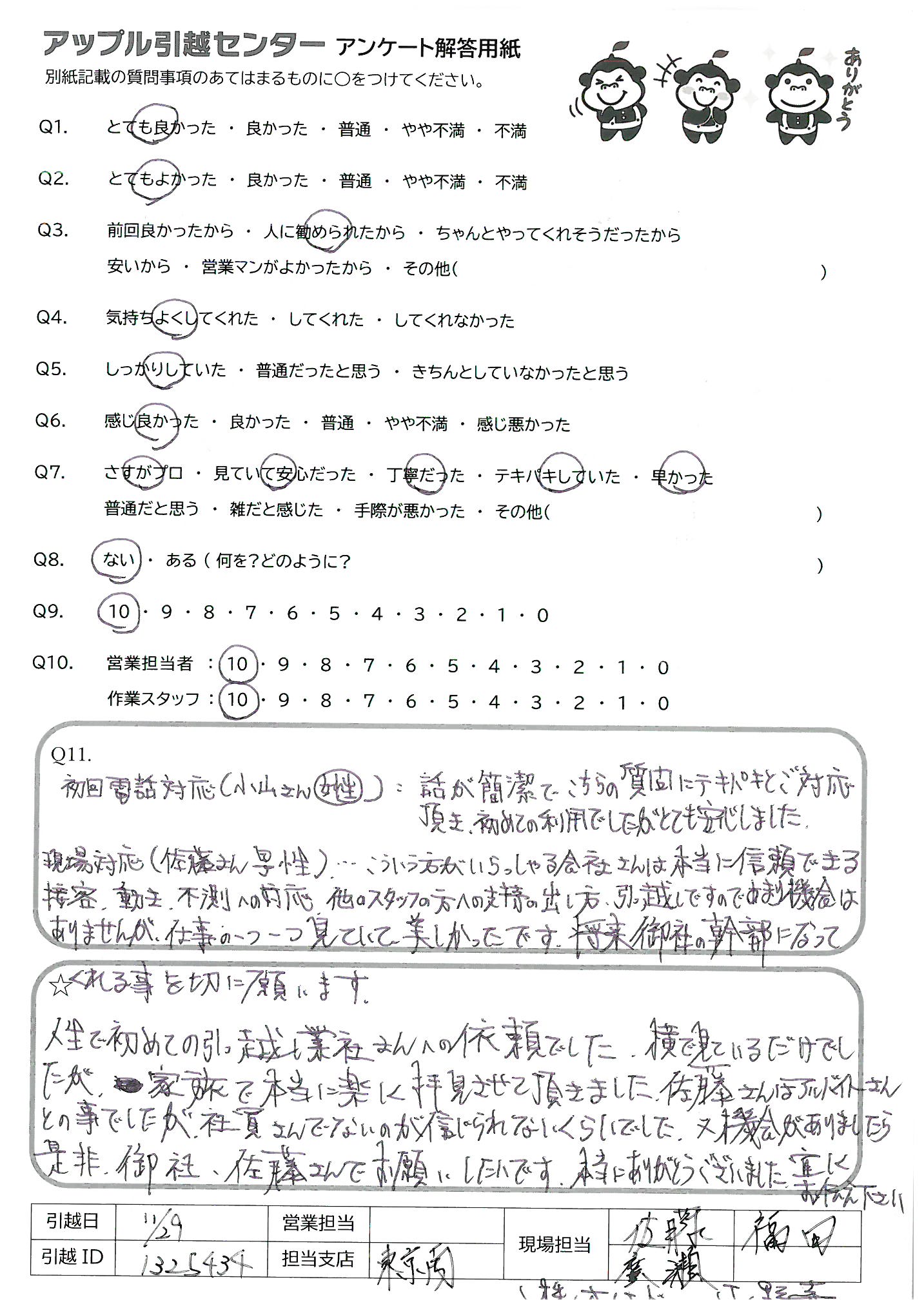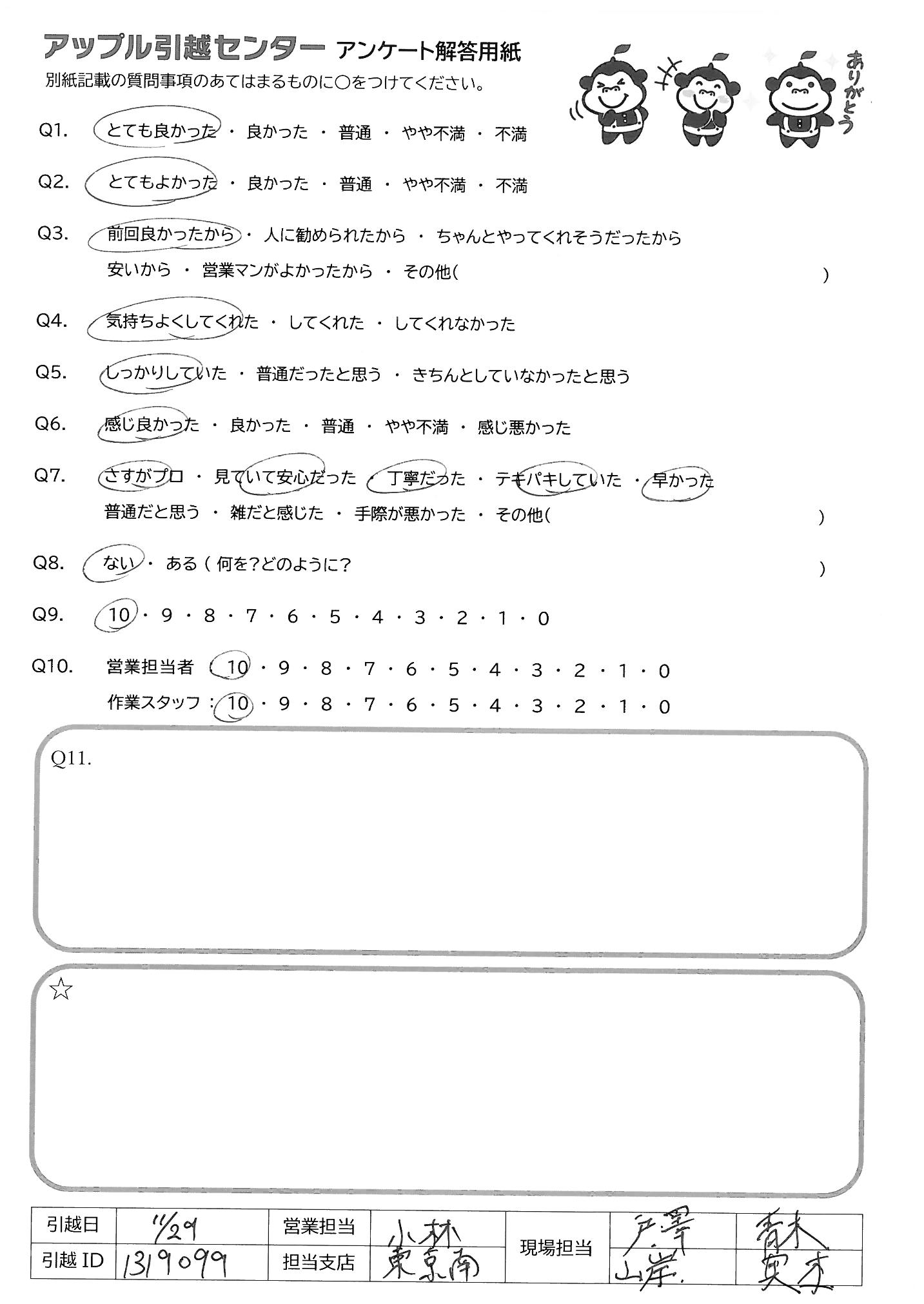 A.初回電話対応(小山さん女性):話が簡潔でこちらの質問にテキパキとご対応頂き、初めての利用でしたが、とても安心しました。 現場対応(佐藤さん男性)…こういう方がいらっしゃる会社さんは本当に信頼できる接客、動き、不測への対応、他のスタッフの方への支持の出し方、引っ越しですのであまり機会はありませんが、仕事の一つ一つ見ていて美しかったです。将来御社の幹部になって