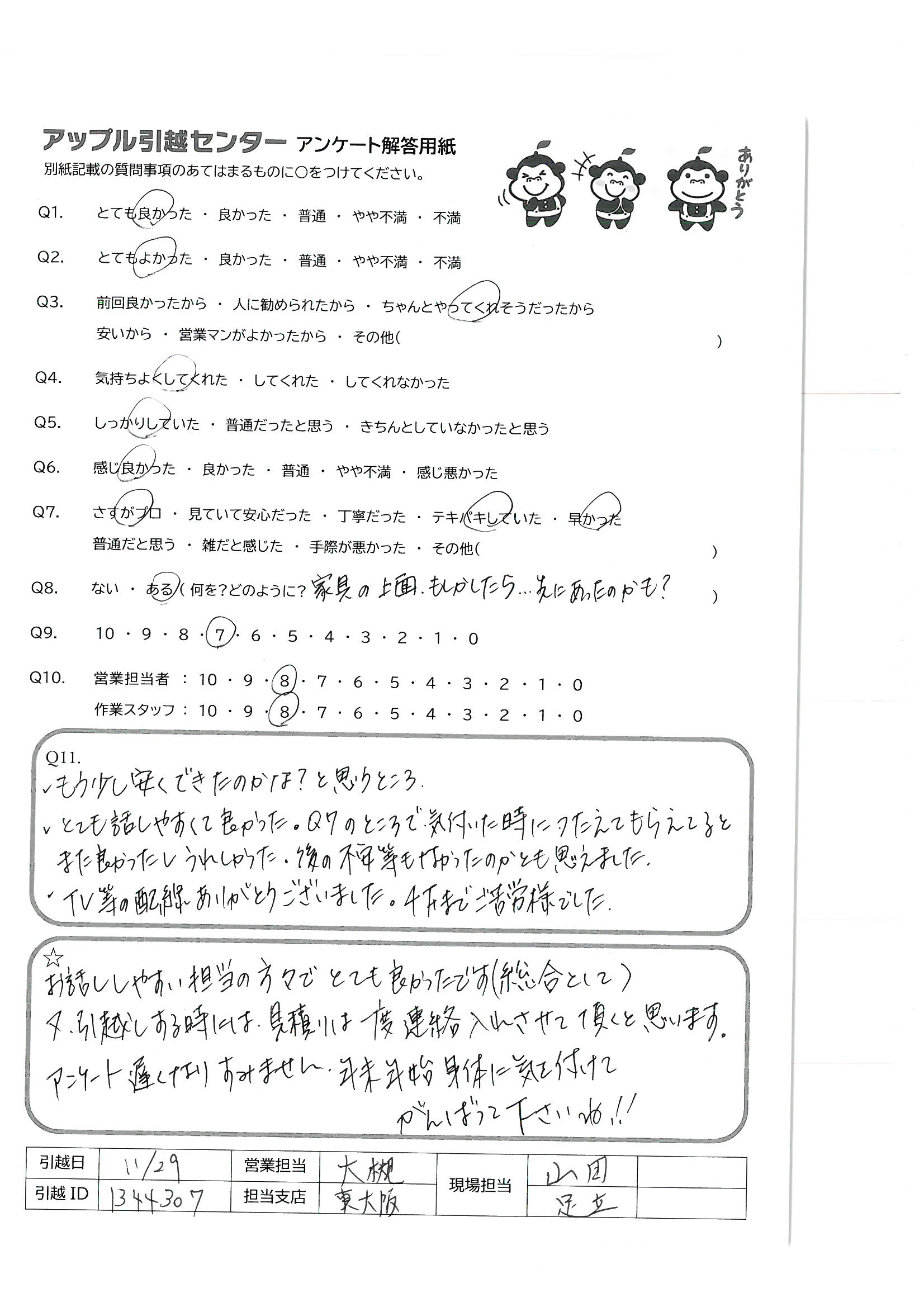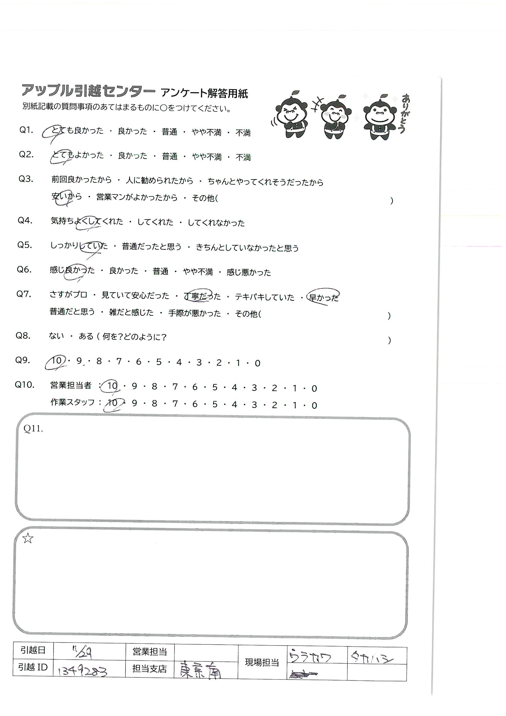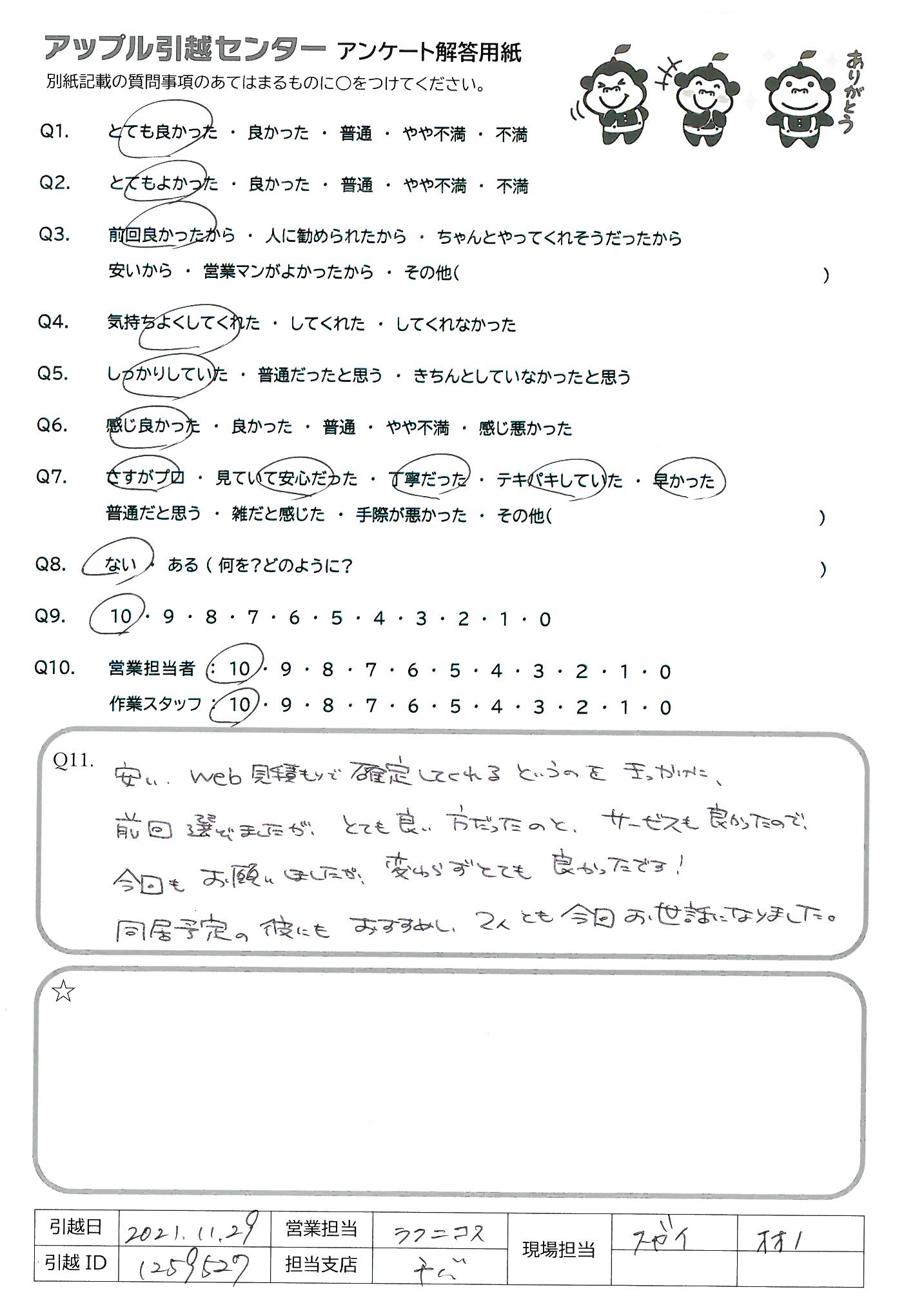 A.お話ししやすい担当の方々でとても良かったです(総合として) 又、引越しする時には、見積りは一度連絡入れさせて頂くと思います。 アンケート遅くなりすみません。年末年始身体に気を付けてがんばって下さいね!!