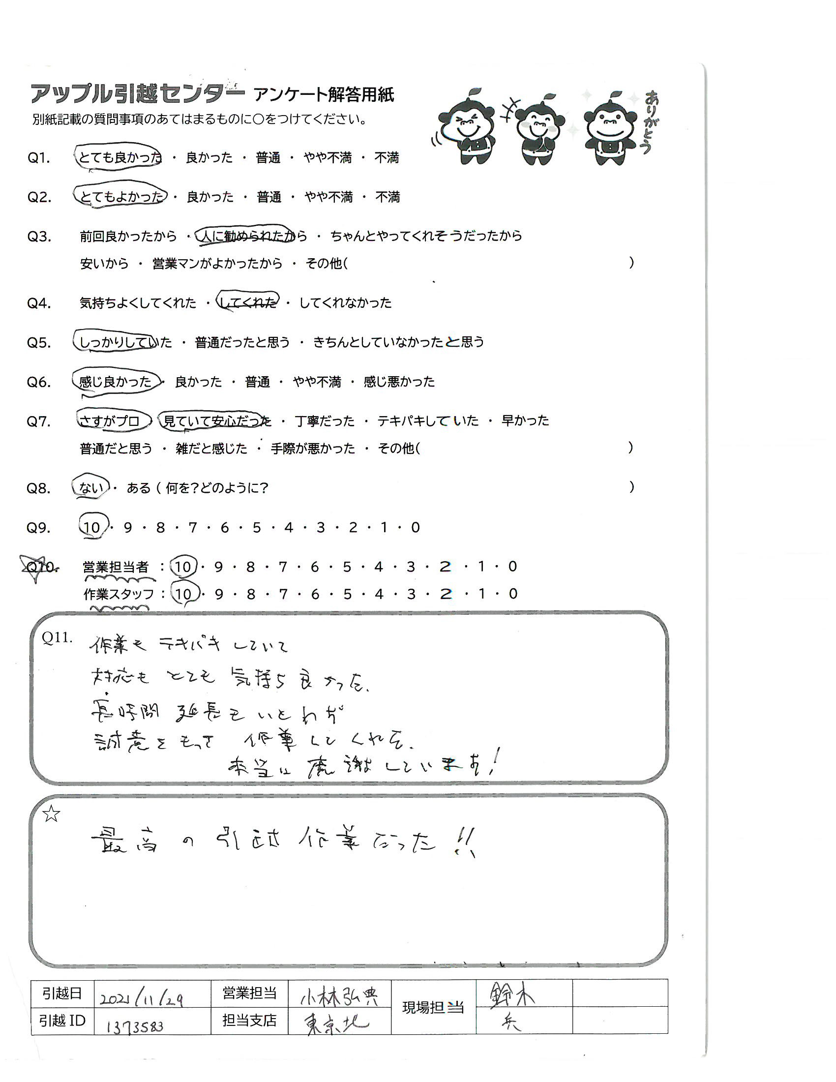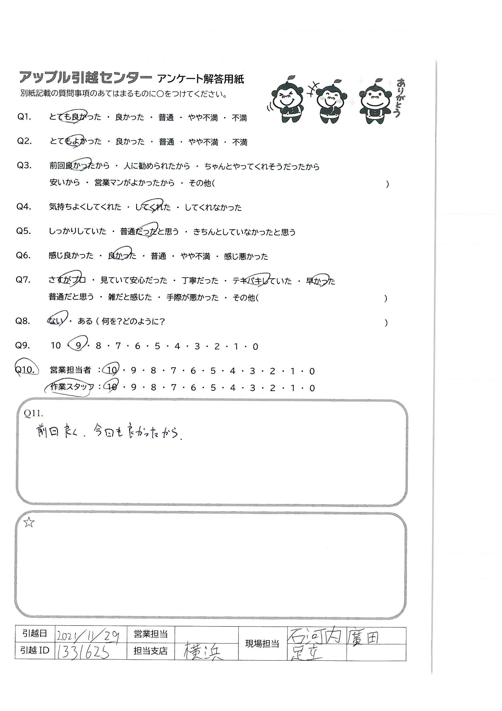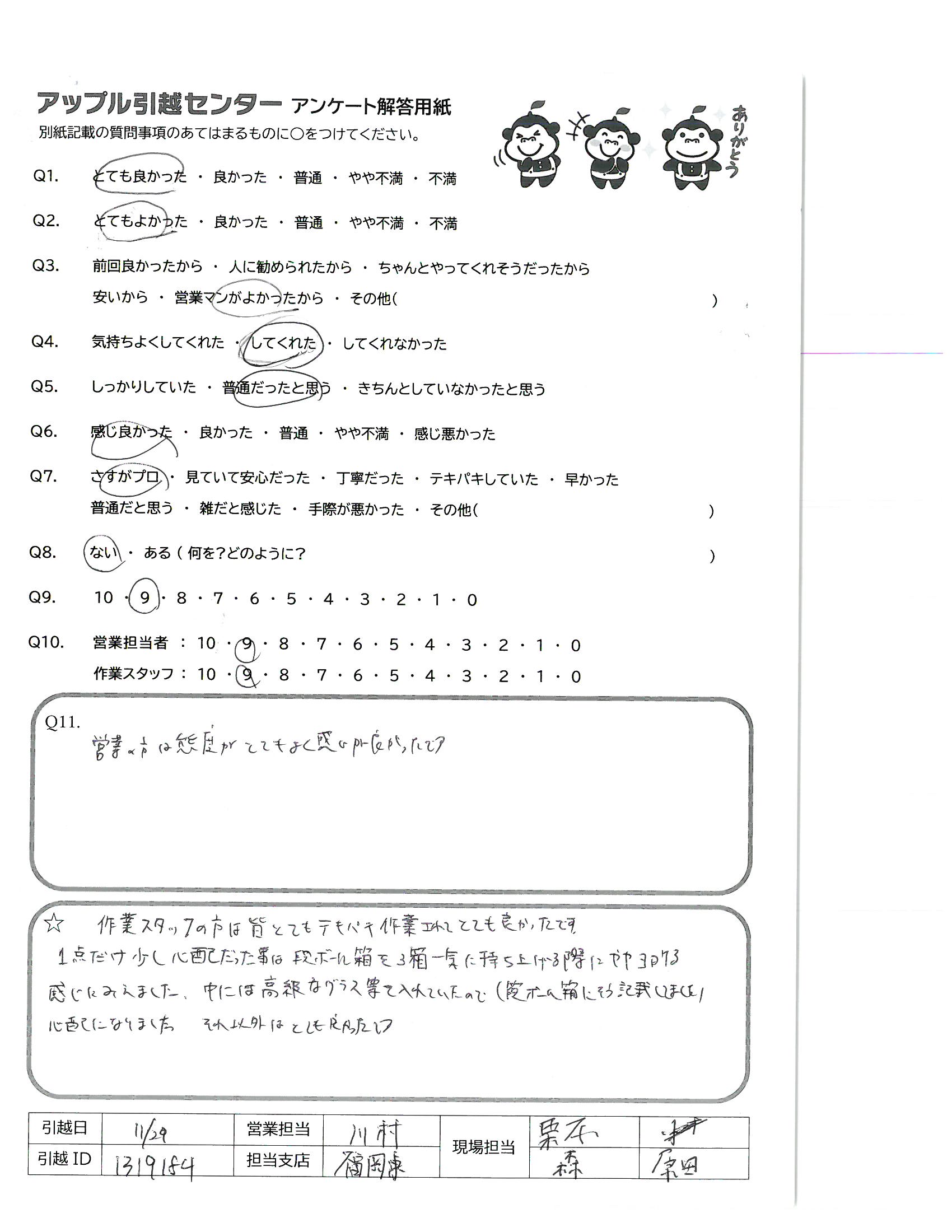 A.お話ししやすい担当の方々でとても良かったです(総合として) 又、引越しする時には、見積りは一度連絡入れさせて頂くと思います。 アンケート遅くなりすみません。年末年始身体に気を付けてがんばって下さいね!!