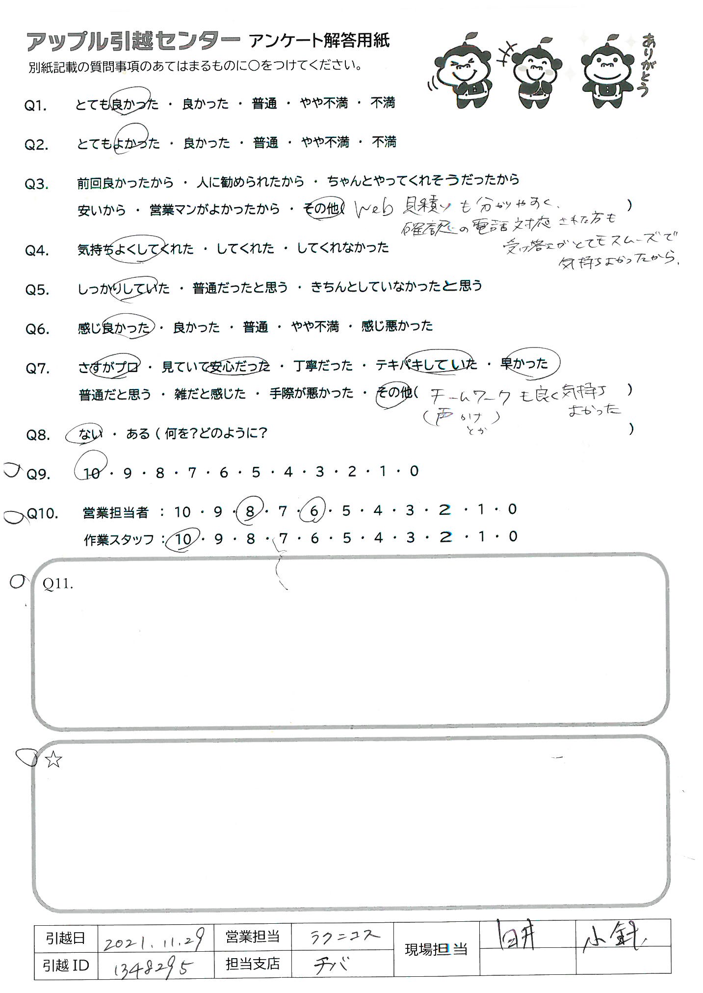 A.・Web上で荷物量の入力、電話Zoom会議だけで迅速に見積がしてもらえました。大手と比較するとコストが抑えられ、当日の追加料金はなく、追加料金がかかるような素振も一切ありませんでした。 ・段ボールのりんごり君が可愛くて荷造りの際に癒されました。 ・営業担当の宮坂さんは、荷物量の見立てが正確で段ボールの箱数がぴったりでした。見積金額の提示、とその根拠説明もスムーズでとても好感が持てました。 ・当日の作業リーダーの中西さんは、爽やかで素早く且つ丁寧に作業をしてくれました。引越先の洗濯器水栓から水漏れがあったのですが、試運時に発見してすぐ教えてくれて好感がもてました。