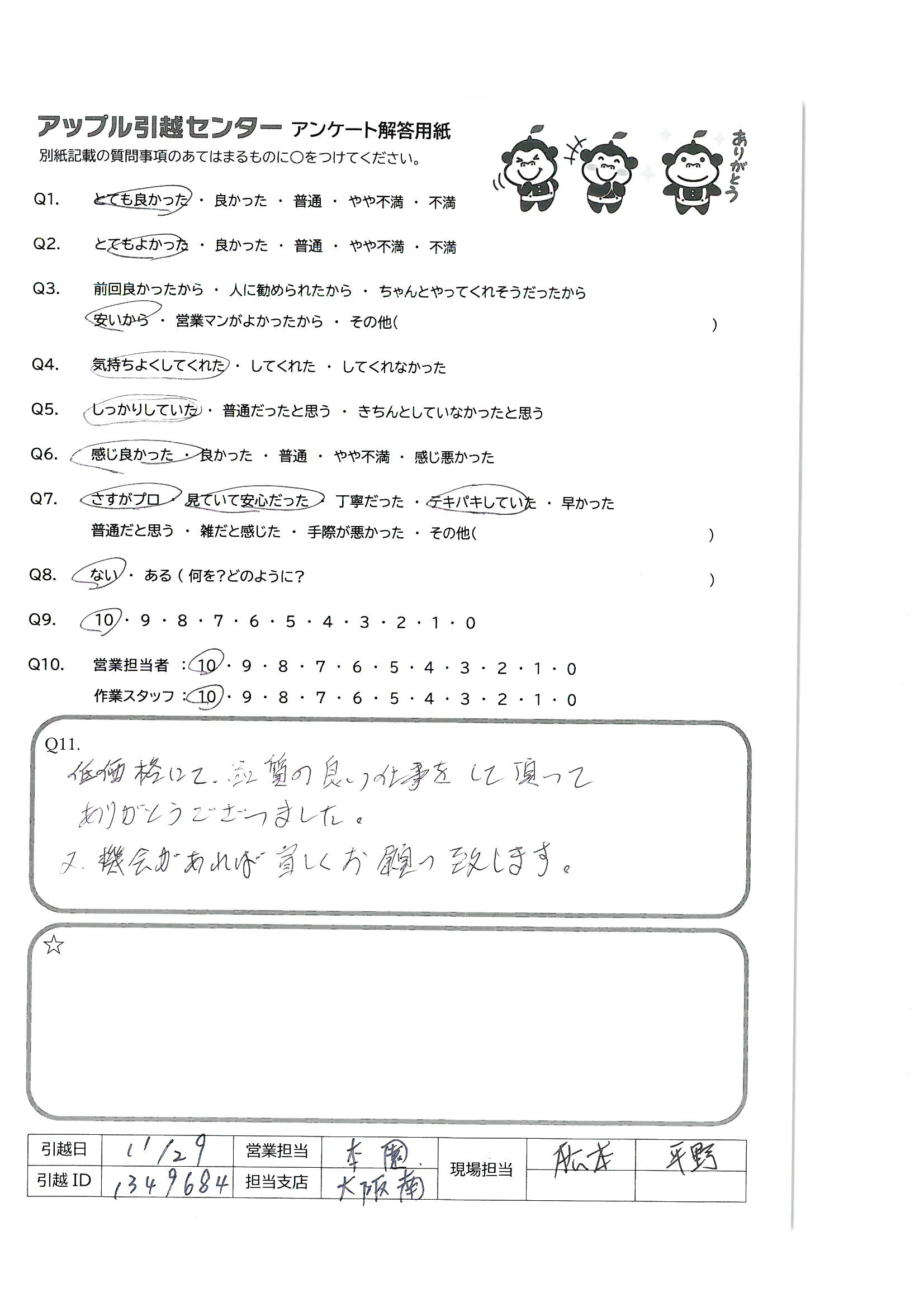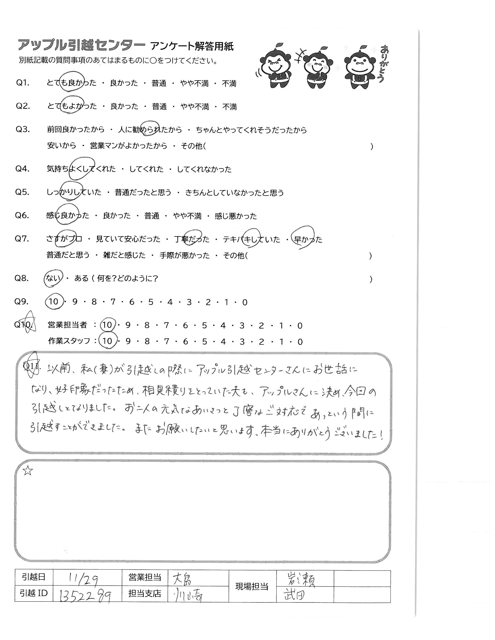 A.お値段以上のサービスをしていただき、大満足です。立ち会ってくれた家族も、今後引っ越す機会があれば、アップルにお願いしたいと言っていました。