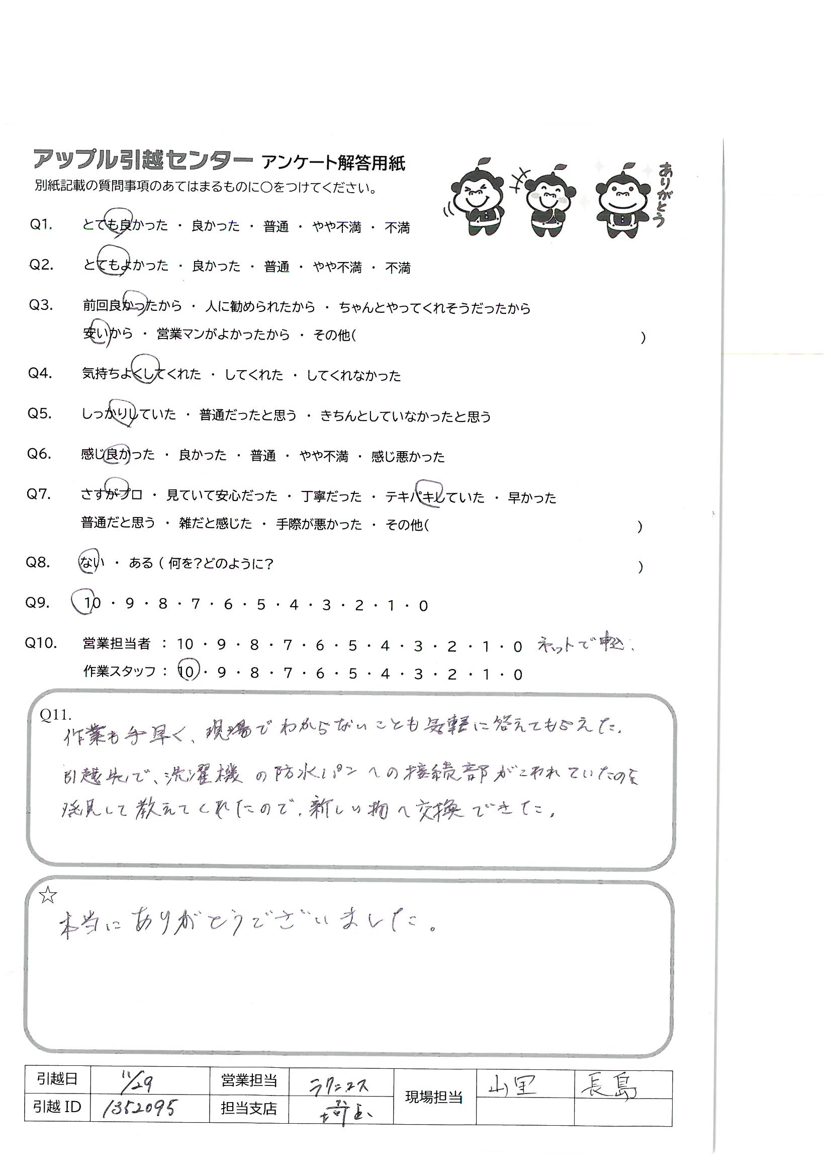 A.・もう少し安くできたのかな?と思うところ ・とても話しやすくて良かった。Q7のところで気付いた時につたえてもらえるとまた良かったしうれしかった。後の不安等もなかったのかとも思えました。 ・TV等の配線ありがとうございました。4Fまでご苦労様でした。