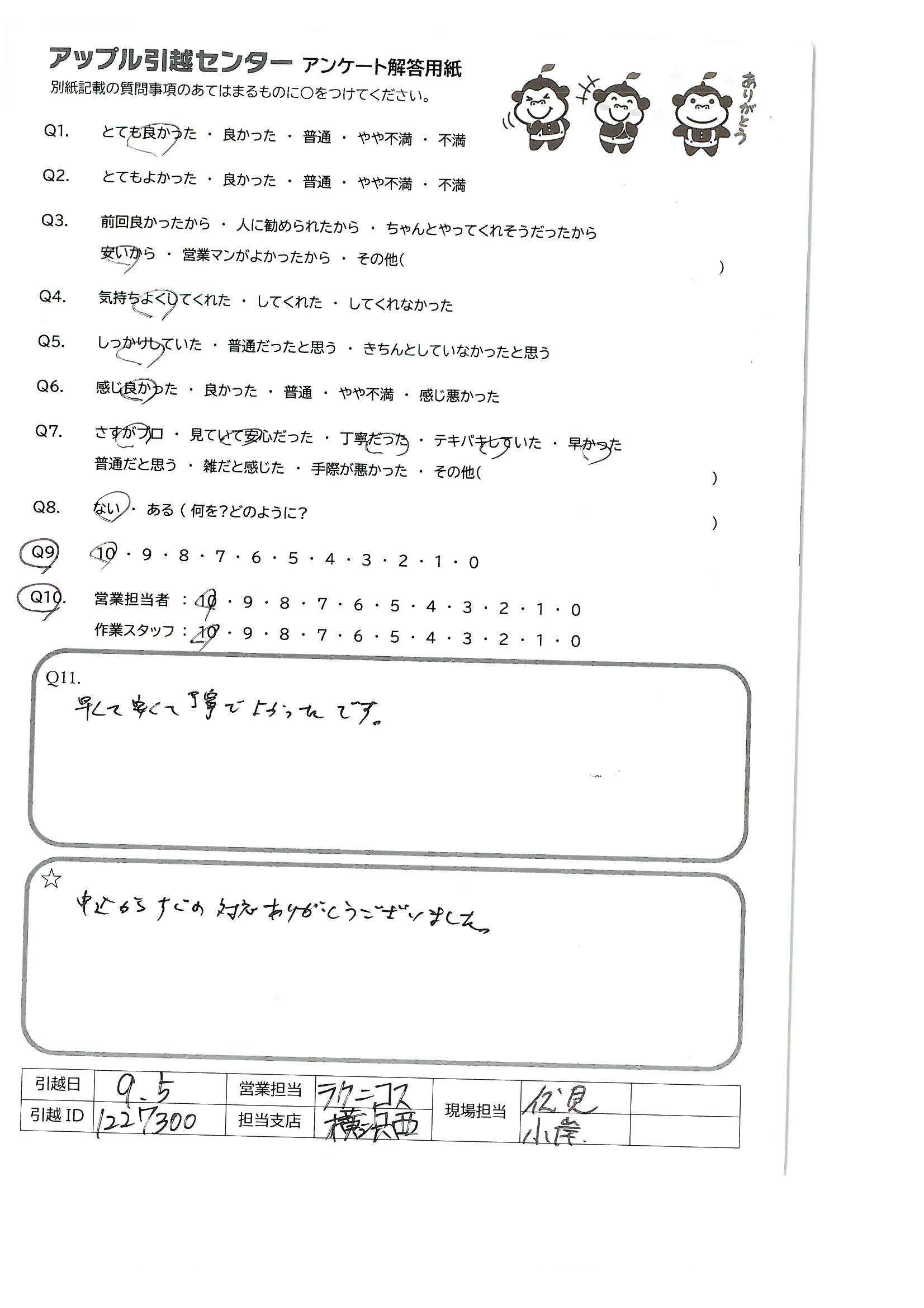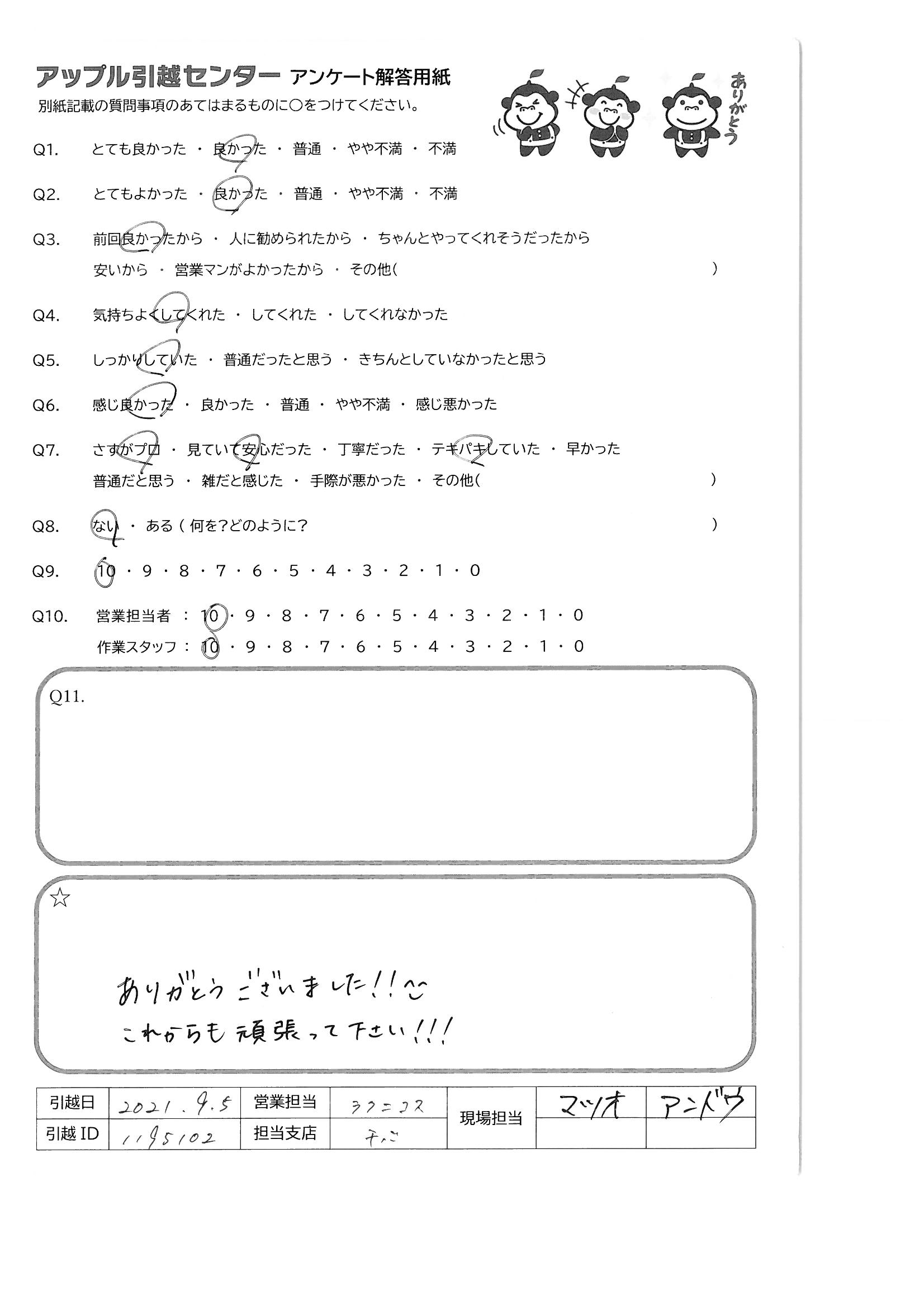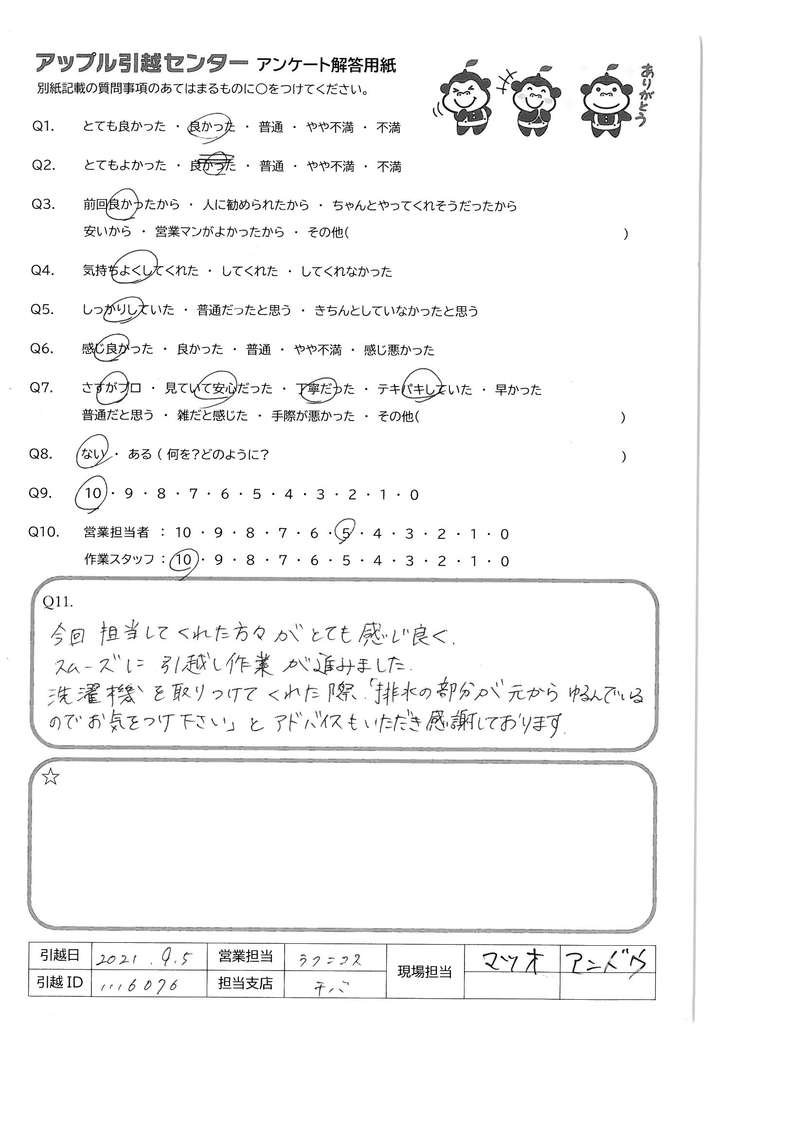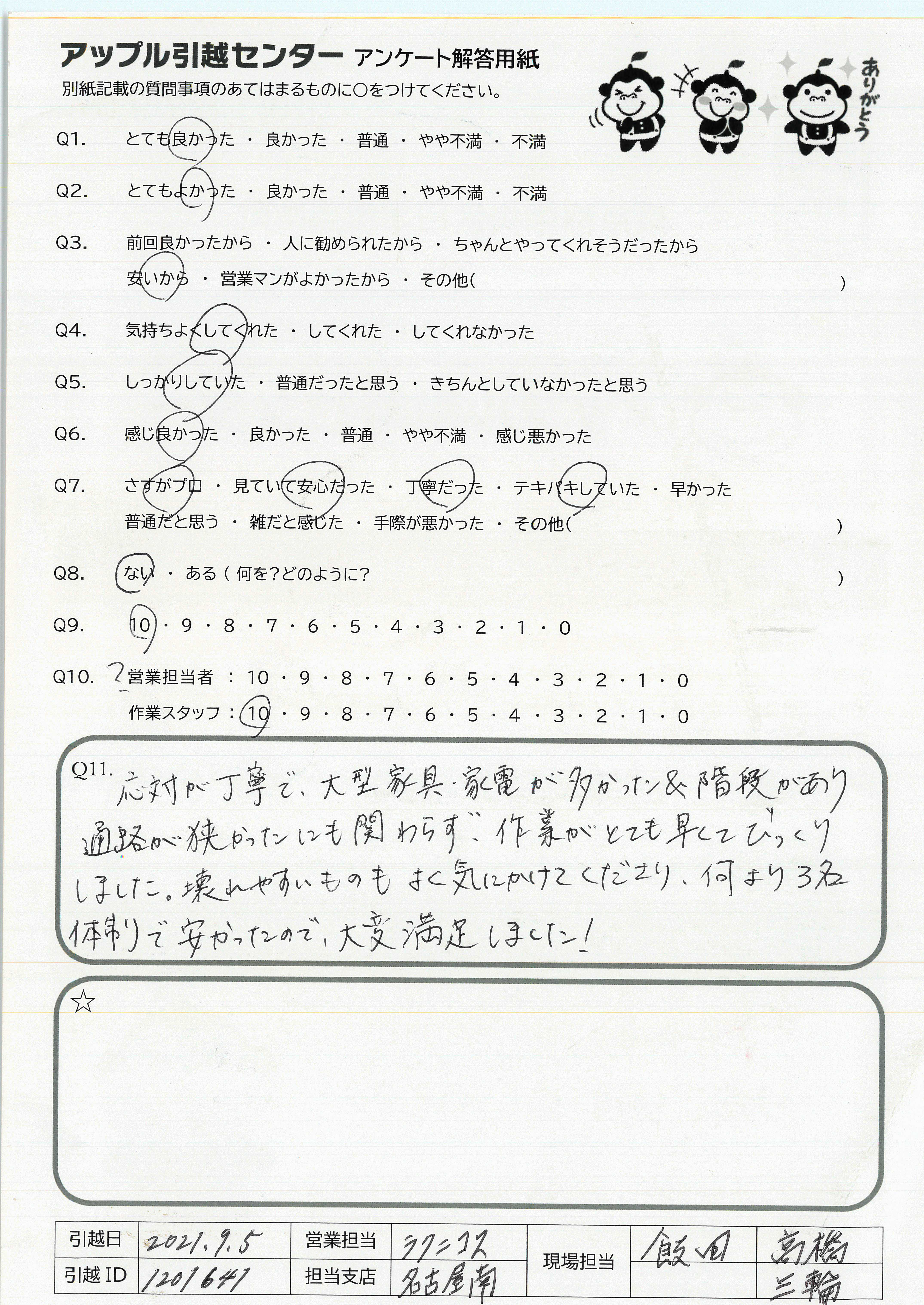 A.2021/09/05にご担当いただいた 飯田さん、高橋さん、三輪さん 本当にありがとうございました! 皆さんの親切で丁寧な仕事に 心から感動いたしました! 人生初の引っ越しでしたが、 とてもいい思い出になりました! 無事引っ越しを終えることができ 私も妻もこのスタッフさんたちが 担当してくれてよかったと思っております!