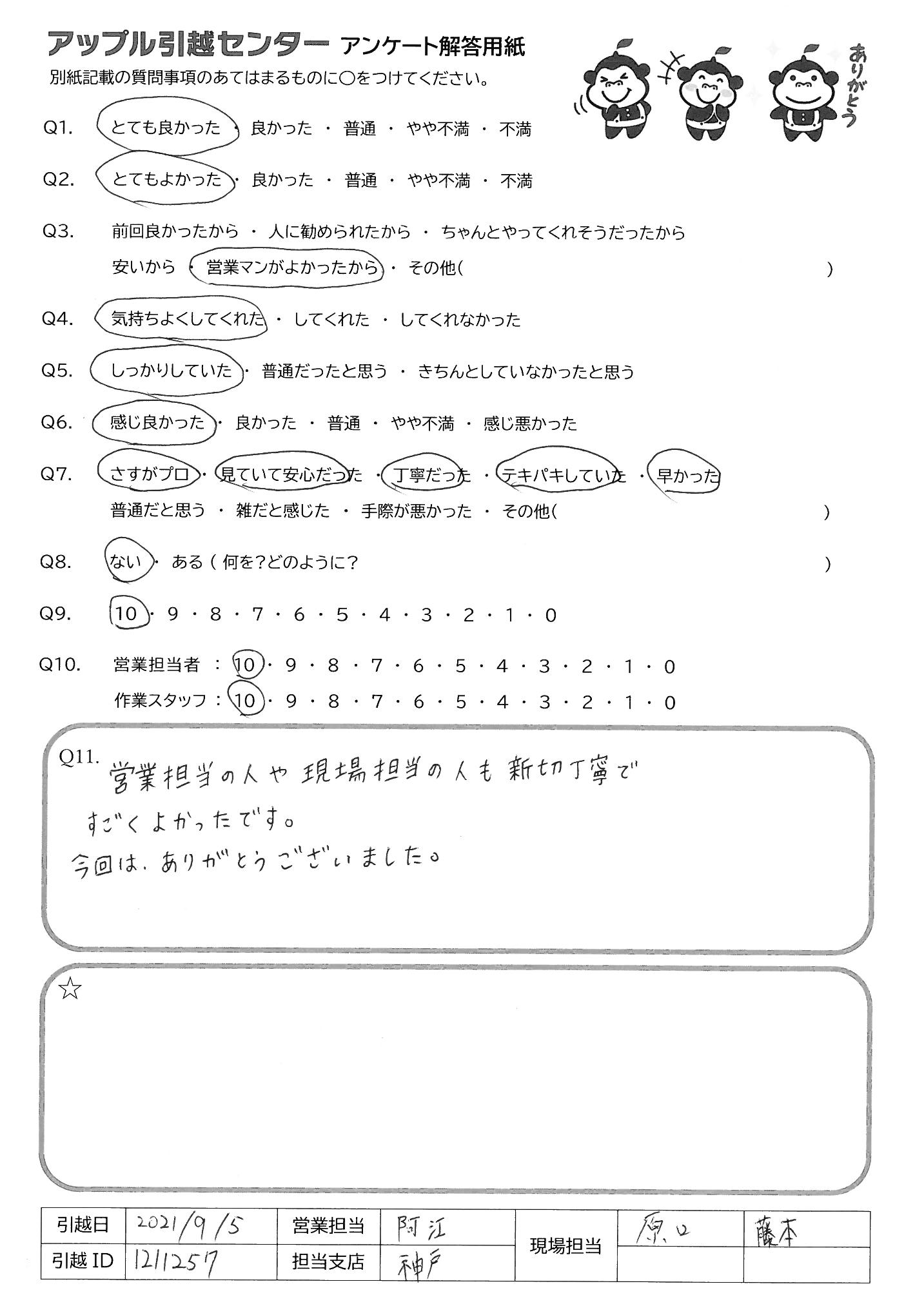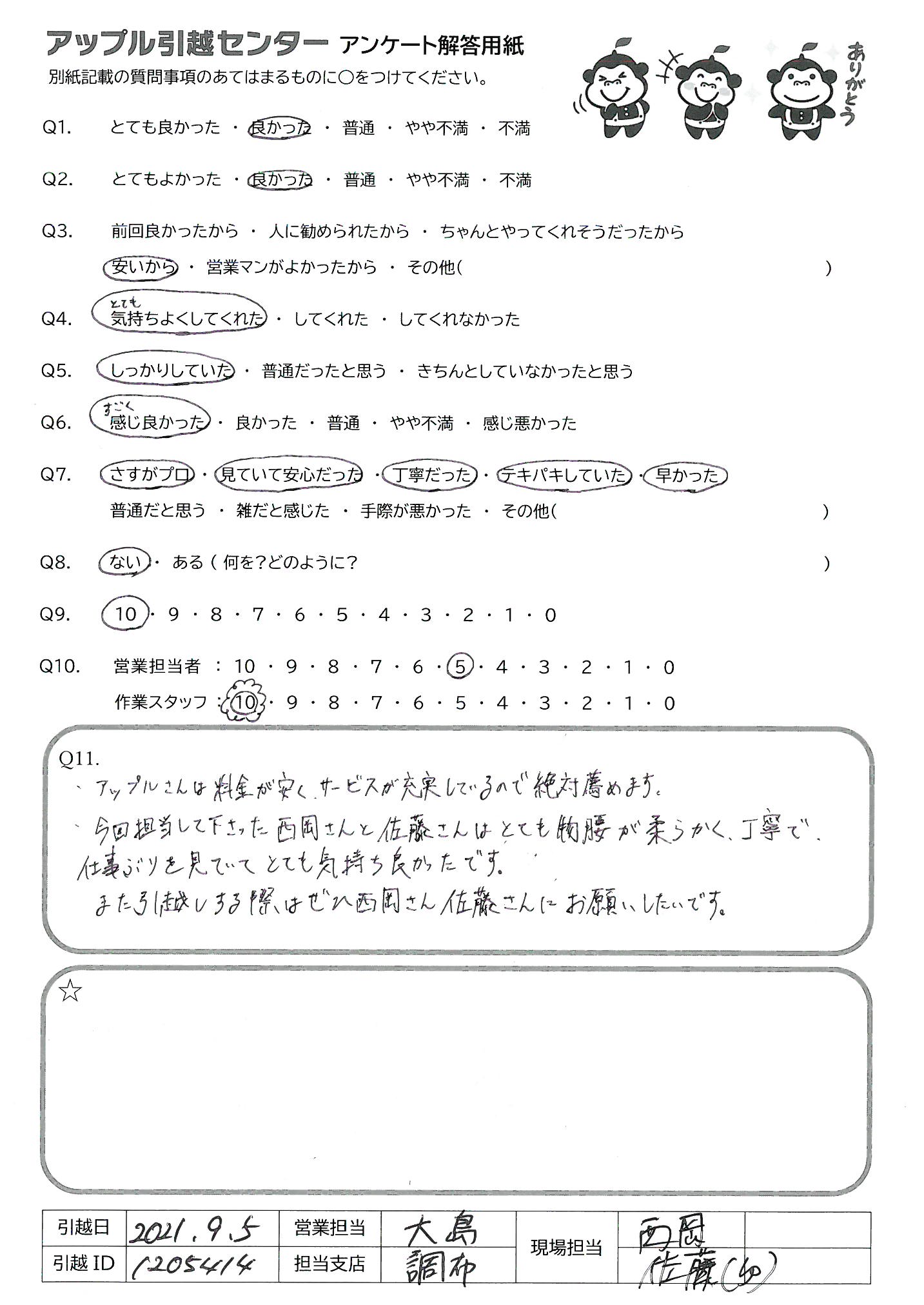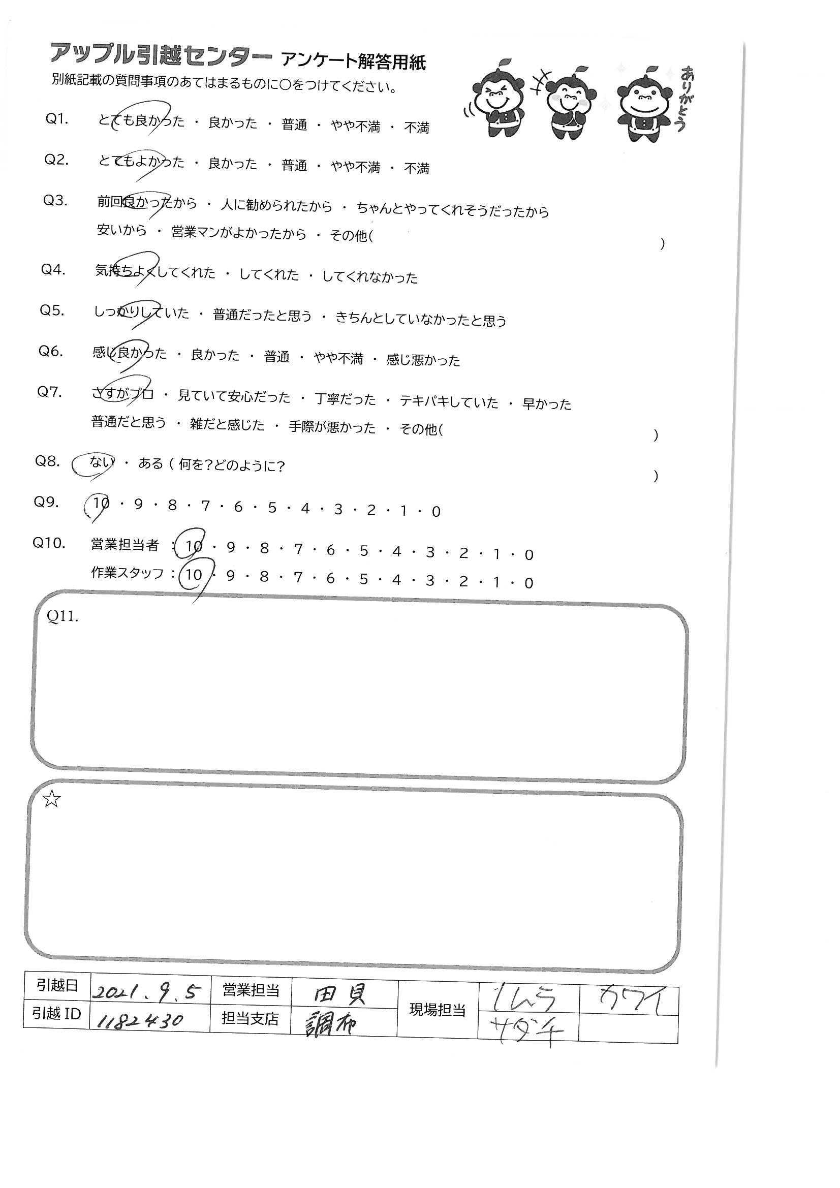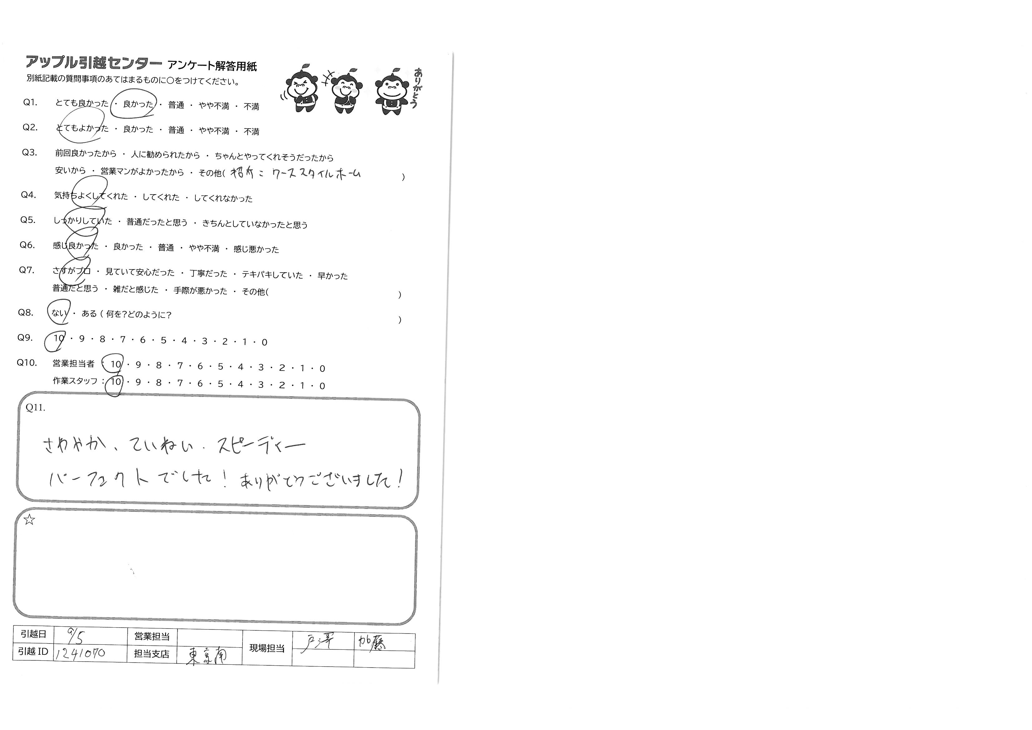 A.2021/09/05にご担当いただいた 飯田さん、高橋さん、三輪さん 本当にありがとうございました! 皆さんの親切で丁寧な仕事に 心から感動いたしました! 人生初の引っ越しでしたが、 とてもいい思い出になりました! 無事引っ越しを終えることができ 私も妻もこのスタッフさんたちが 担当してくれてよかったと思っております!