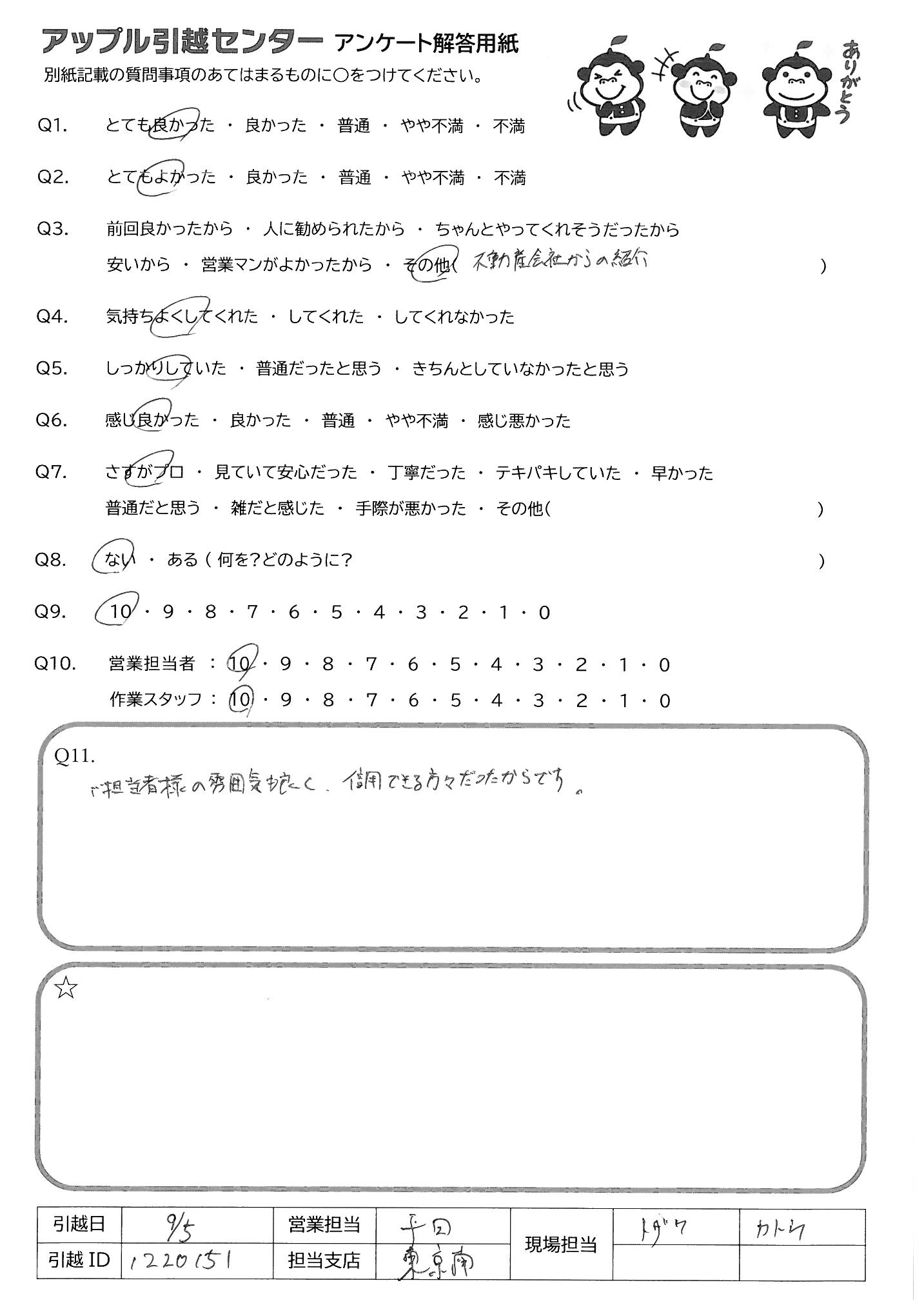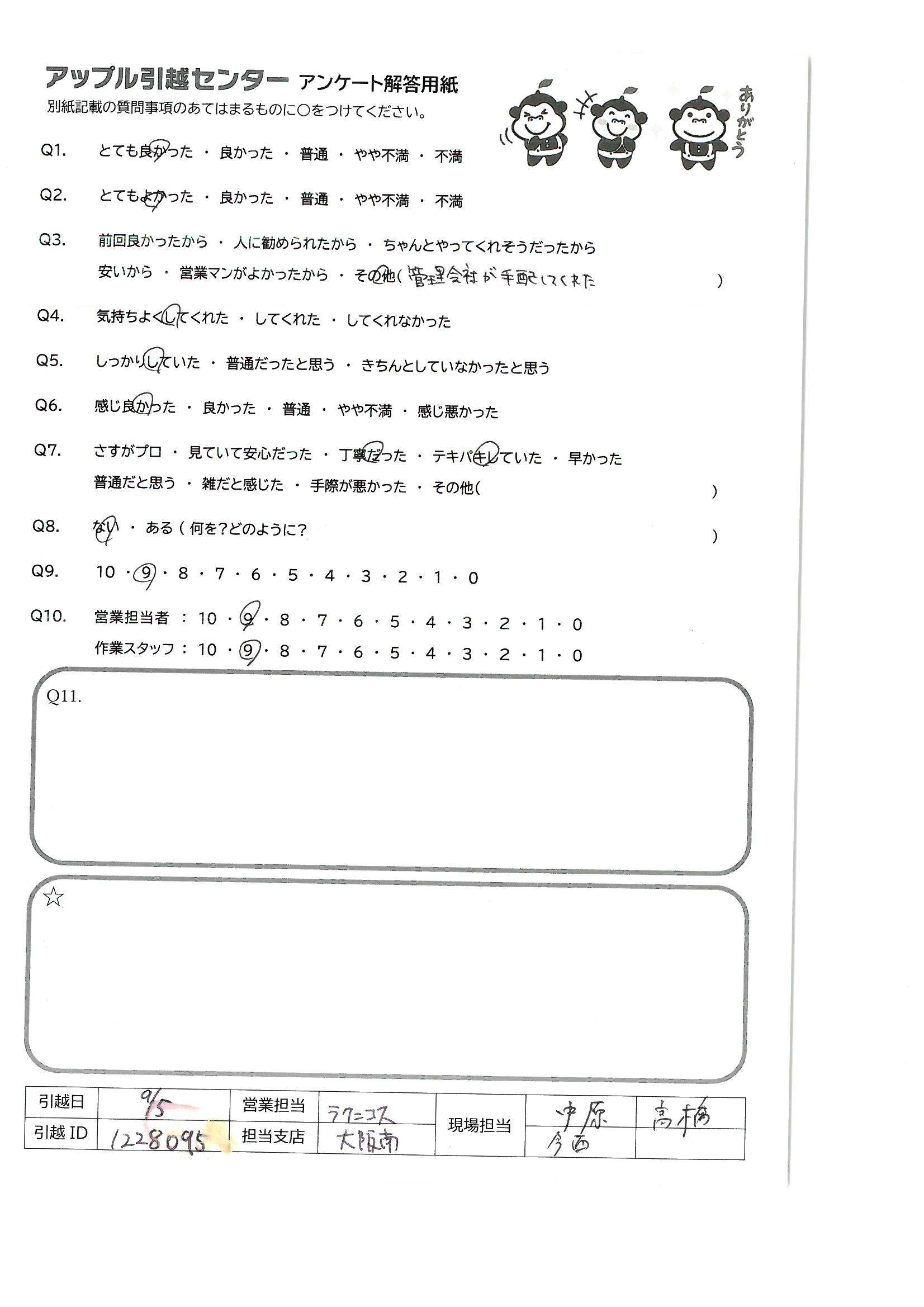 A.・アップルさんは料金が安く、サービスが充実しているので絶対進めます。 ・今回担当して下さった西岡さんと佐藤さんはとても物腰が柔かく、丁寧で仕事ぶりを見ていてとても気持ち良かったです。 また引越しする際はぜひ西岡さん佐藤さんにお願いしたいです。