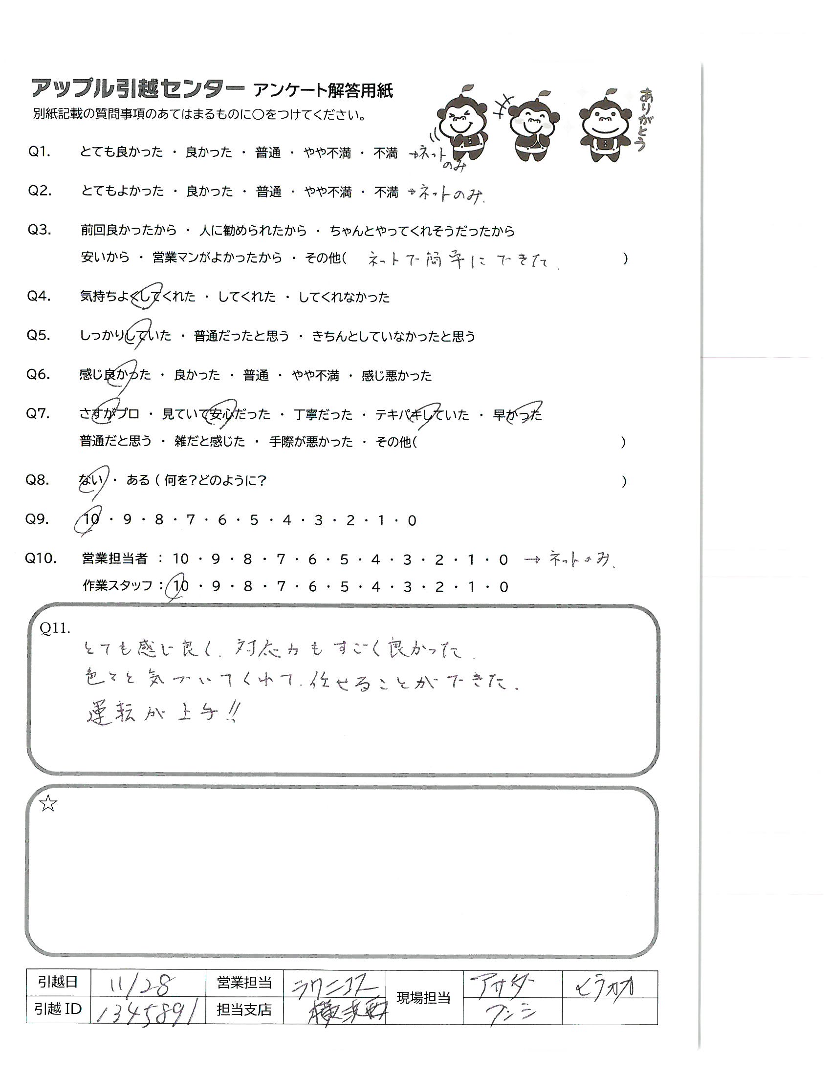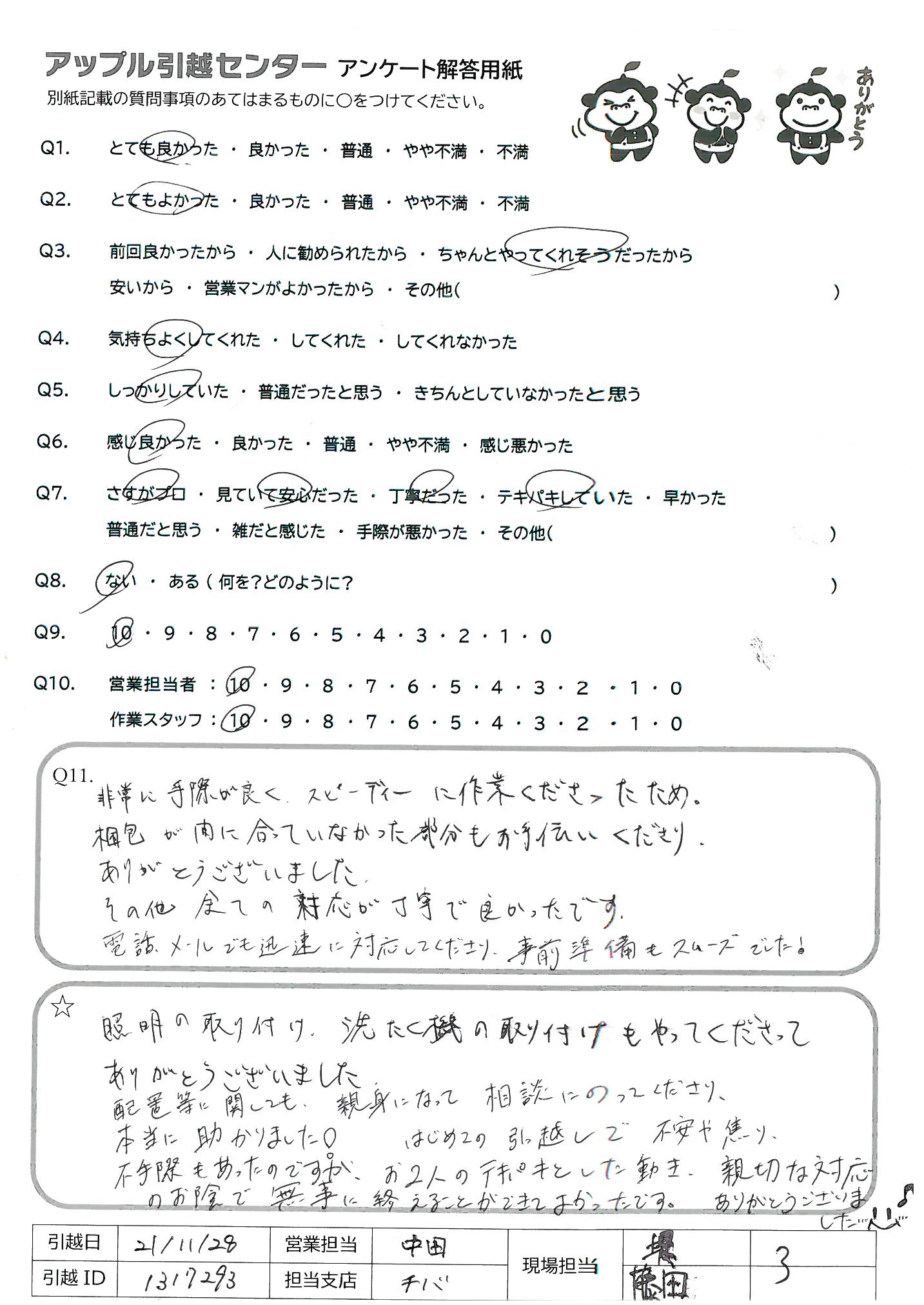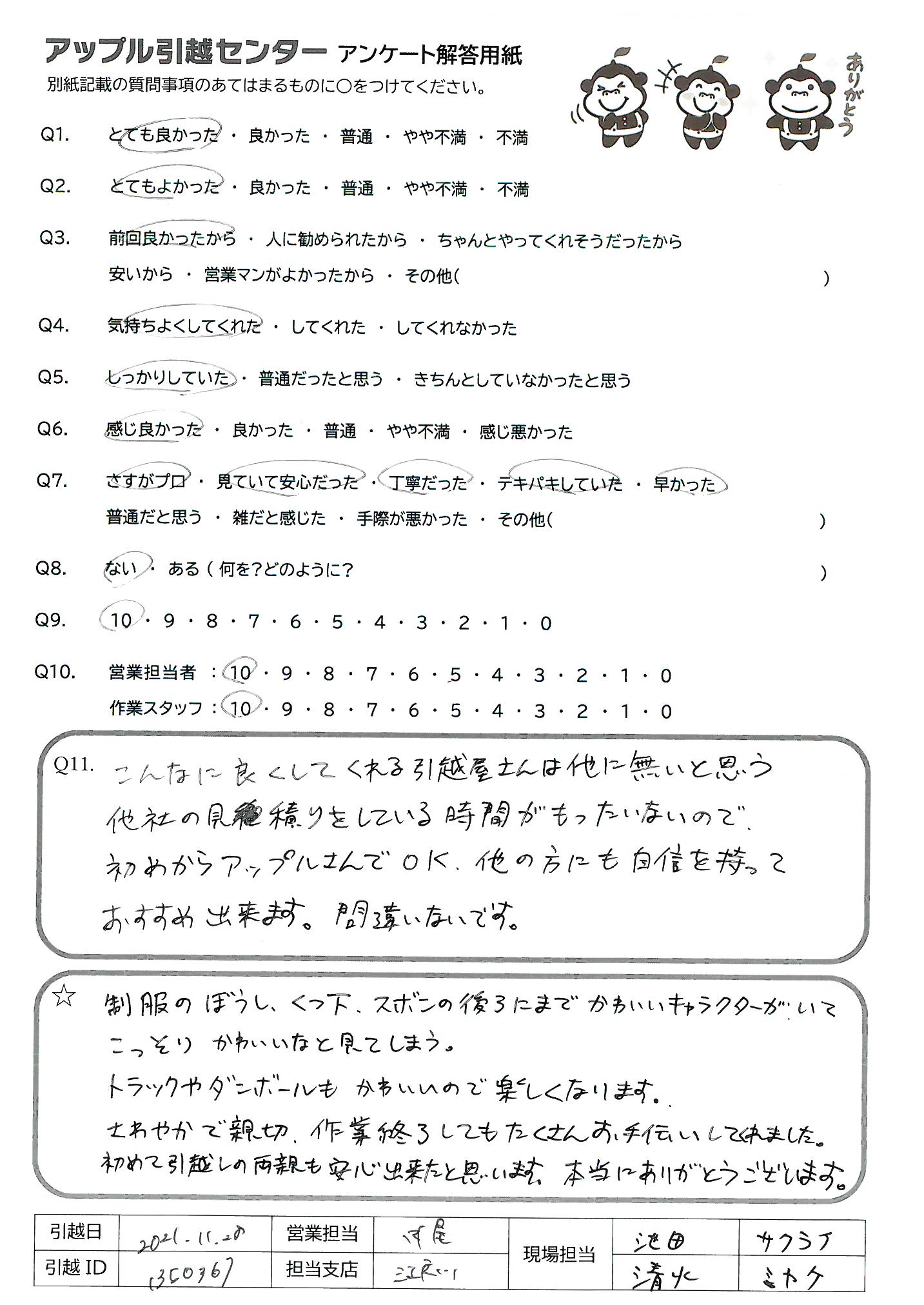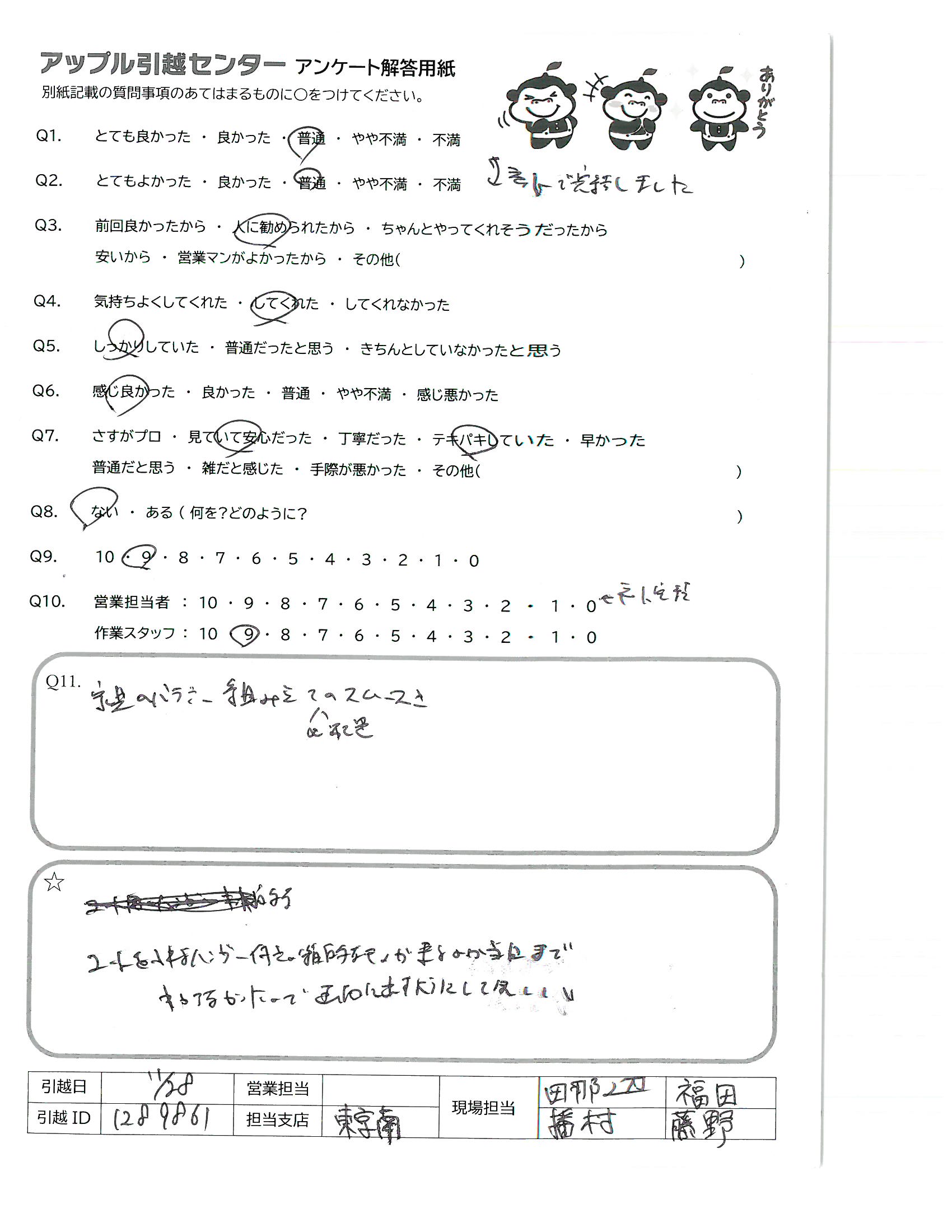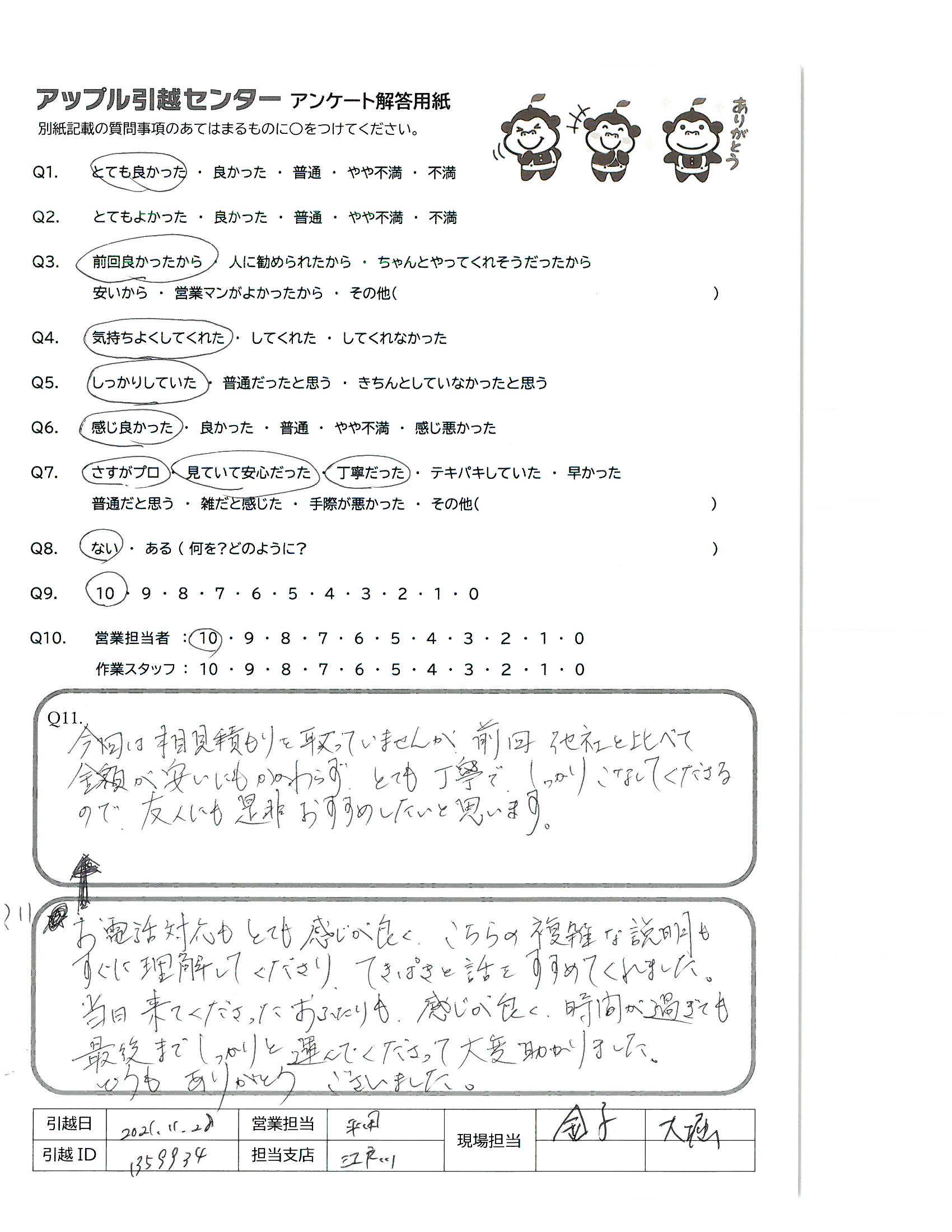 A.非常に手際が良く、スピーディーに作業くださったため。 梱包が間に合っていなかった部分もお手伝いくださり、ありがとうございました。 その他全ての対応が丁寧で良かったです。 電話、メールでも迅速に対応してくださり、事前準備もスムーズでした!