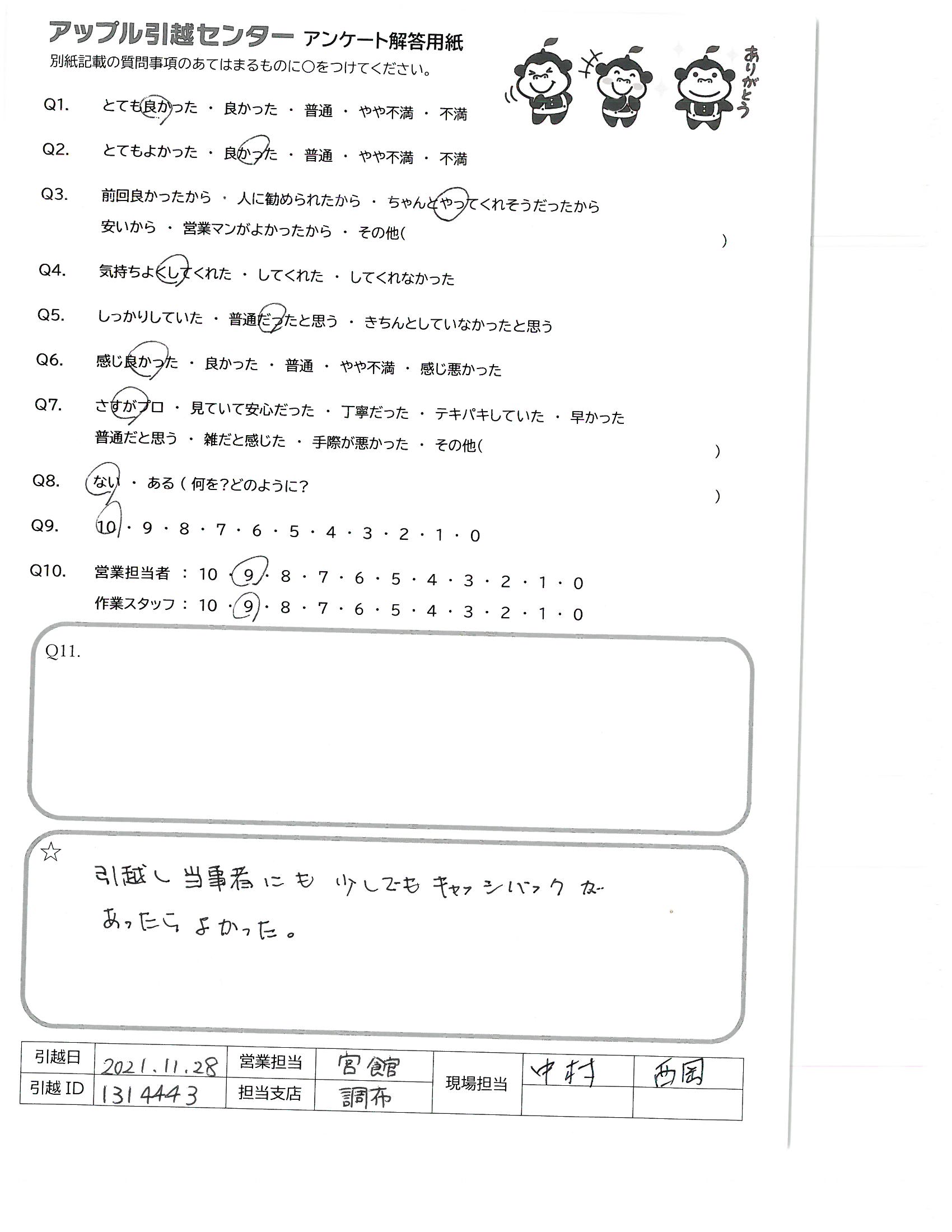 引越し日:2021年11月28日 エリア:神奈川県川崎市中原区