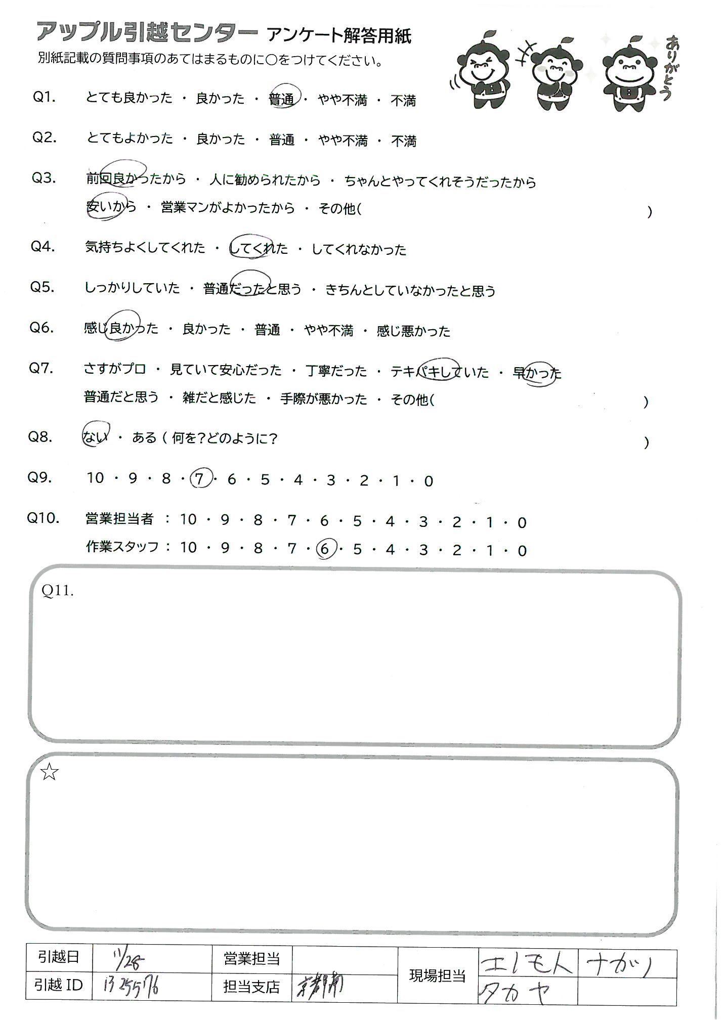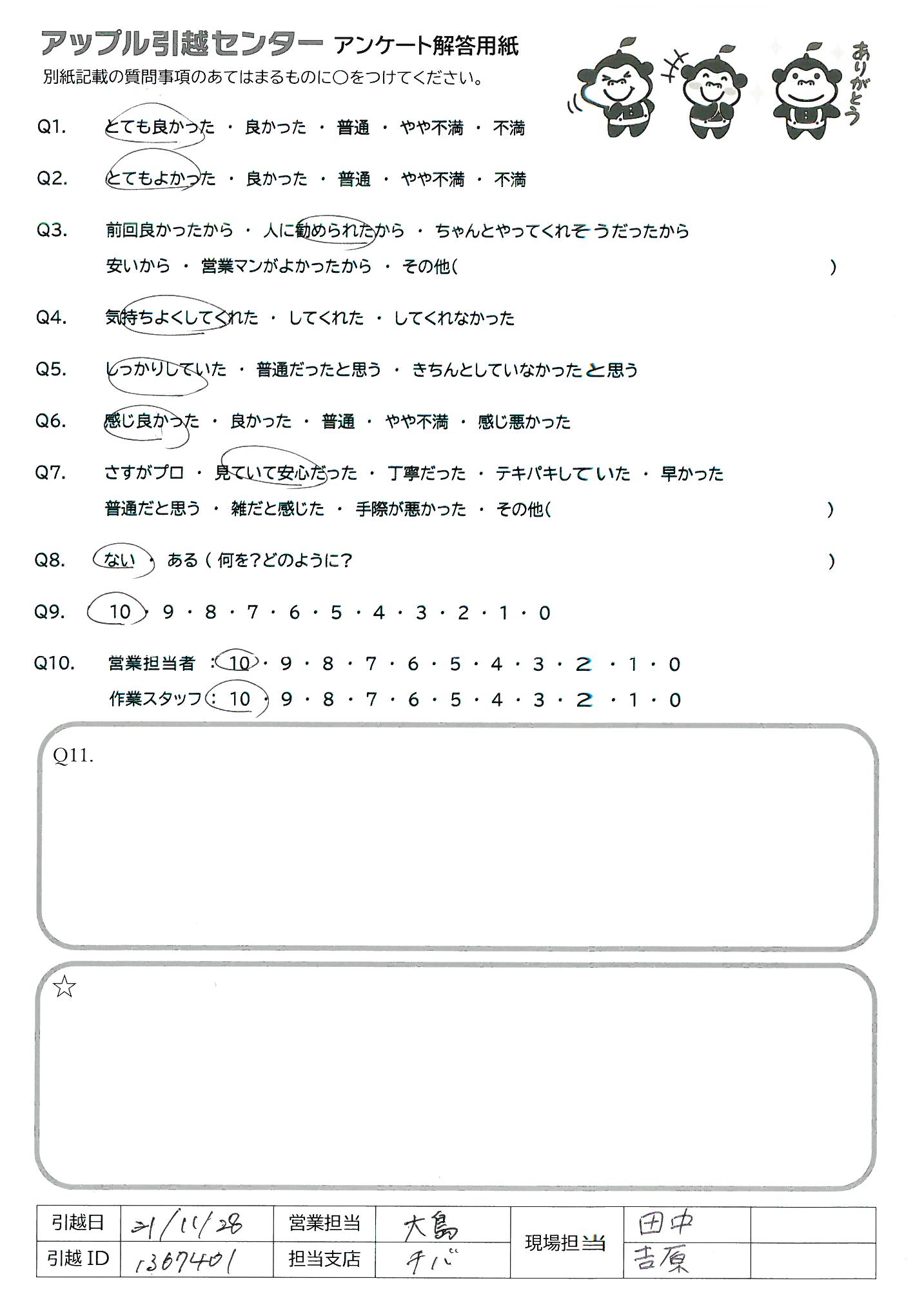 A.ありがとうございました。 今まで利用した引越業者さんのなかで1番良かったです。
