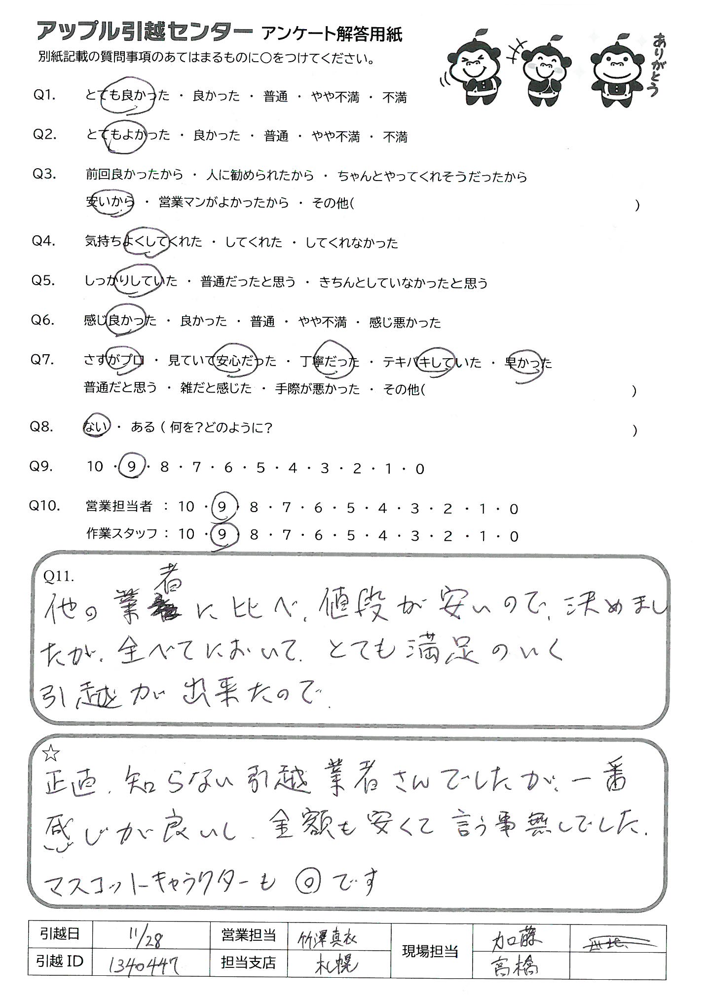 A.他の業者に比べ、値段が安いので、決めましたが全べてにおいてとても満足のいく引越が出来たので。