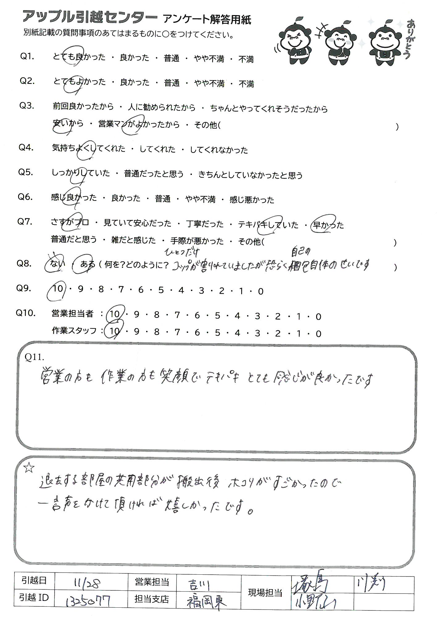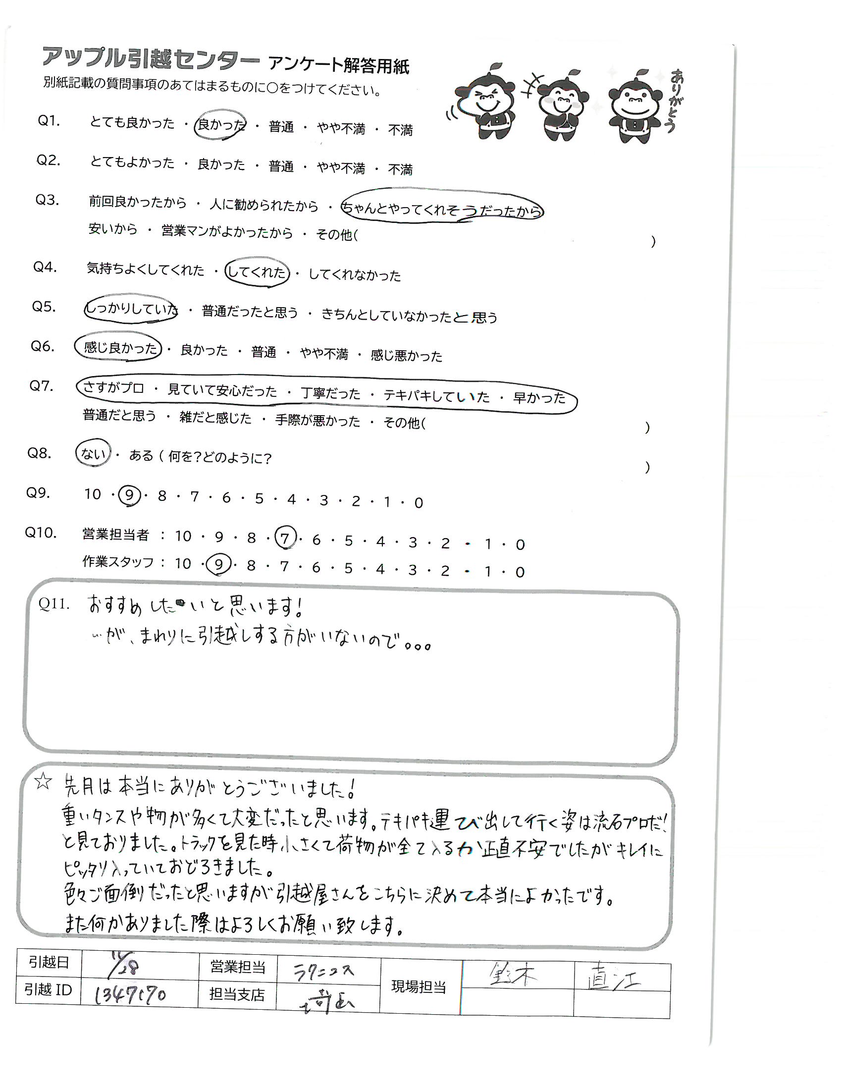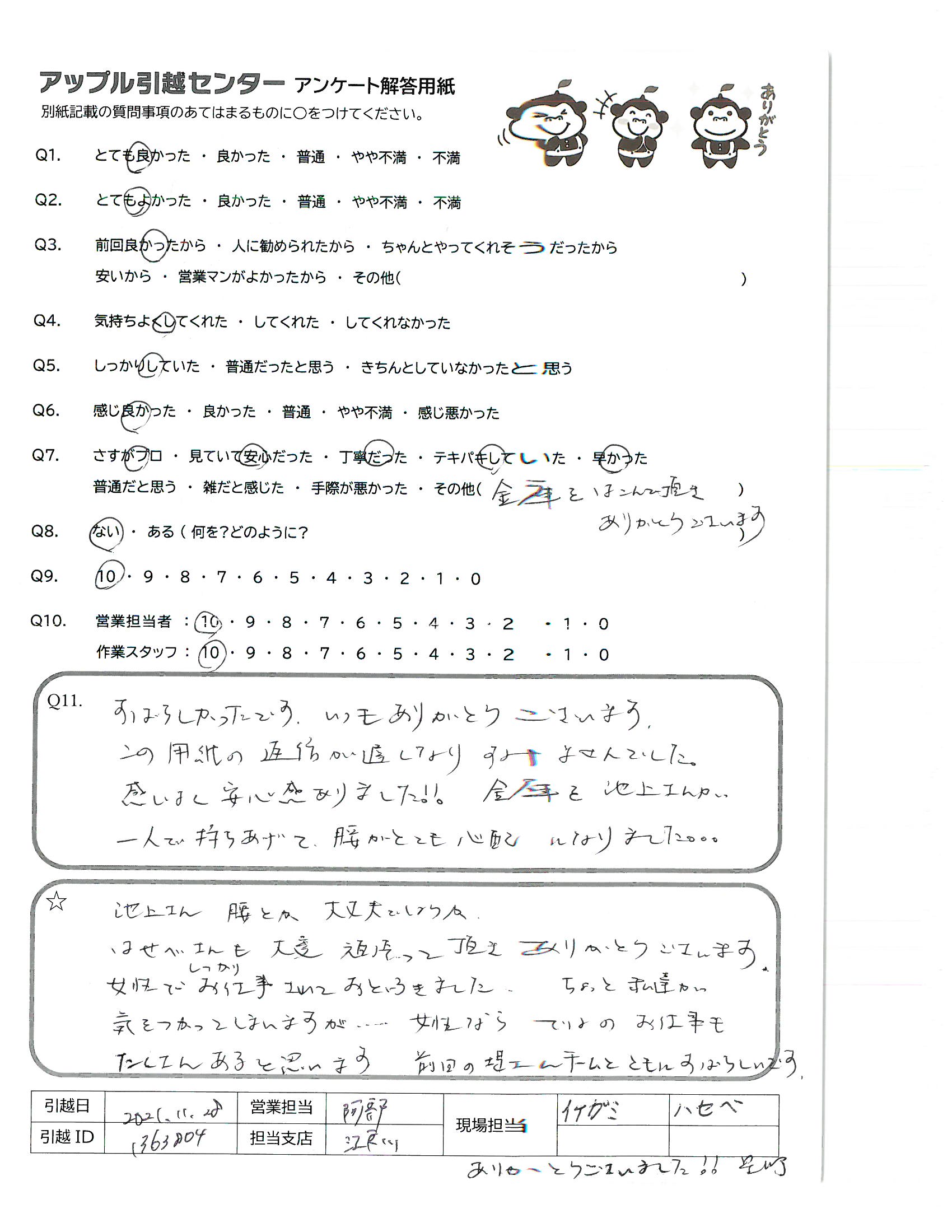 A.すばらしかったです。いつもありがとうございます。 この用紙の返信が遅くなりすみませんでした。 感じよく安心感ありました!!金庫を池上さんが一人で持ちあげて、腰がとても心配になりました。。。