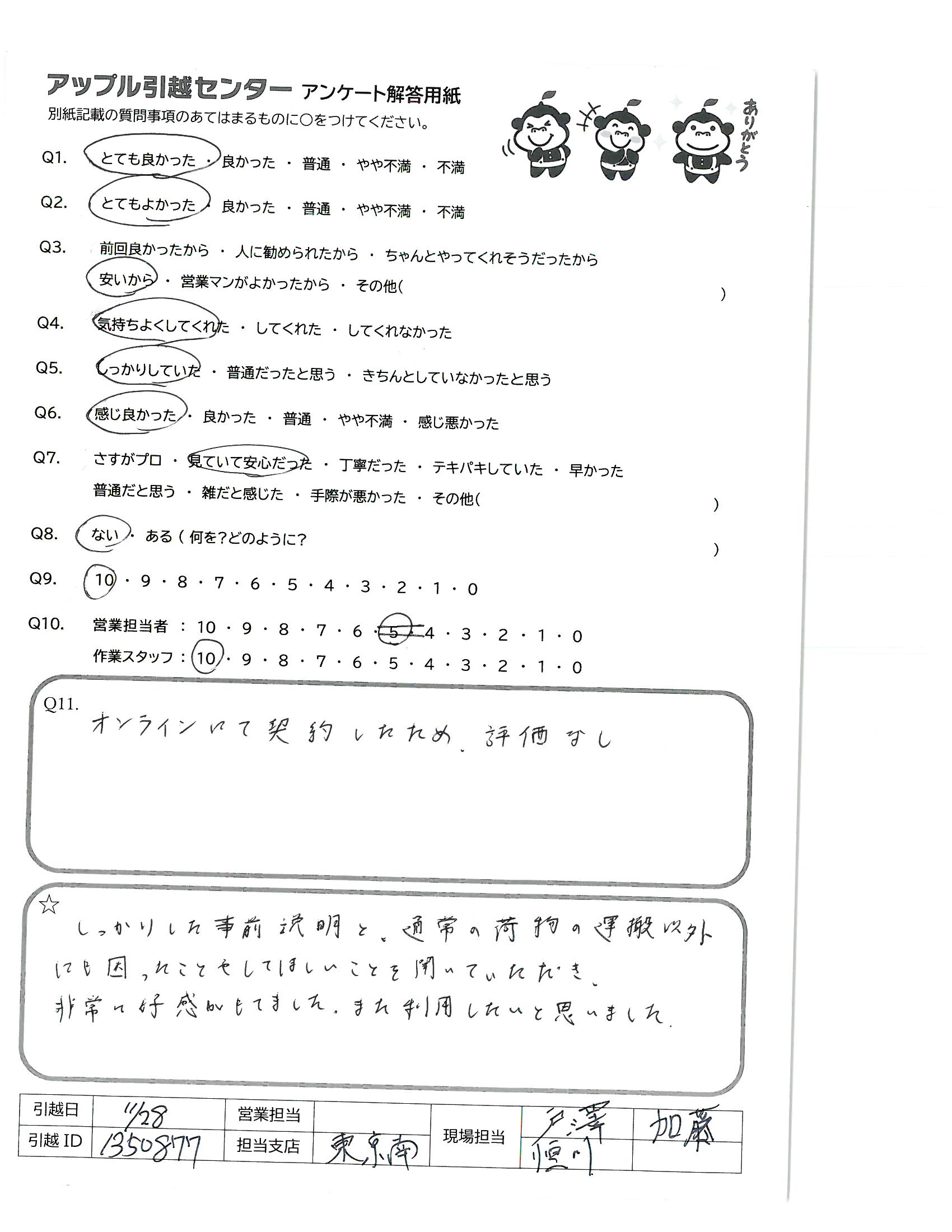 A.営業さんは他社さんにはない丁寧さと誠実さが感じられました。 リモートでの見積もりでしたが、とても安心出来ました。 他社さんはただ見積もりを出して終了でしたが、こちらの営業さんはスタッフの人柄の良さをしっかり伝えてくださったので決め手となりました。 作業スタッフさんは大変な中、嫌な顔ひとつせず元気に対応して下さって感謝しかありません。 特にリーダーの方が素晴らしく、とても気が利いて有り難かったです。 また、コールセンターの方も皆さん感じがよく、是非次の引っ越しの際もお願いしたいです。