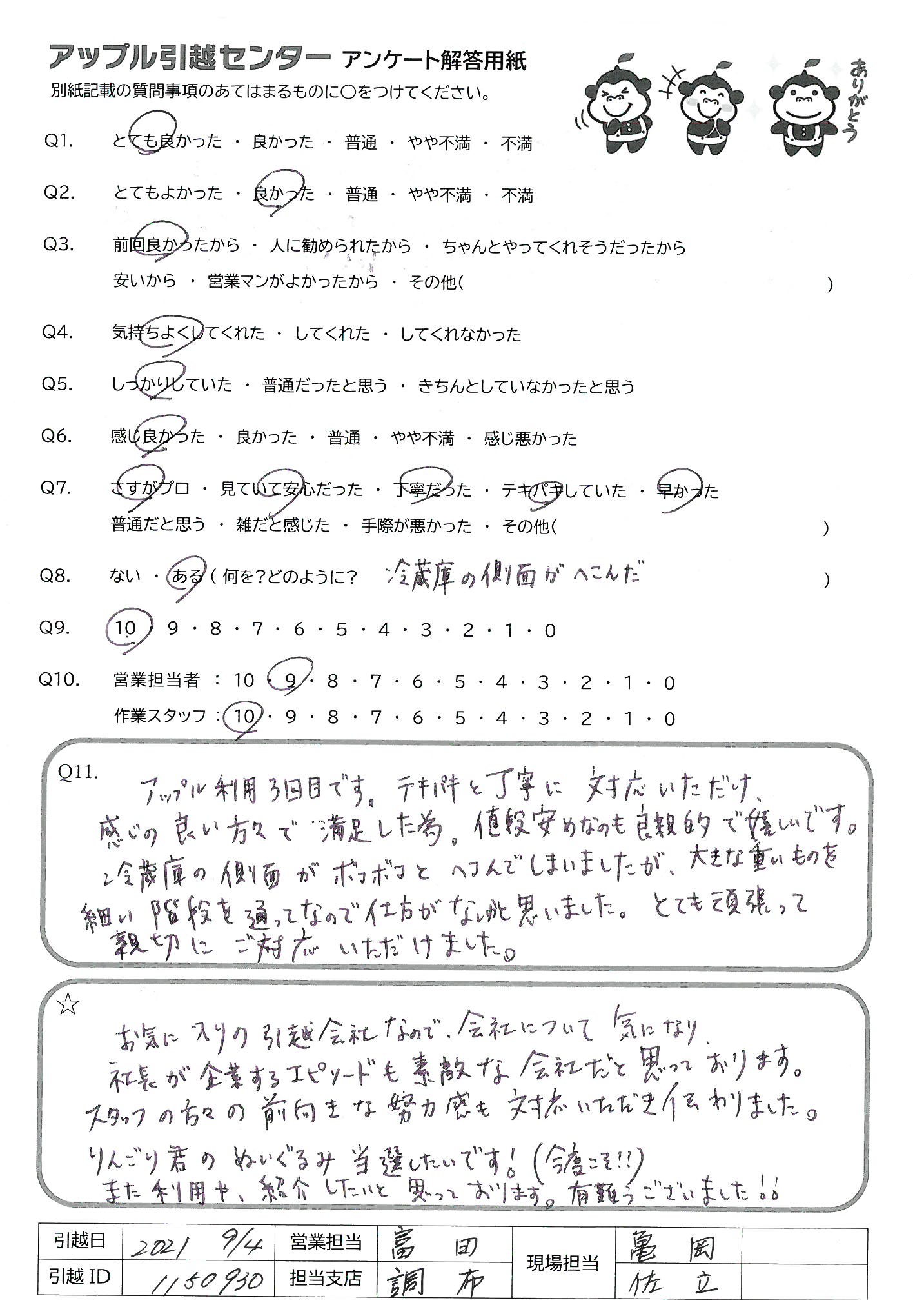 A.アップル利用3回目です。テキパキと丁寧に対応いただけ、感じの良い方々で満足した為。値段安めなのも良親的で嬉しいです。冷蔵庫の側面がボコボコとヘコんでしまいましたが、大きな重いものを細い階段を通ってなので仕方がないかと思いました。とても頑張って親切にご対応いただけました。