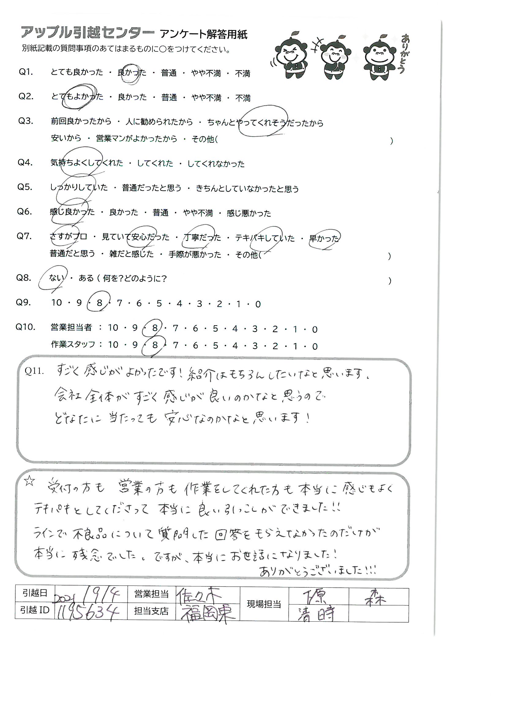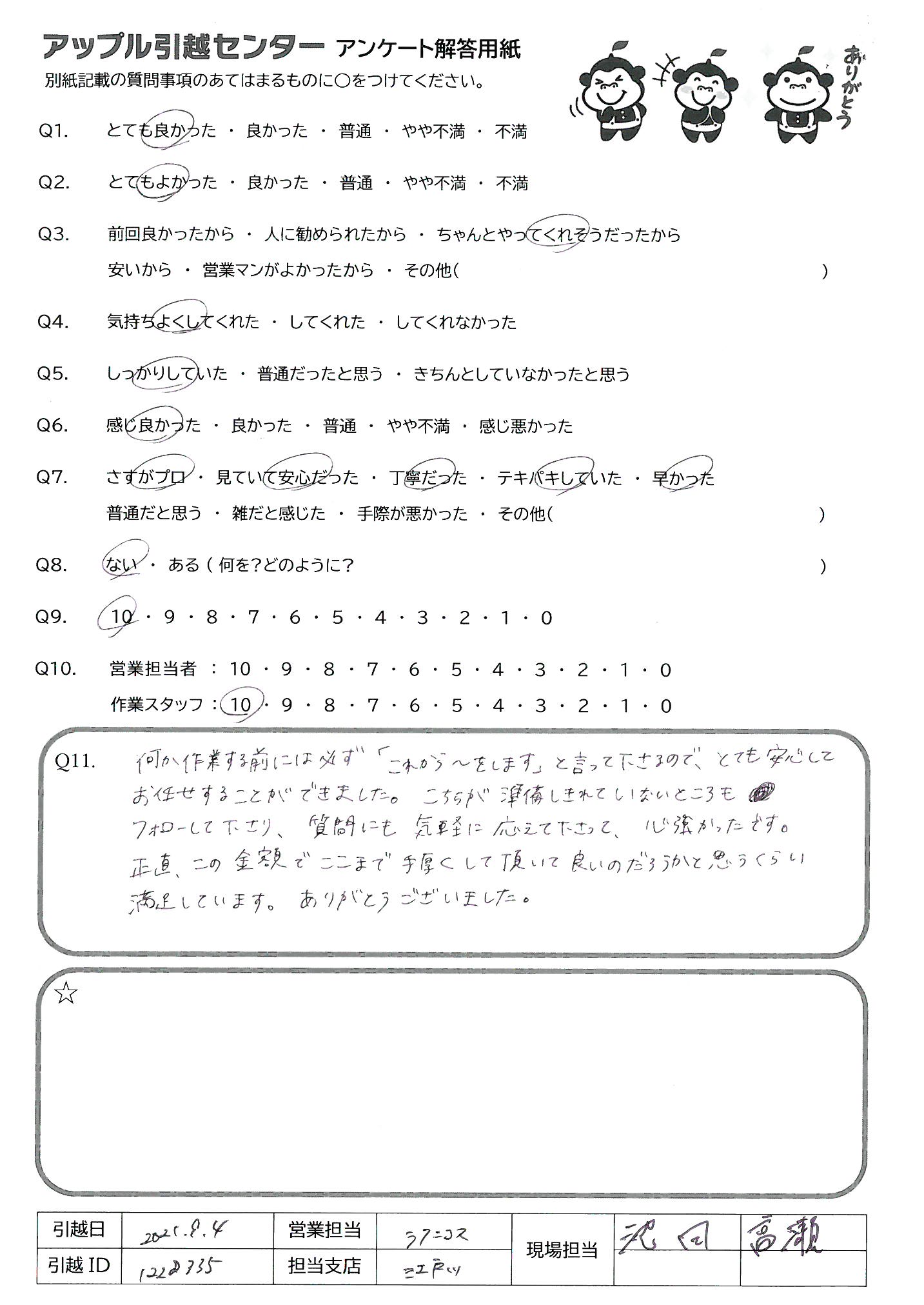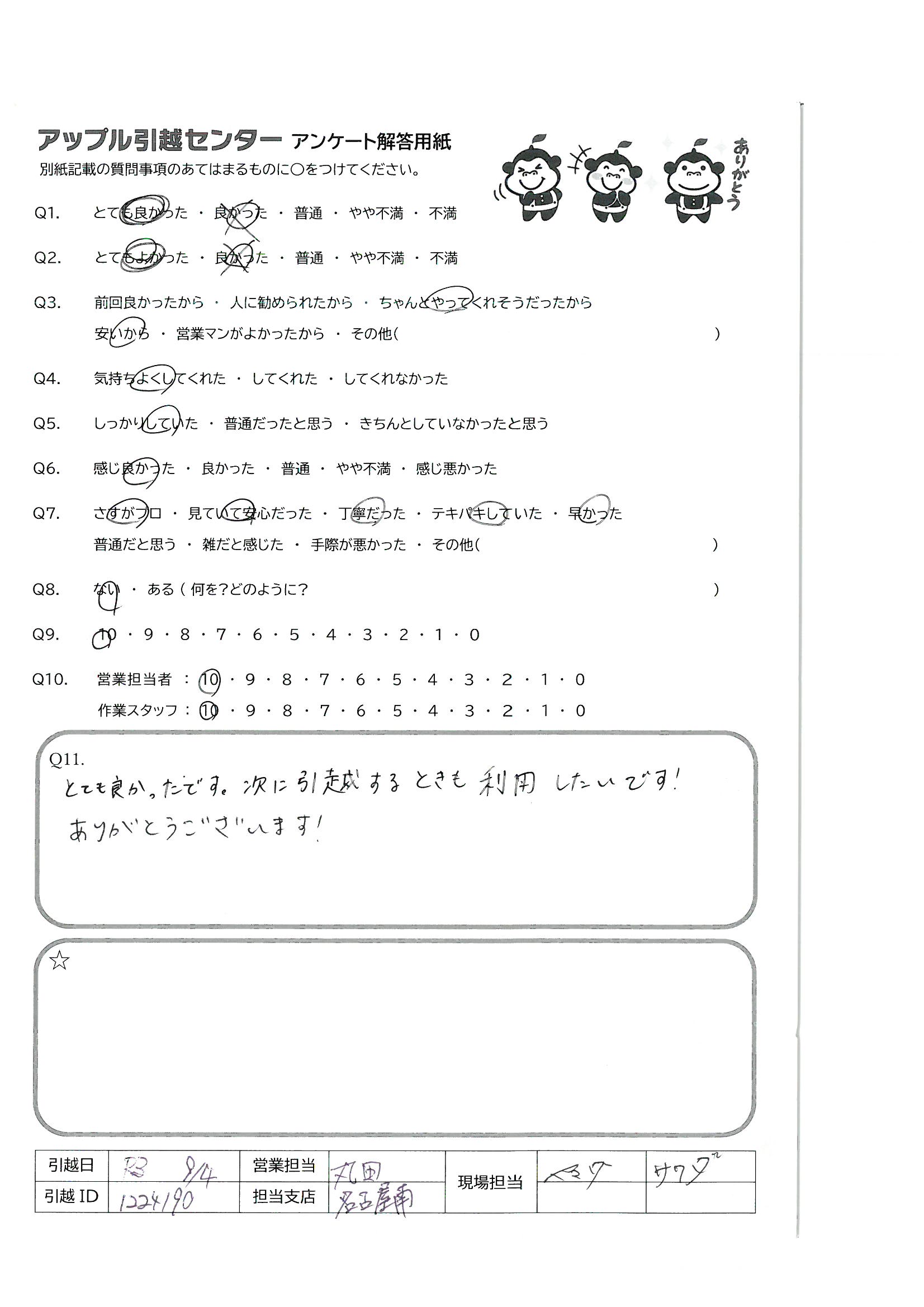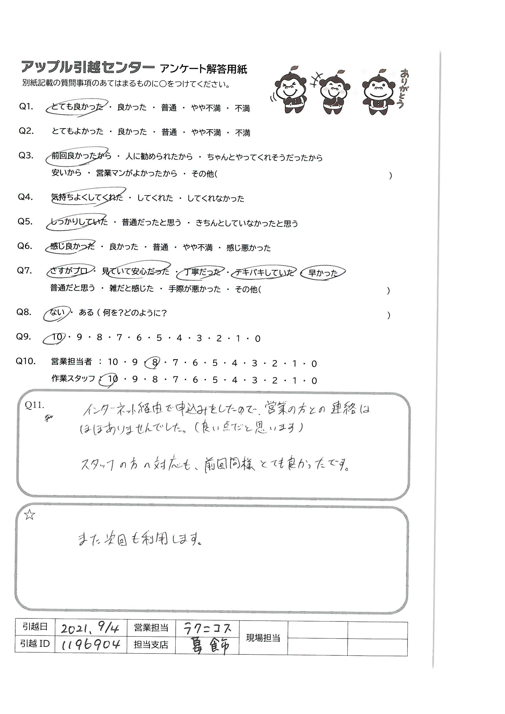 A.仕事の都合でも今まで何回も転居したことはありますが、これまでで1番のサービスだったと感じます!(他社と比較して)また利用させていただきたいですし、家族や知人にもすすめたいと思いました