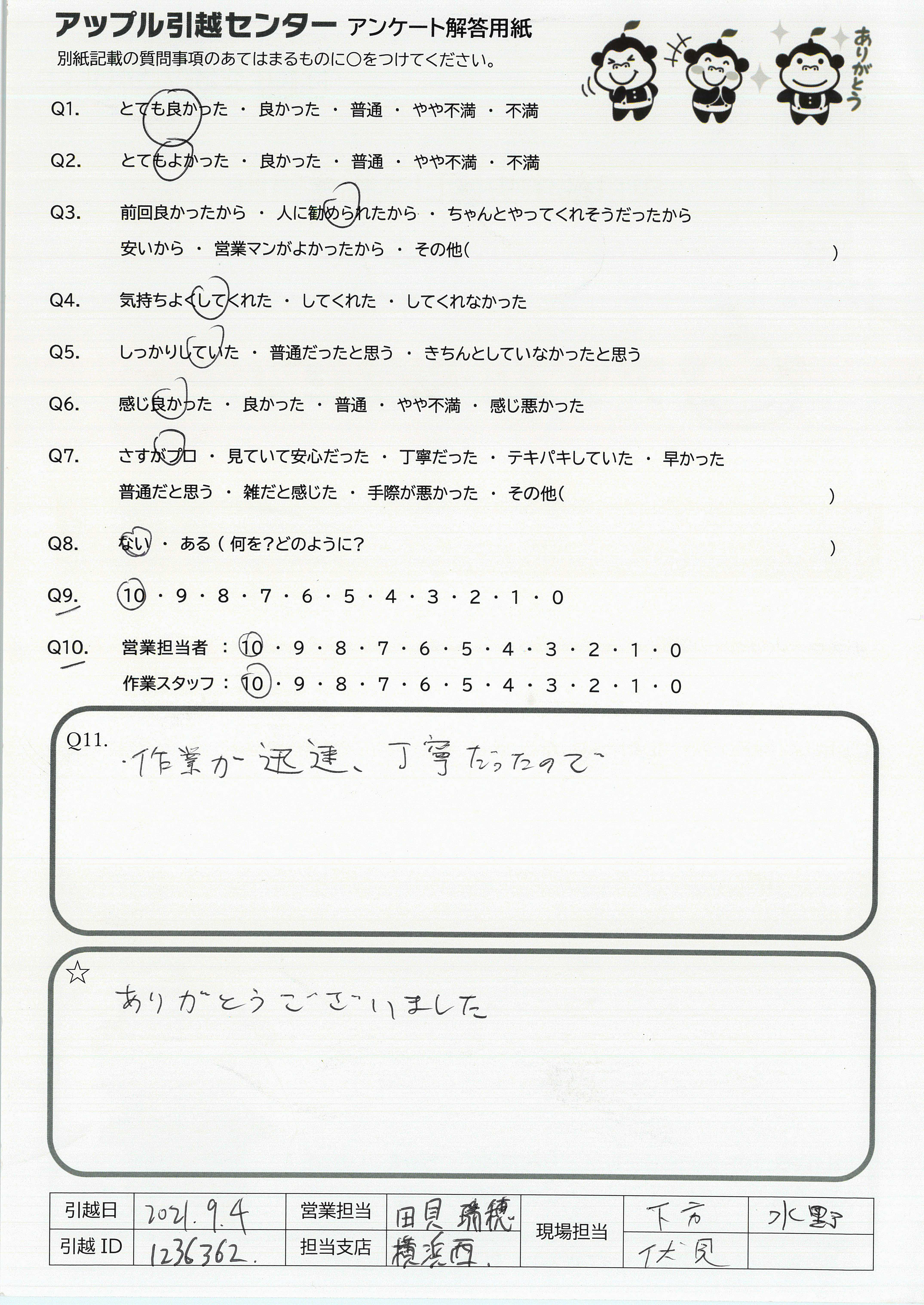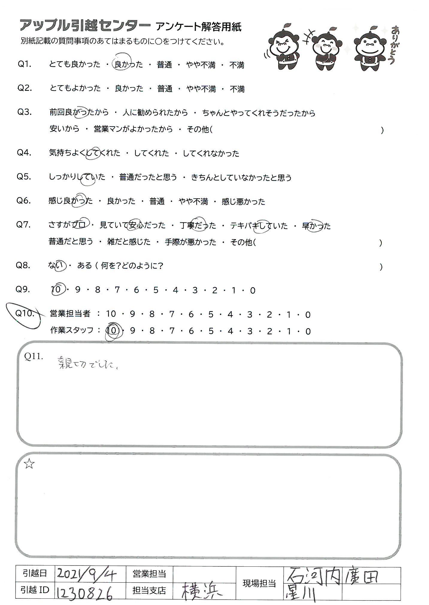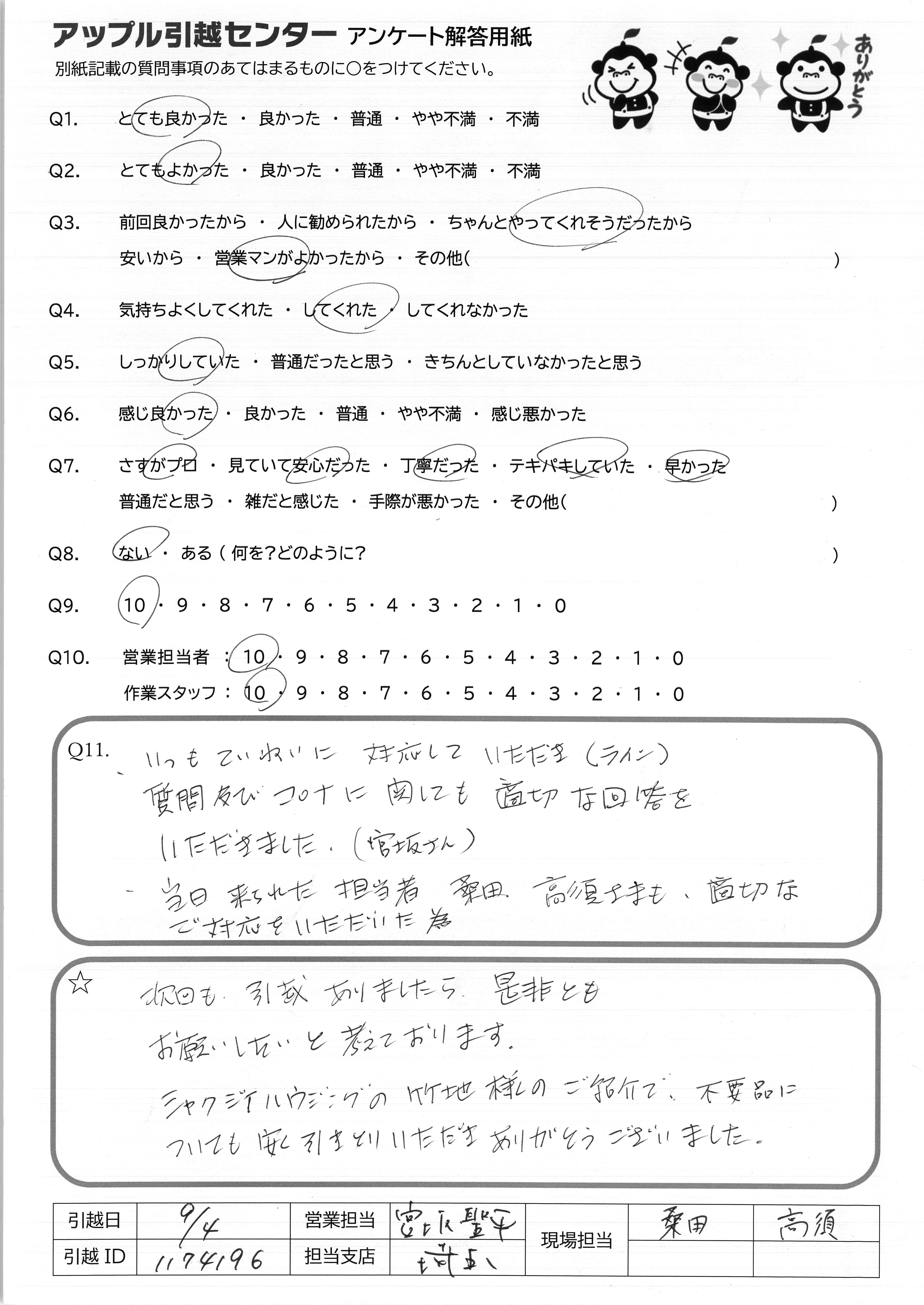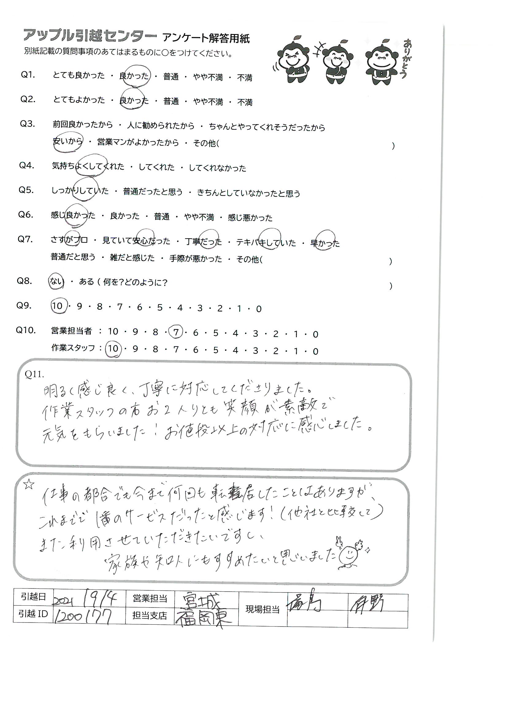 A.仕事の都合でも今まで何回も転居したことはありますが、これまでで1番のサービスだったと感じます!(他社と比較して)また利用させていただきたいですし、家族や知人にもすすめたいと思いました