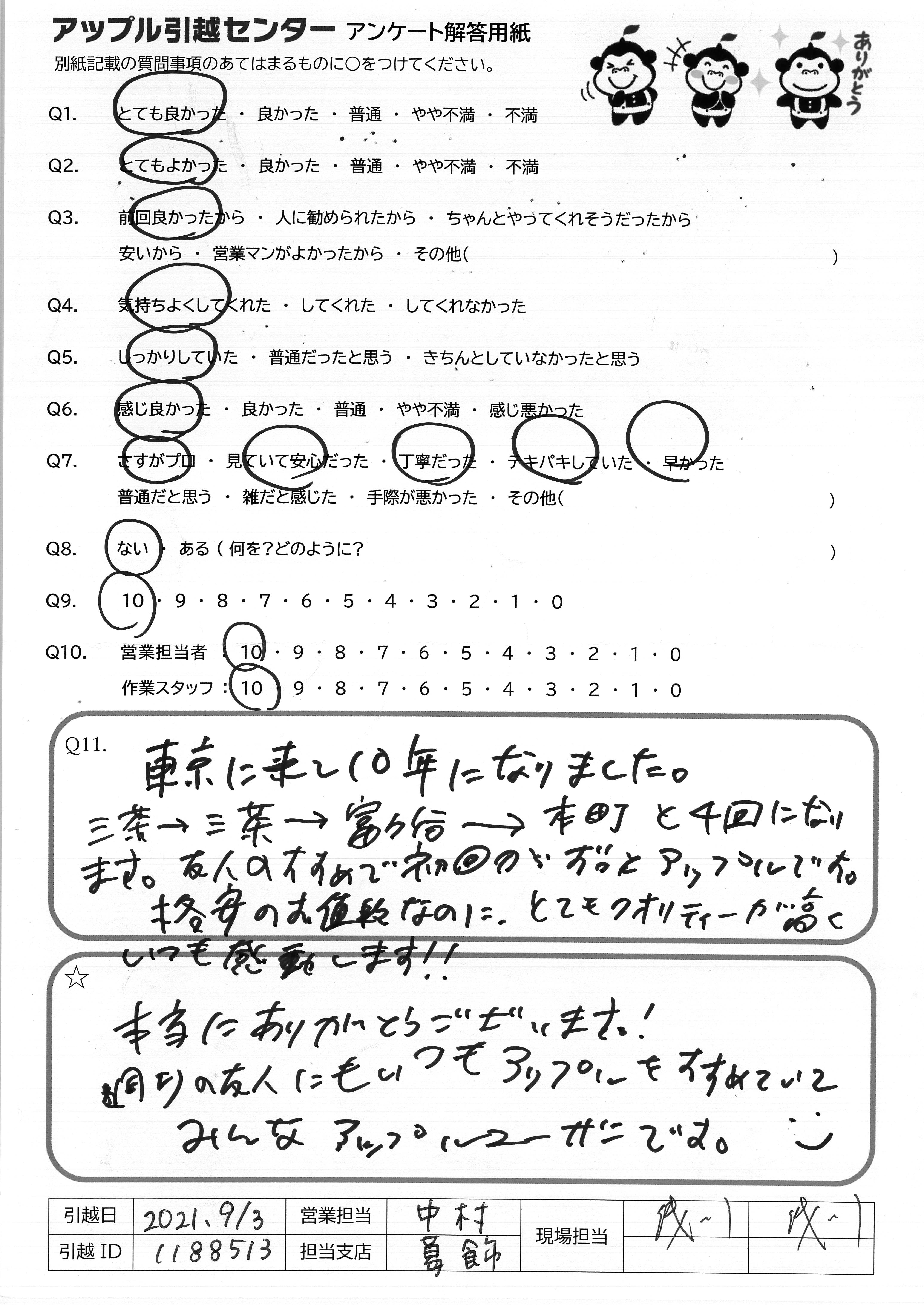 A.東京に来て10年になりました。 三茶→三茶→富ヶ谷→本庁と4回になります。友人のすすめで初回からずっとアップルです。 格安のお値段なのに、とてもクオリティーが高くいつも感動します!!