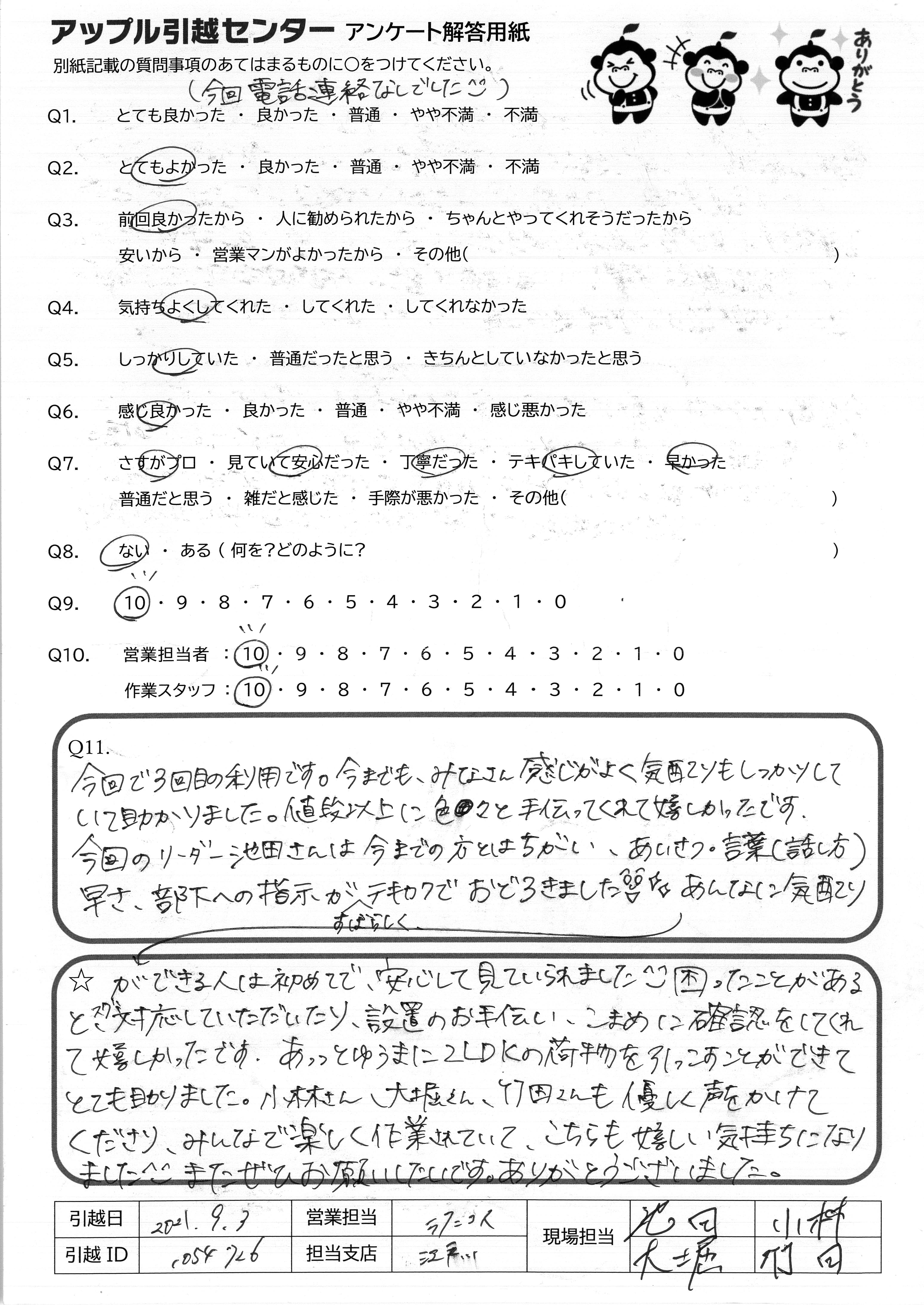 A.今回で3回目の利用です。今までも、みなさん感じがよく気配りもしっかりしていて助かりました。値段以上に色々と手伝ってくれて嬉しかったです。 今回のリーダー池田さんは今までの方とはちがい、あいさつ・言葉(話し方) 早さ、部下への指示がすばらしくテキカクでおどろきましたあんなに気配り