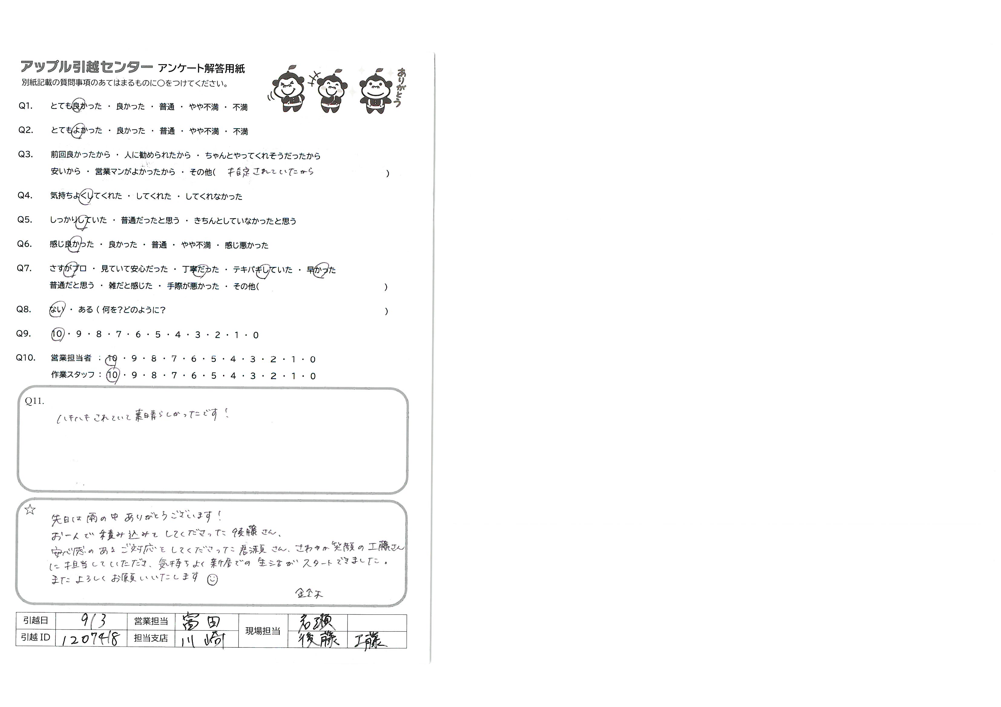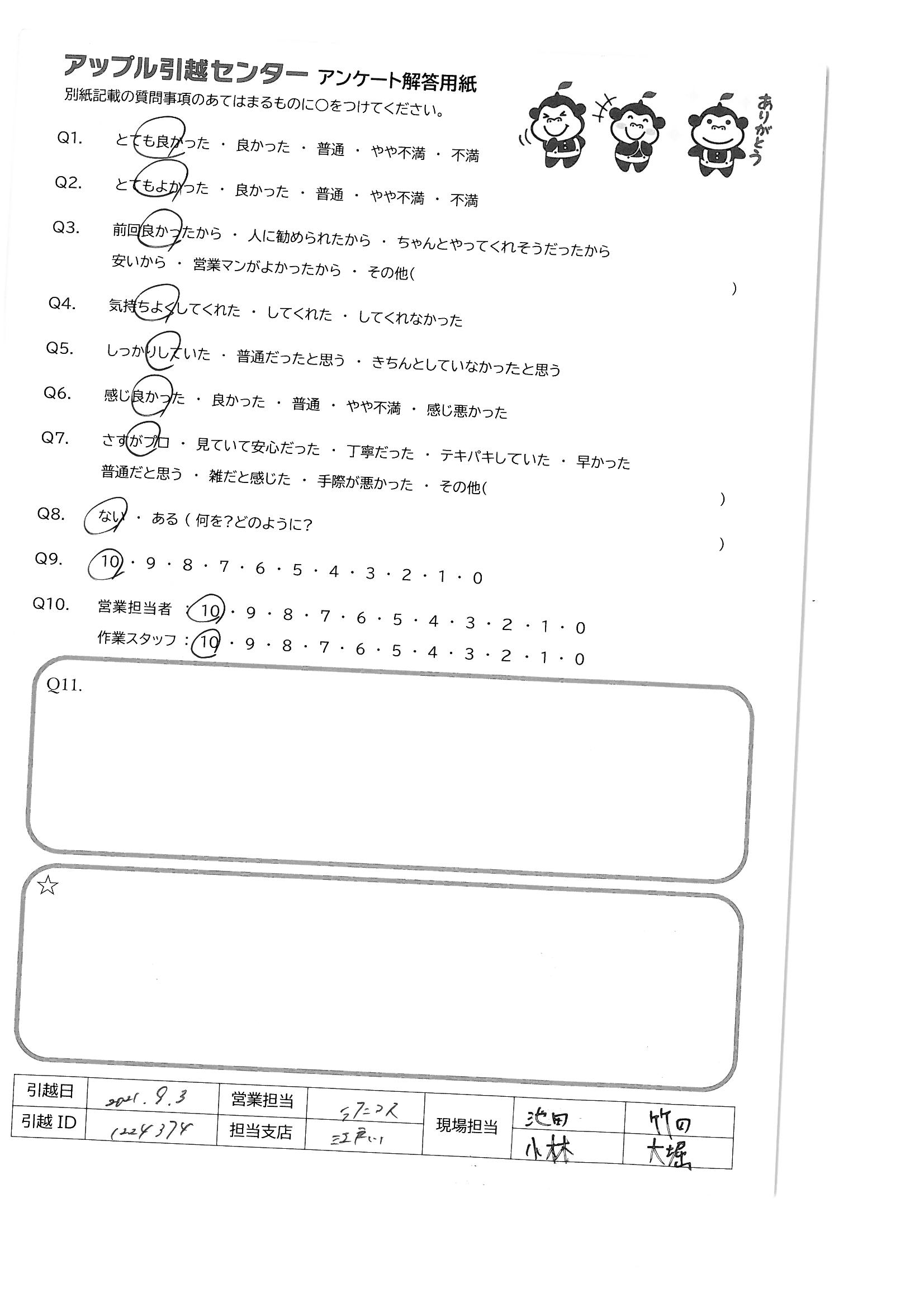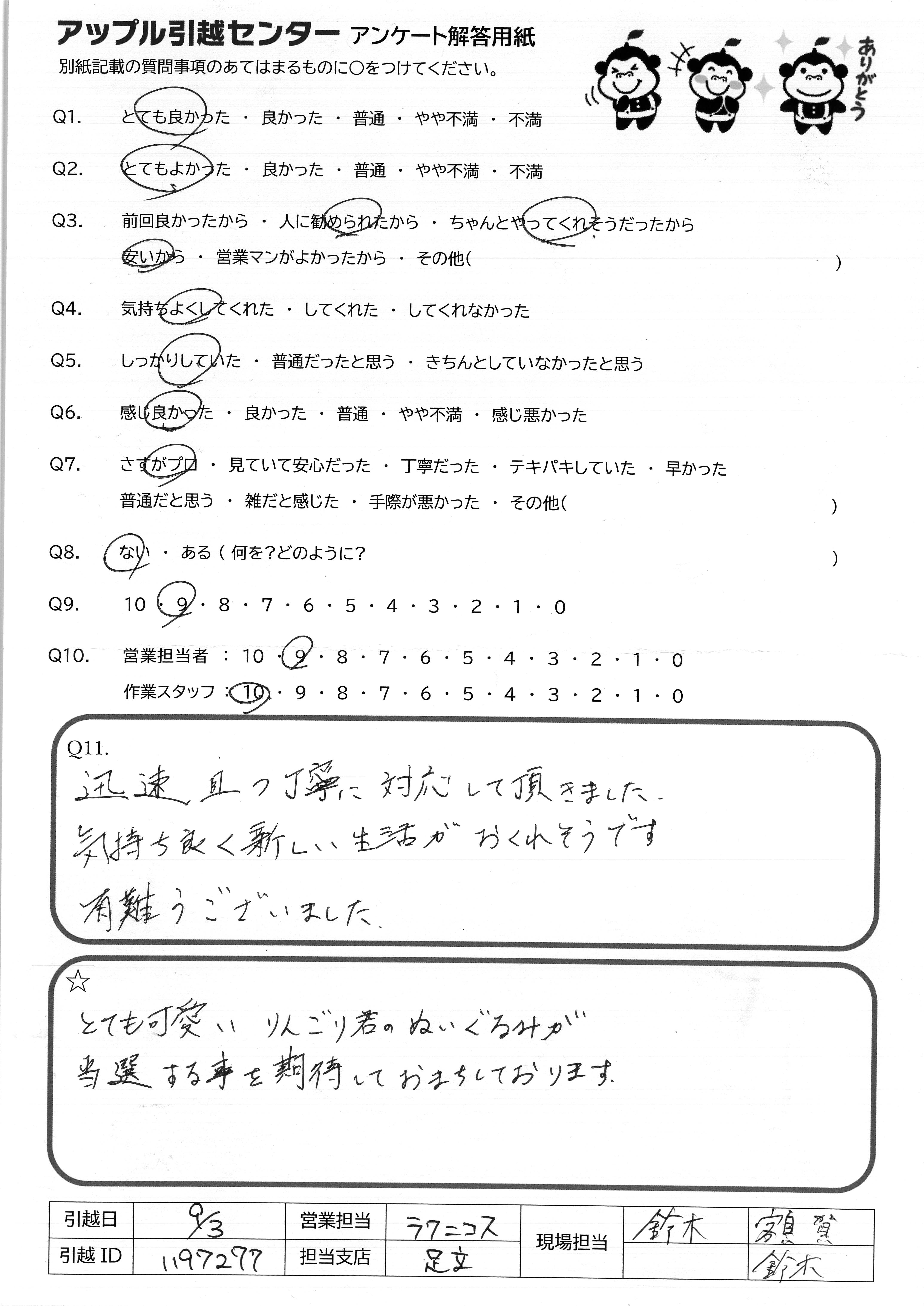 A.先日は雨の中ありがとうございます! お一人で積み込みをして下さった後藤さん、安心感のあるご対応をしてくださった君瀬さん、さわやか笑顔の工藤さんに担当していただき、気持ち良く新居での生活がスタートできました。 またよろしくお願いいたします 鈴木