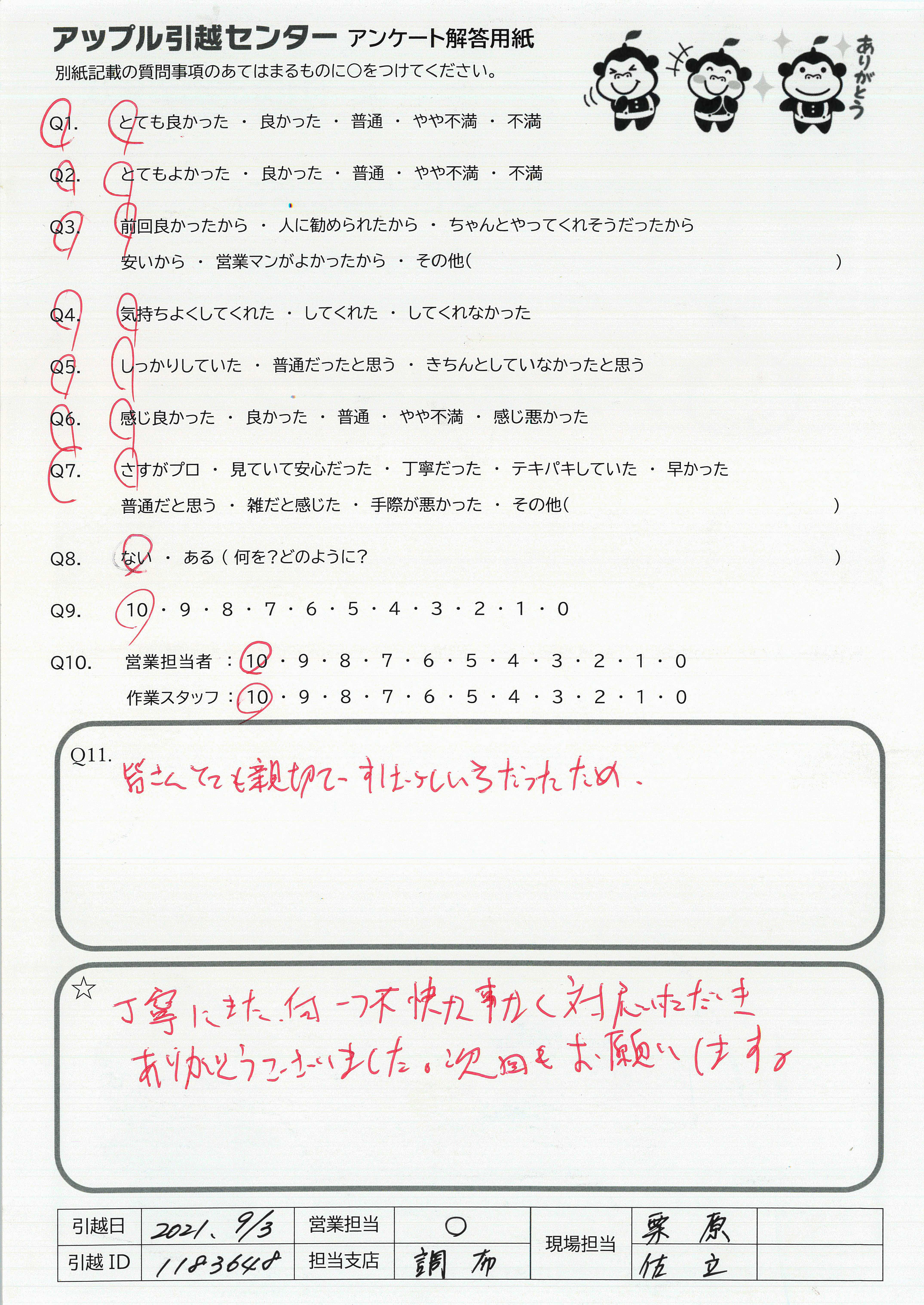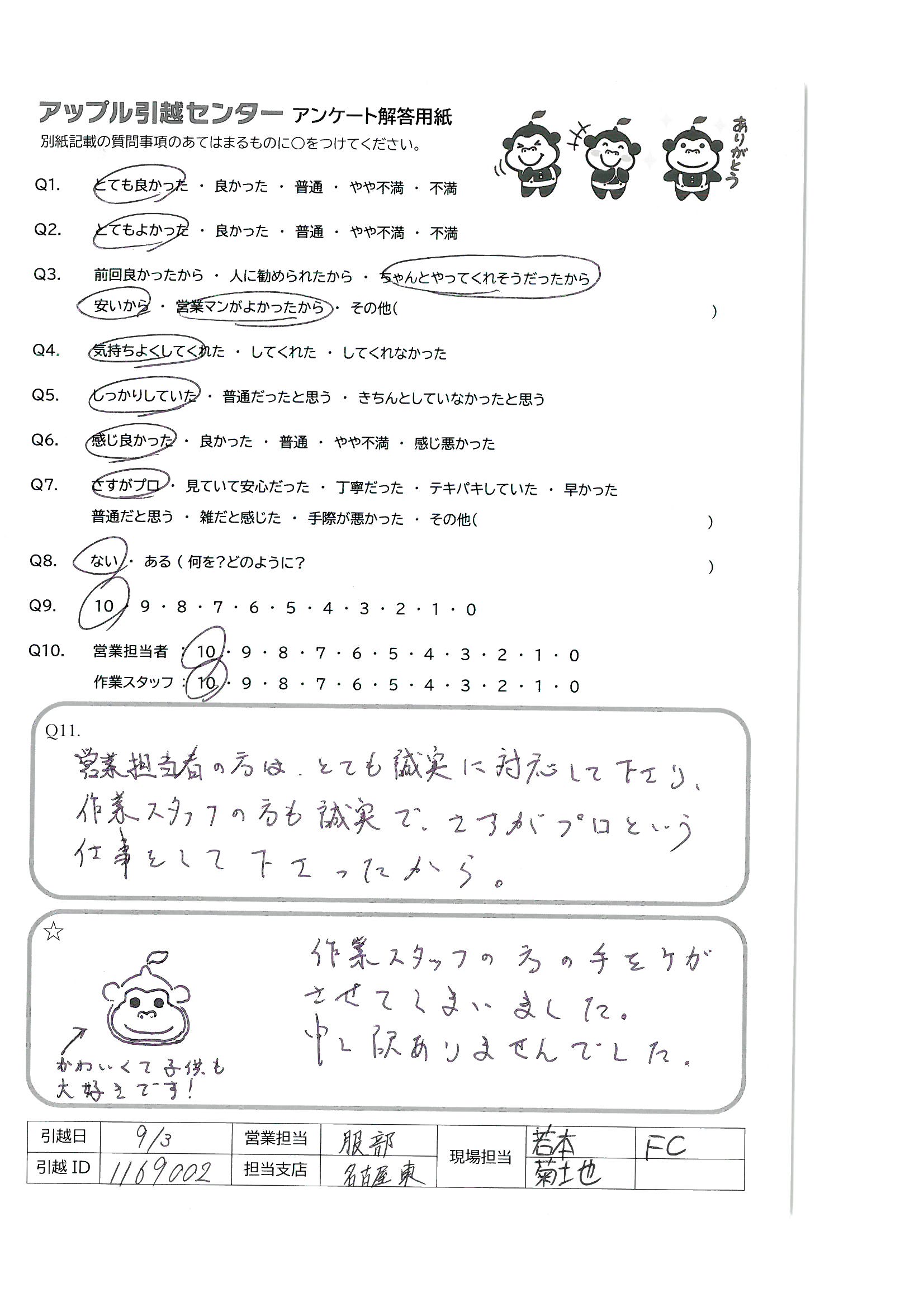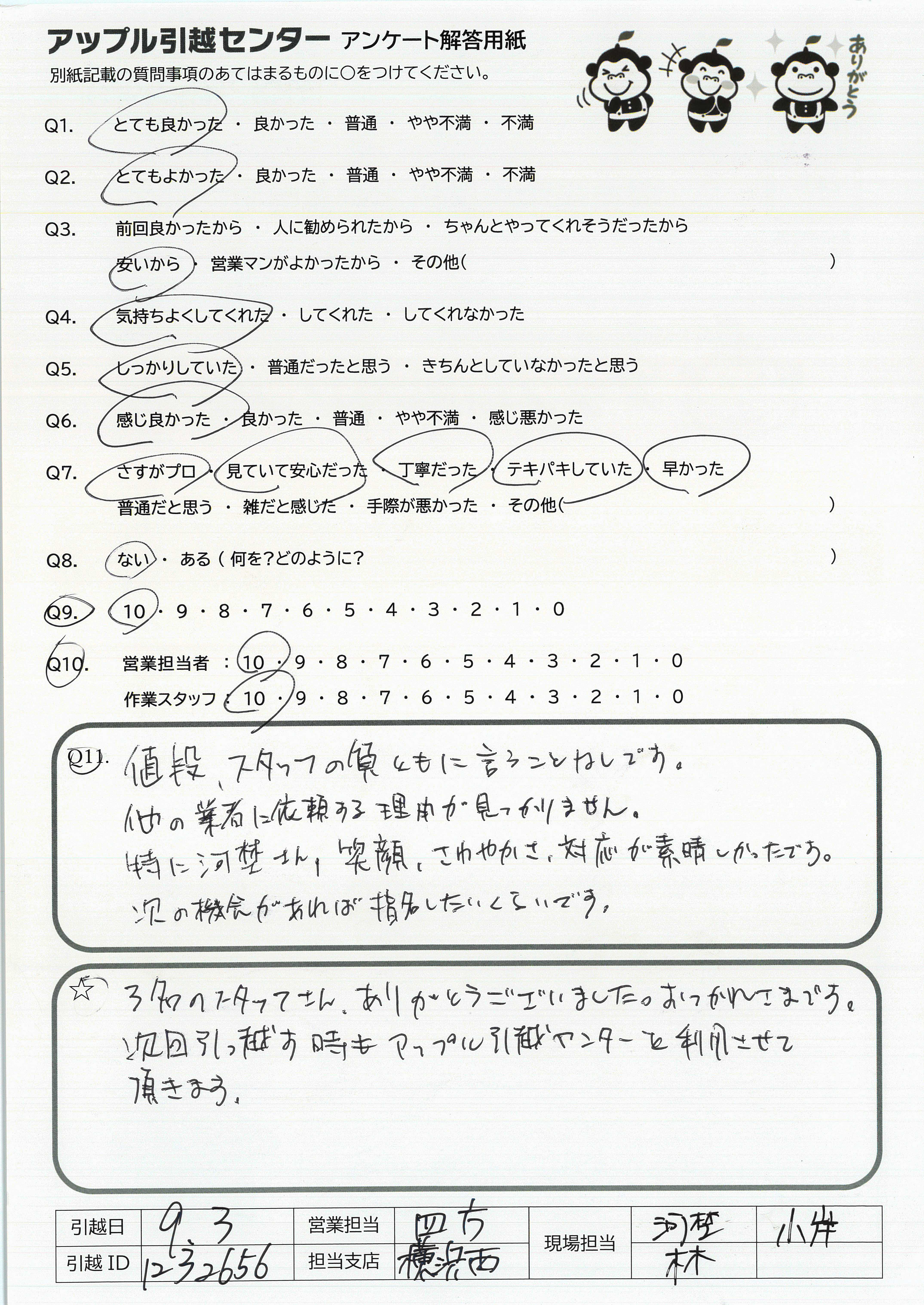 A.先日は雨の中ありがとうございます! お一人で積み込みをして下さった後藤さん、安心感のあるご対応をしてくださった君瀬さん、さわやか笑顔の工藤さんに担当していただき、気持ち良く新居での生活がスタートできました。 またよろしくお願いいたします 鈴木