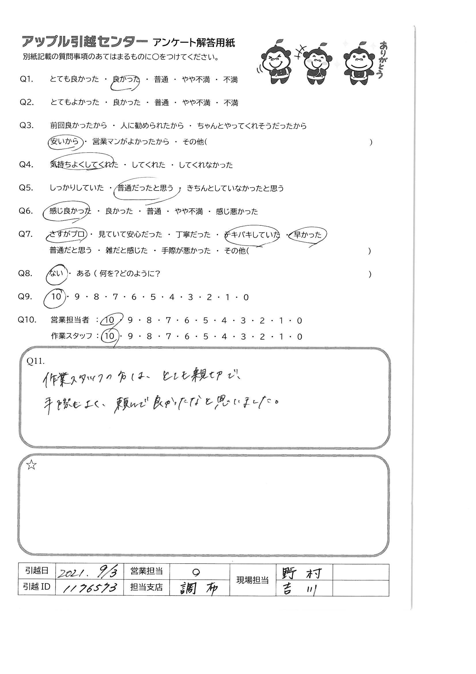 A.値段、スタッフの質ともに言うことなしです。他の業者に依頼する理由が見つかりません。 特に河埜さん、笑顔、さわやかさ、対応が素晴らしかったです。 次の機会があれば指名したいくらいです。