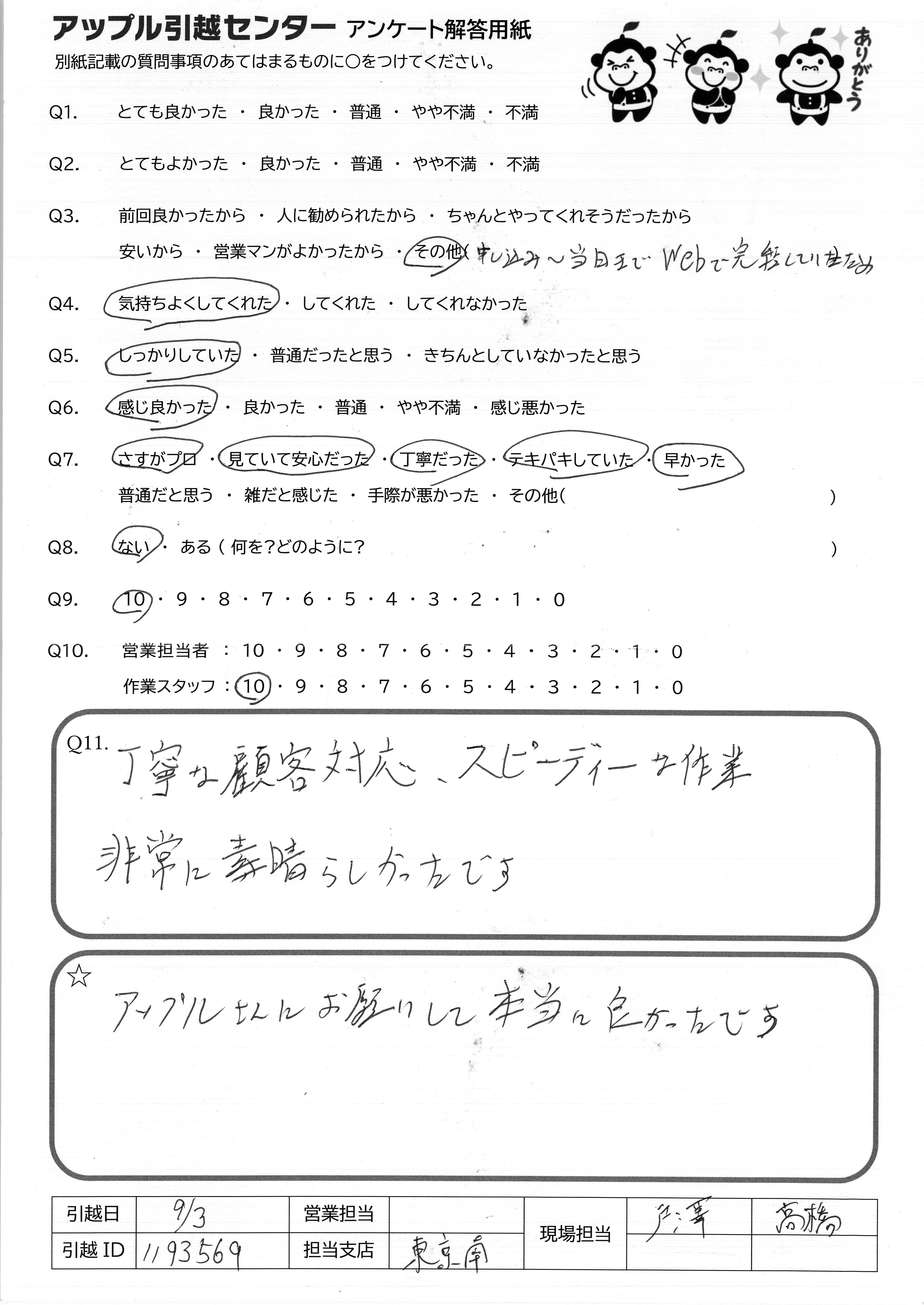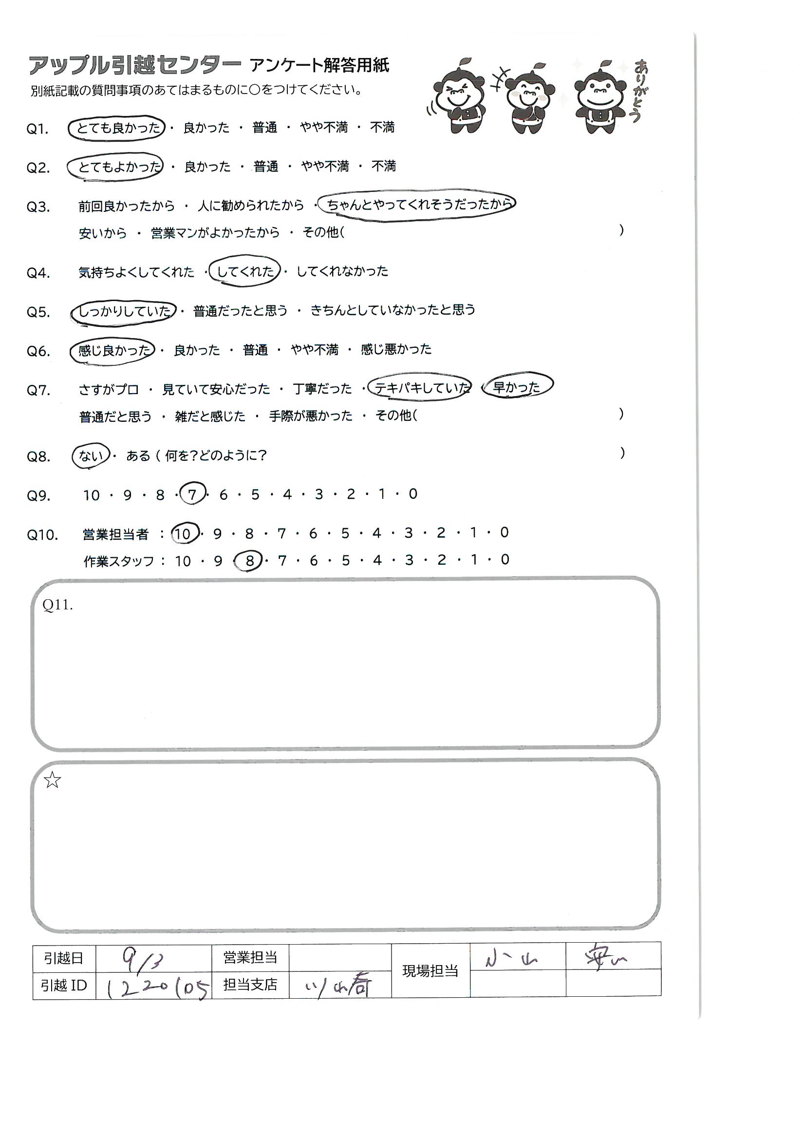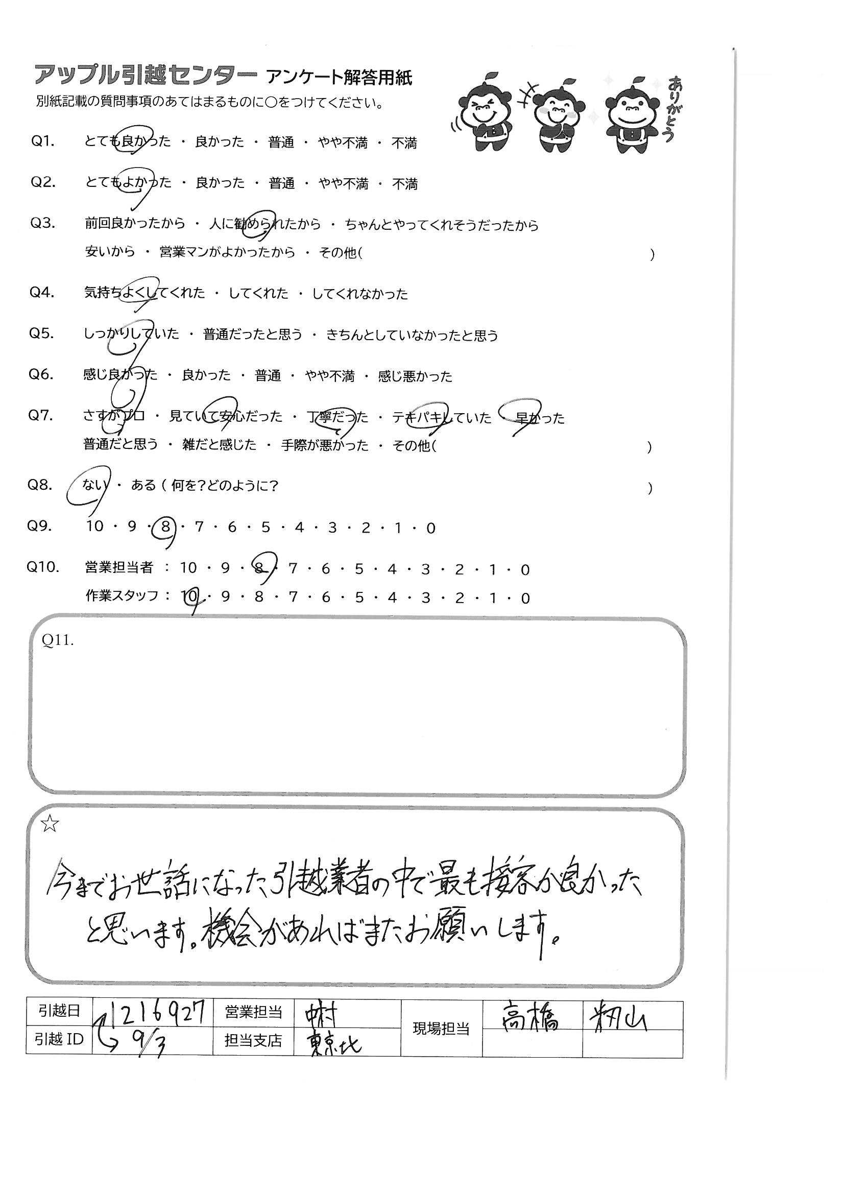A.今までお世話になった引越業者の中で最も接客が良かったと思います。機会があればまたお願いします。