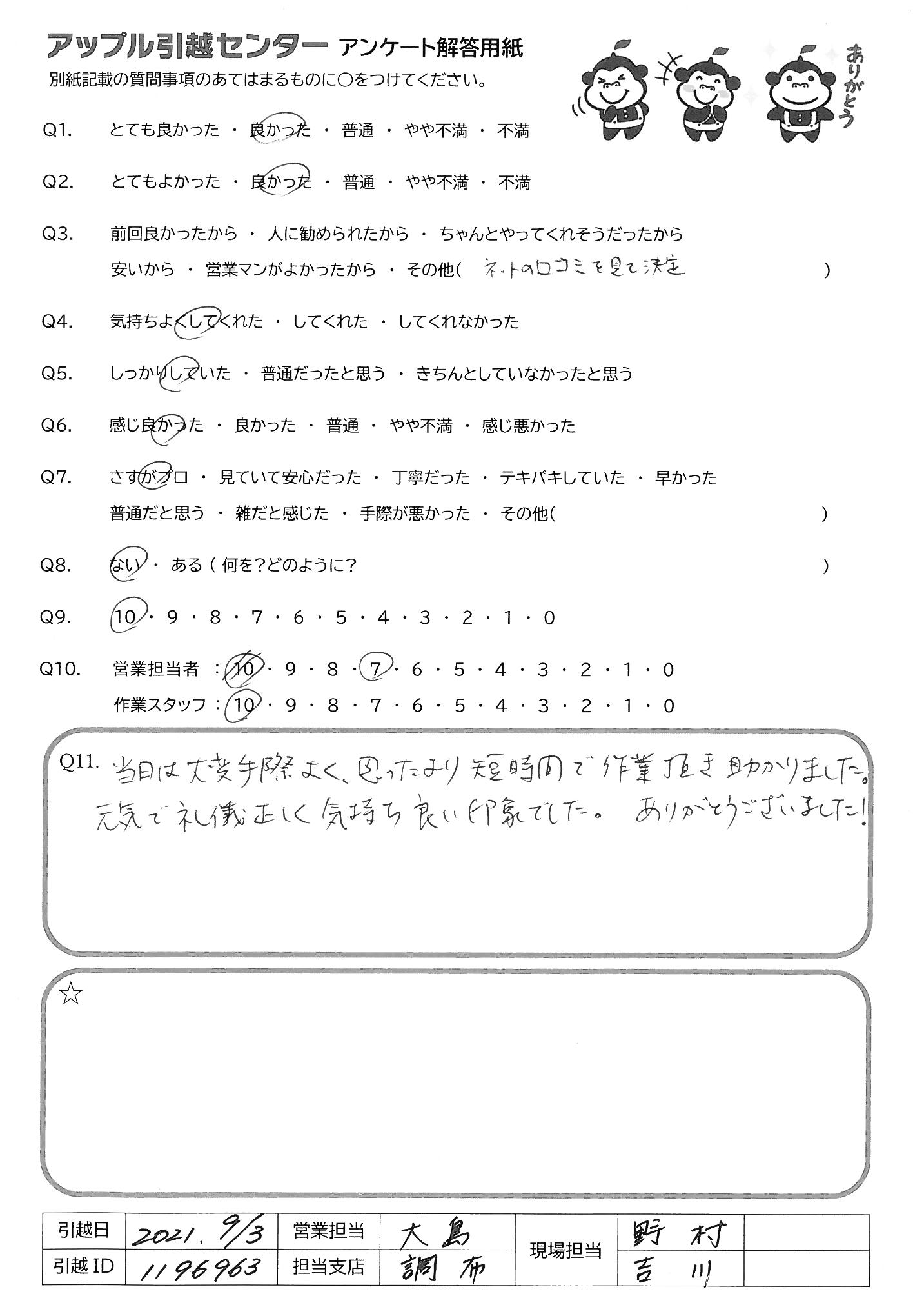 A.当日は大変手際よく、思ったより短時間で作業頂き助かりました。 元気で礼儀正しく気持ち良い印象でした。ありがとうございました!