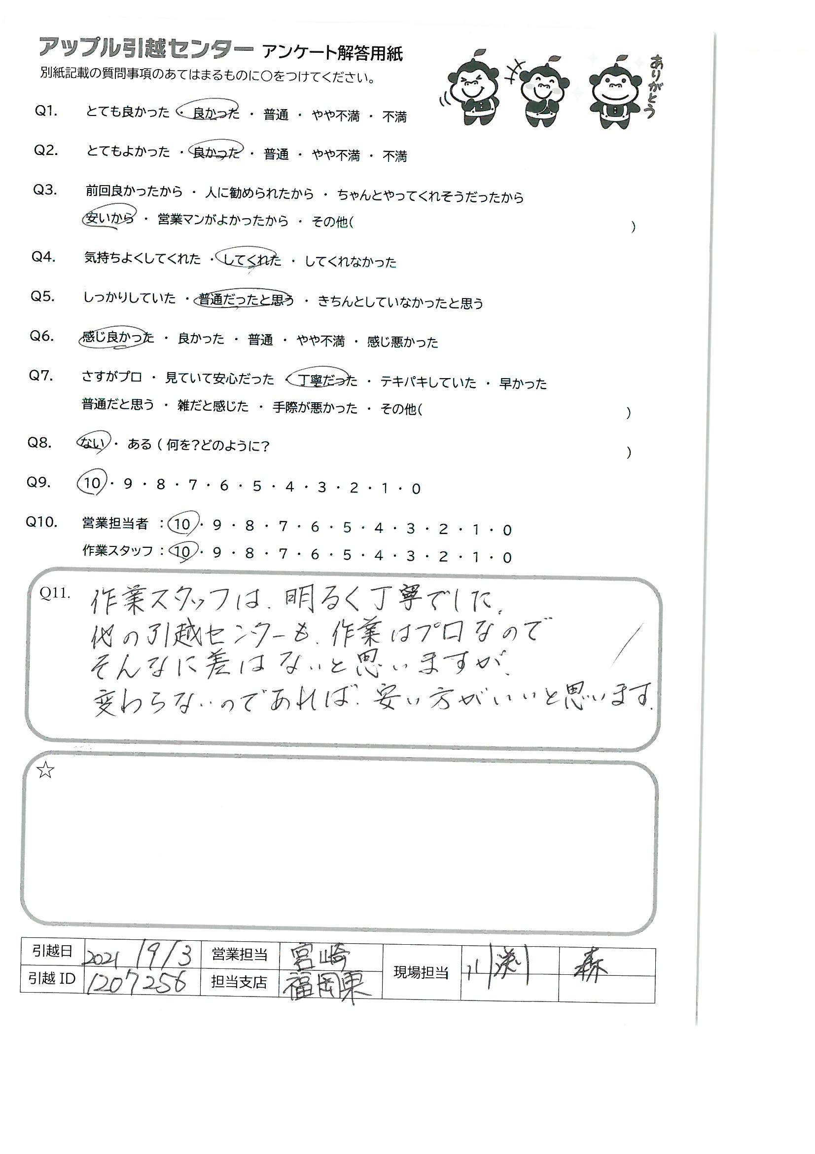 A.3名のスタッフさん、ありがとうございました。おつかれさまです。 次回引っ越す時もアップル引越センターを利用させて頂きます。