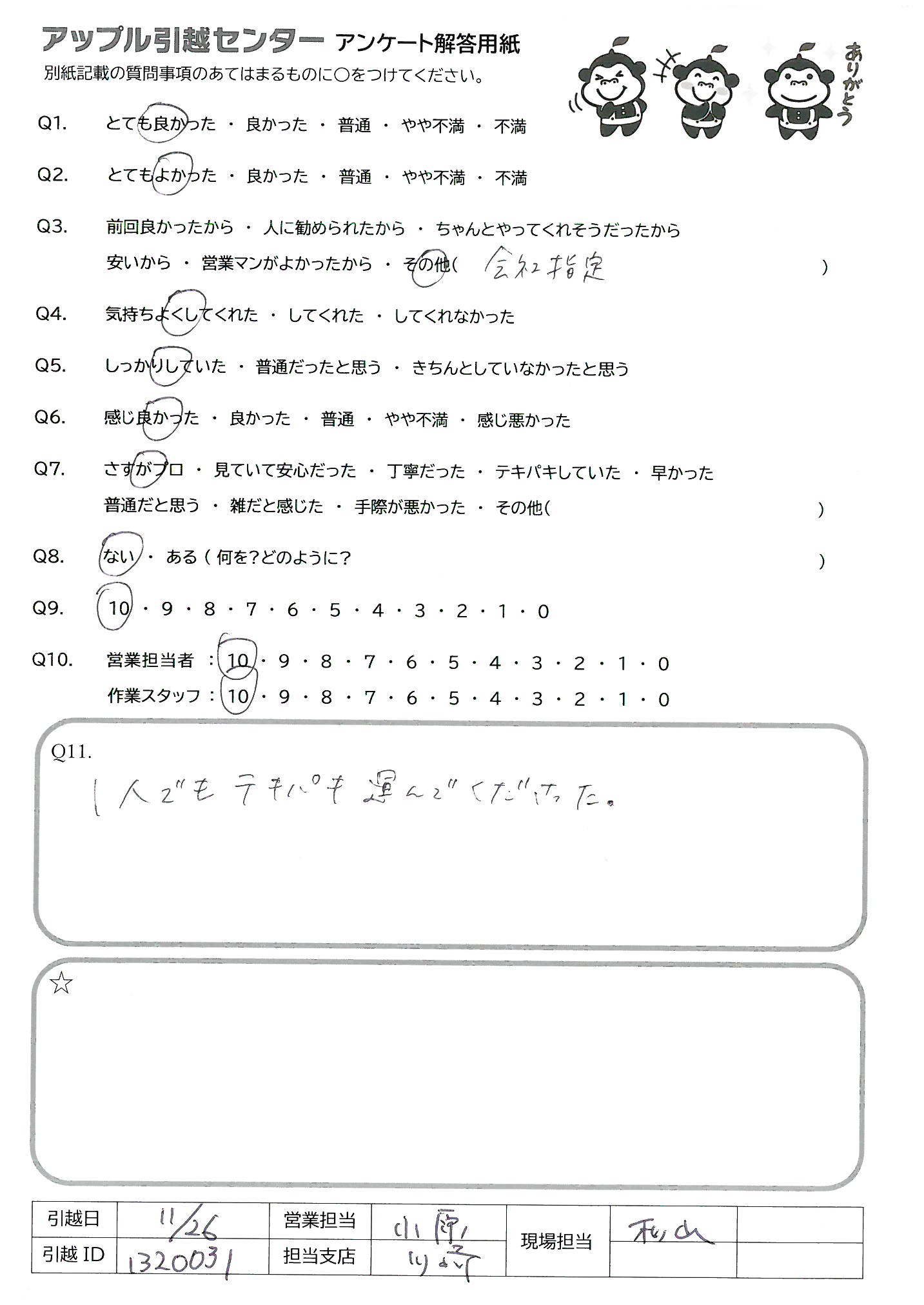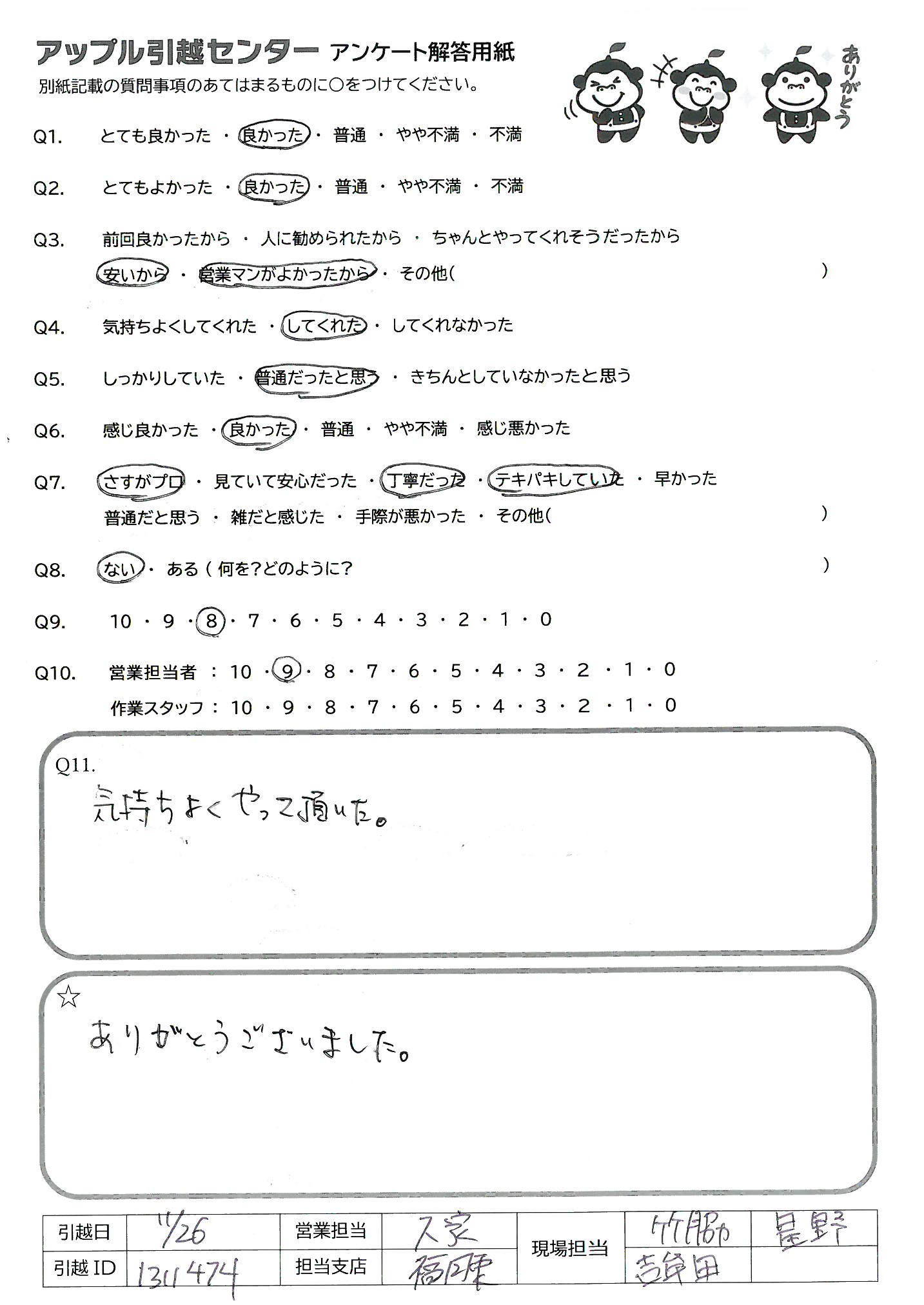 A.自分が担当していただいて、感じがすごく良く、作業もテキパキと丁寧にしていただいたため。階段を何度も上下したのに、嫌な顔一つせず作業して下さって、とてもありがたかったです。